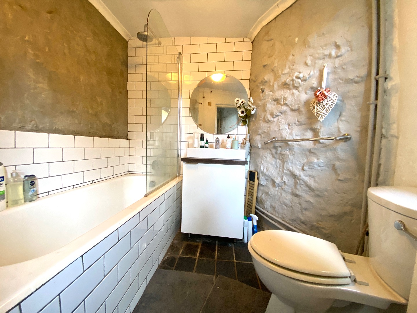 - 1 Bathroom with bath & overhead shower, Basin & WC.
