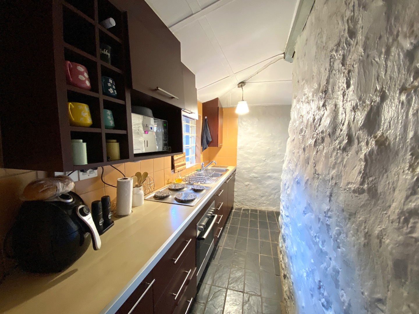 The interior carries through the same thatched roof charm and cottage pane windows, creating a sense of warmth and continuity with the main home. The open-plan living area is light and welcoming, flowing into a compact kitchen that’s both practical and inviting.