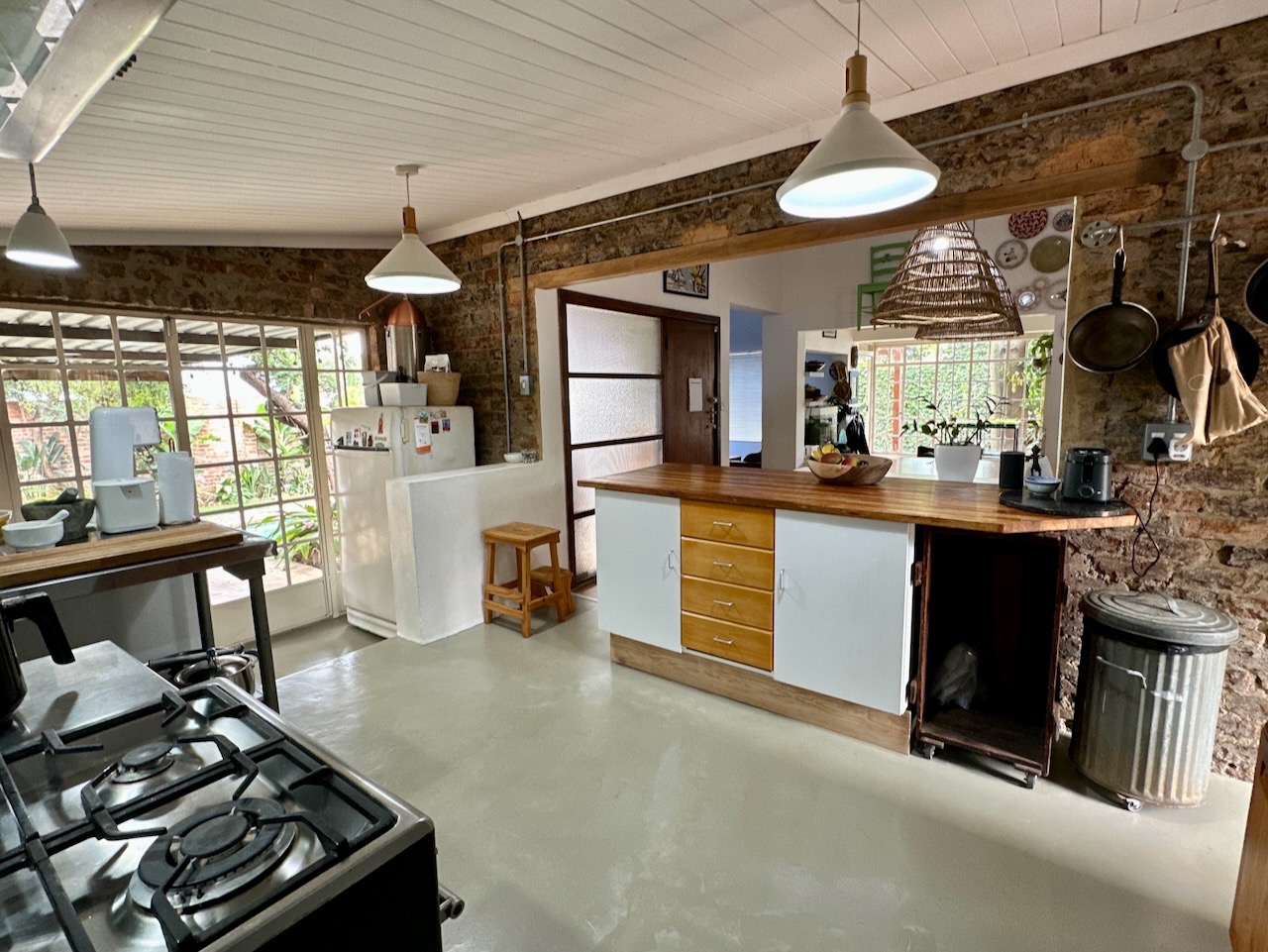 From the moment you arrive, the inviting sunny front stoep welcomes you, perfect for morning coffee or enjoying tranquil sunsets. Inside, the home is thoughtfully designed for comfortable family living, featuring three well-proportioned bedrooms and two and a half bathrooms, including a main en-suite with a walk-in cupboard and a separate guest toilet. The generous dining area is perfect for family gatherings, complemented by a separate lounge with a cosy fireplace for cooler evenings, and an additional family TV room for versatile living. The heart of the home is the farm-style industrial kitchen, which seamlessly connects to the outdoor entertainment area, making hosting effortless.