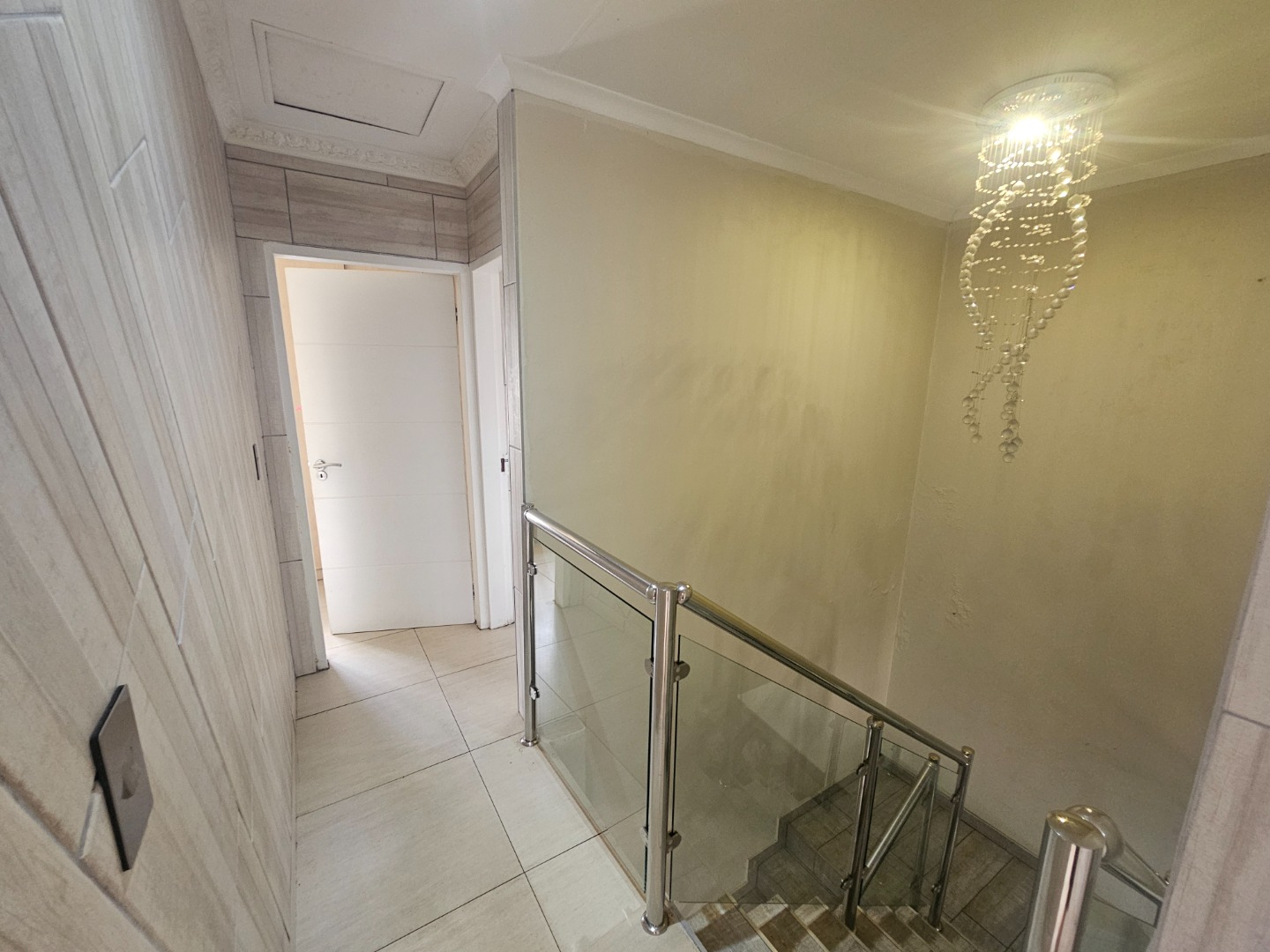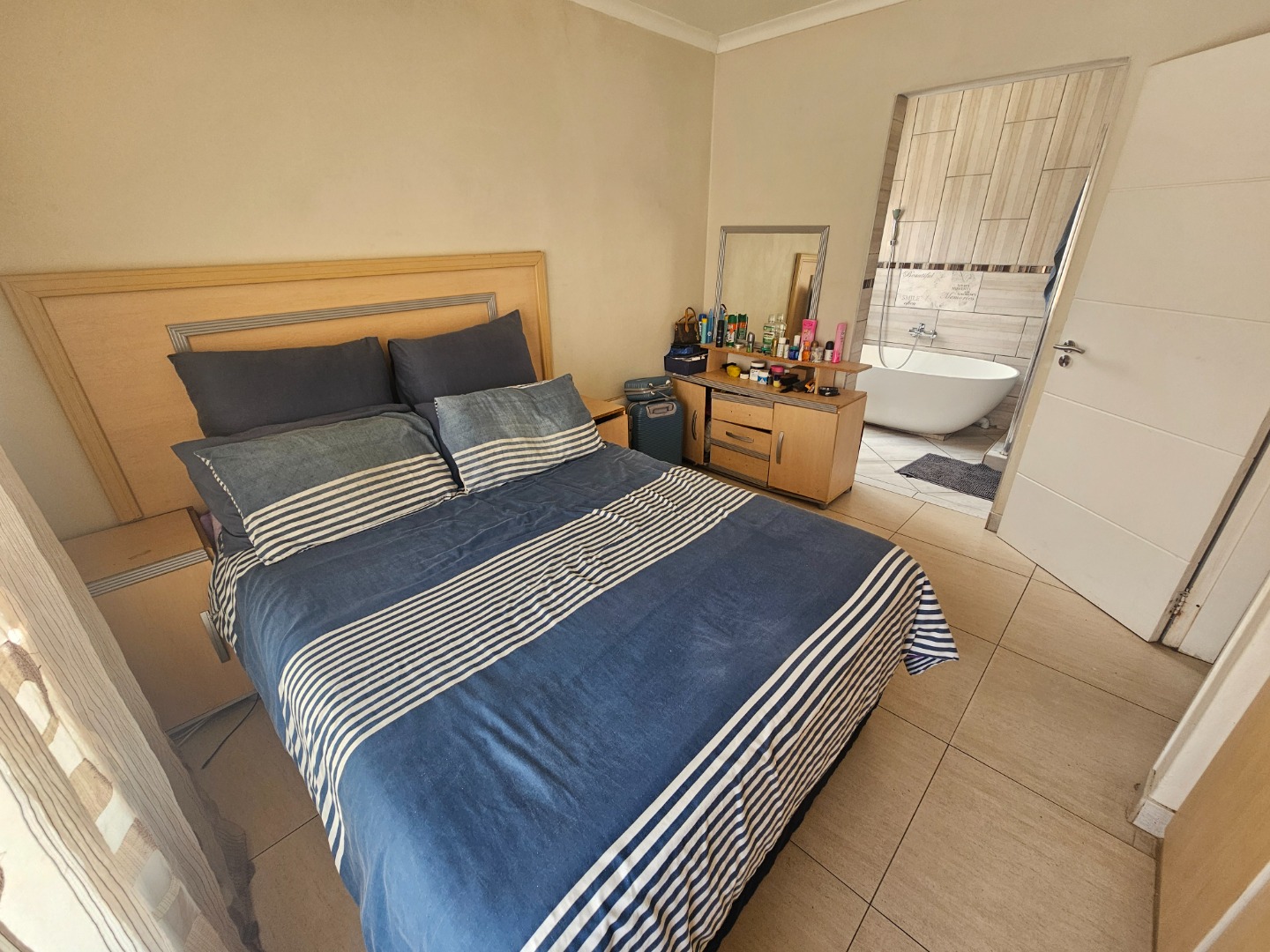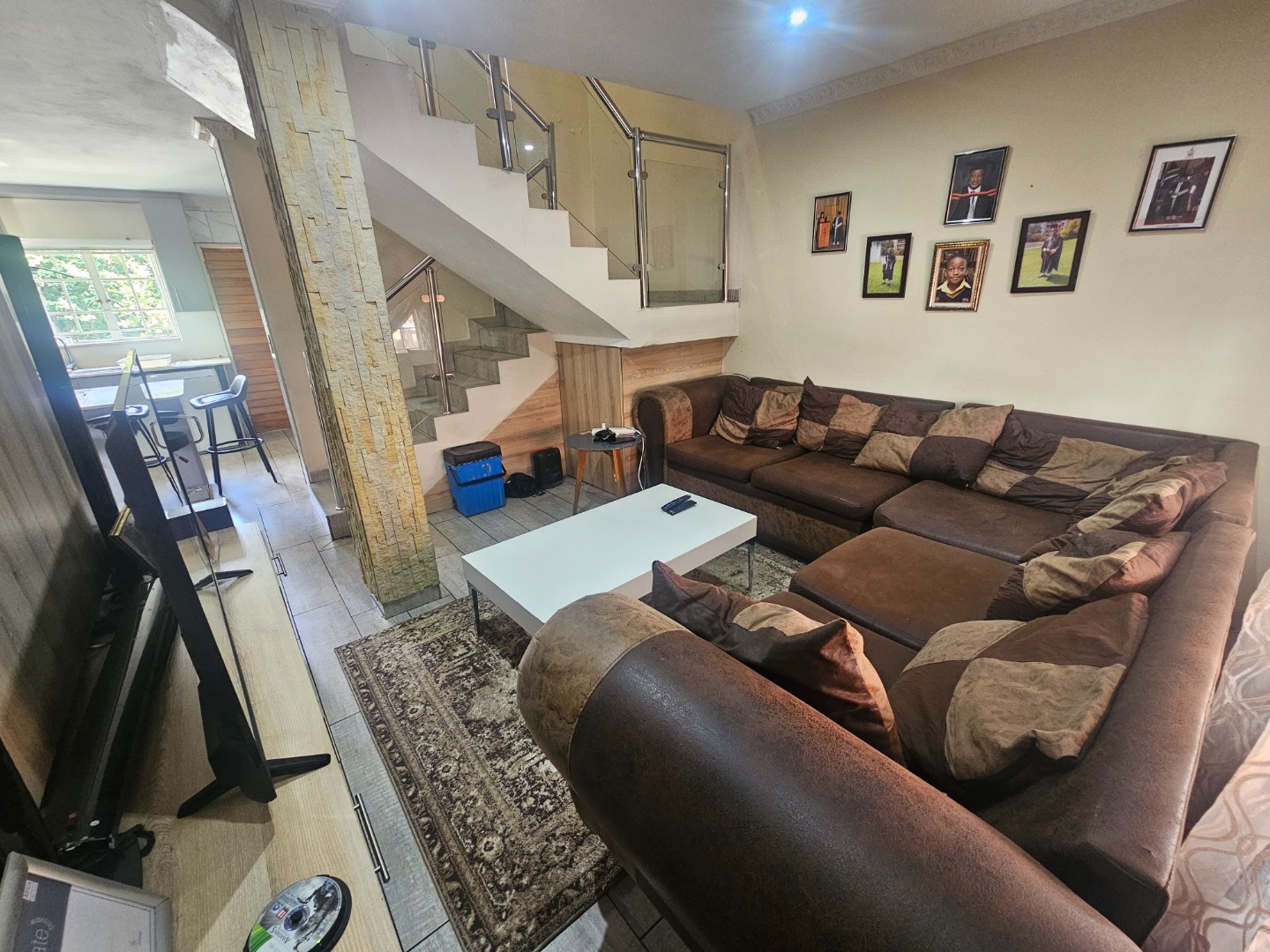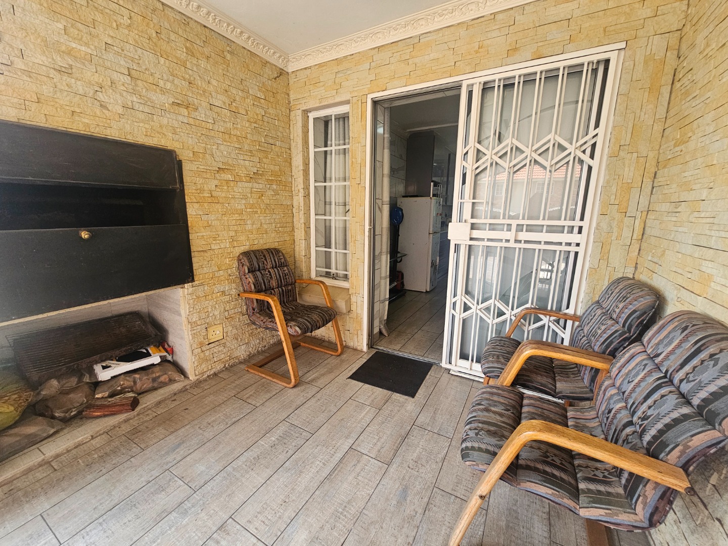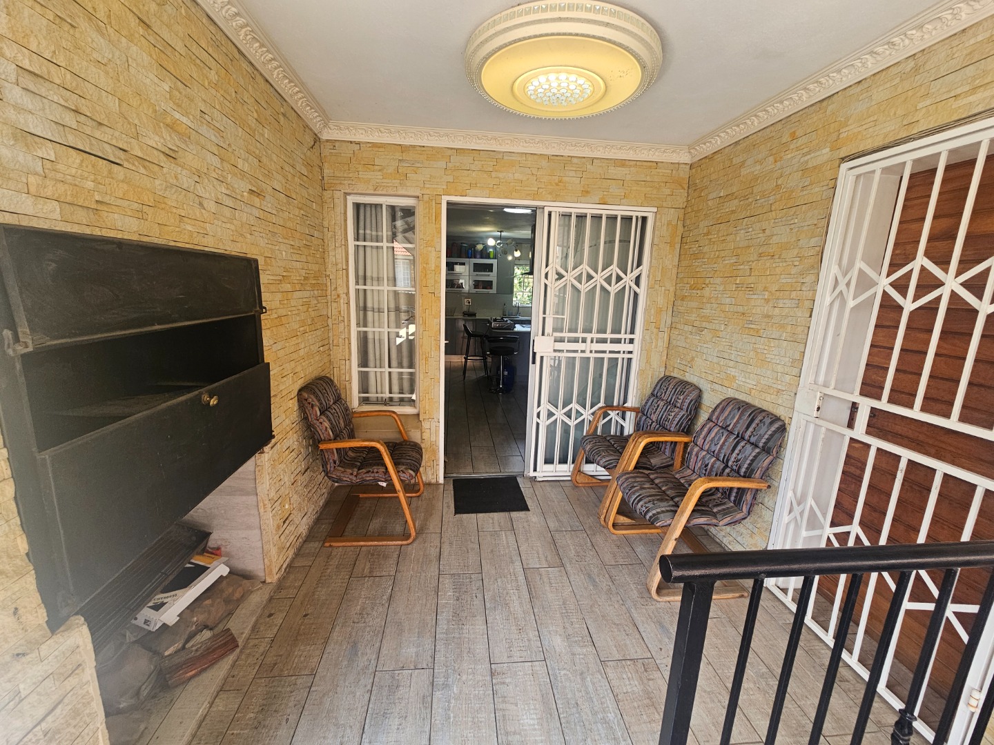 Location: Brooklands Security Estate. Layout: three bedrooms, with the master suite featuring a luxurious en-suite full bathroom. The two additional bedrooms share a stylish, well-appointed bathroom. On the ground floor there is a guest cloakroom, an open-plan kitchen with contemporary finishes described as chef-inspired, and a bright, inviting TV/family room. The outdoor space includes a private patio with a built-in braai, ideal for seamless indoor-outdoor entertaining. Parking consists of two undercover bays immediately adjacent to the unit for convenience and security.