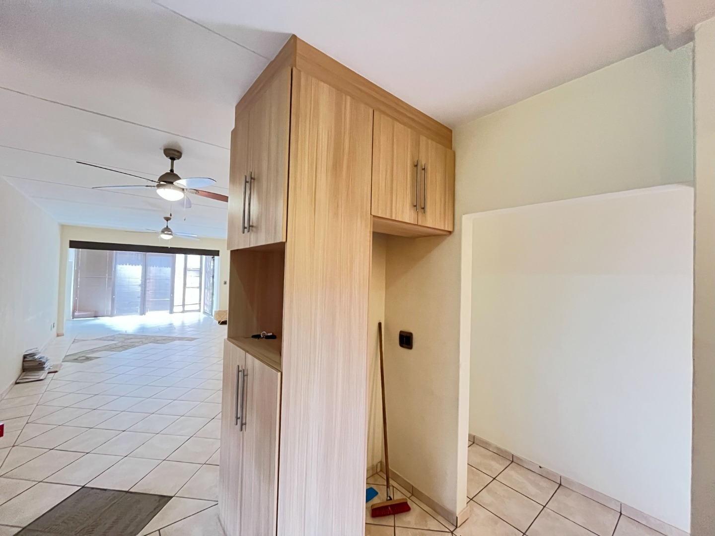 Discover this inviting two-bedroom, one-bathroom apartment situated within a well-established complex in Lyttelton Manor, Centurion. Spanning 102 square metres, this residence offers a practical layout designed for comfortable living. The modern kitchen is a highlight, featuring sleek light wood-grain cabinetry, dark countertops, a gas hob with an extractor fan, and a convenient double sink. Ample storage is provided, including illuminated glass-front upper cabinets, creating an appealing and functional space for culinary enthusiasts. The open-plan living and dining areas are fitted with tiled flooring that needs some TLC with ceiling fans ensuring comfort.