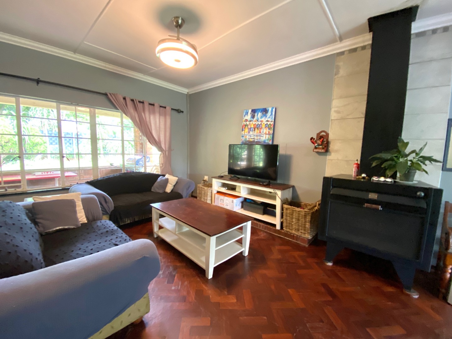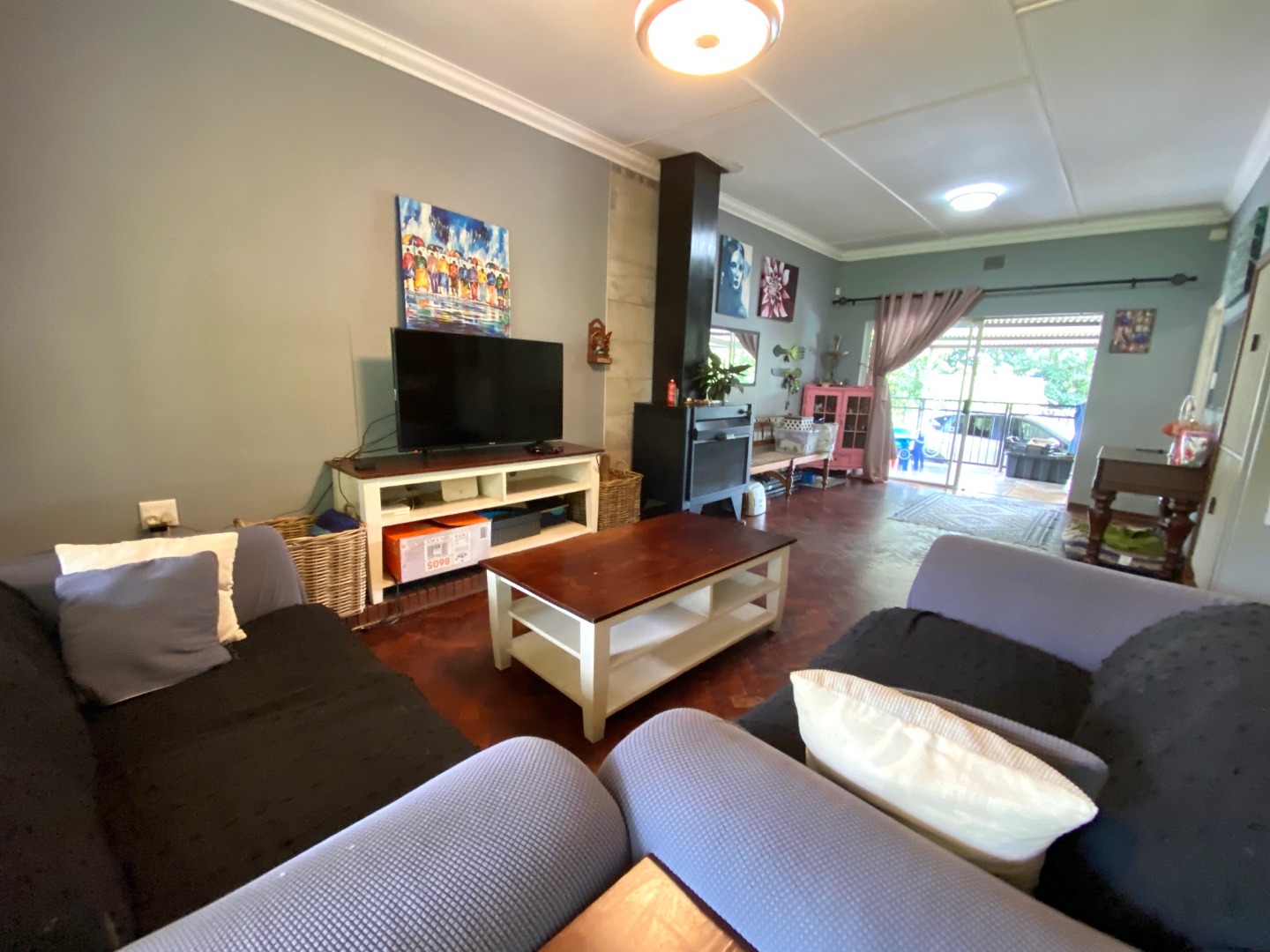 - Open plan design consisting of a dining area, family room with large woodburning fireplace and living area that leads to a small outside patio