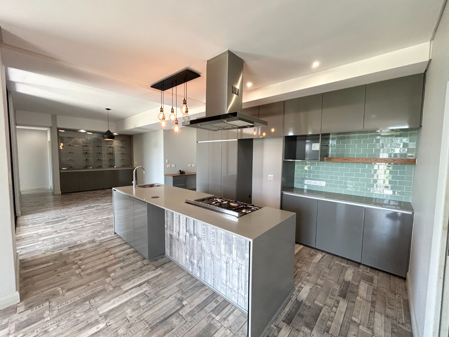 At the heart of the home lies a modern open-plan kitchen, boasting sleek grey cabinetry, a generous central island with an integrated gas hob, and a chic light blue subway-tiled backsplash. Industrial pendant lighting enhances the elegant wood-look flooring, which ties the living areas together beautifully.