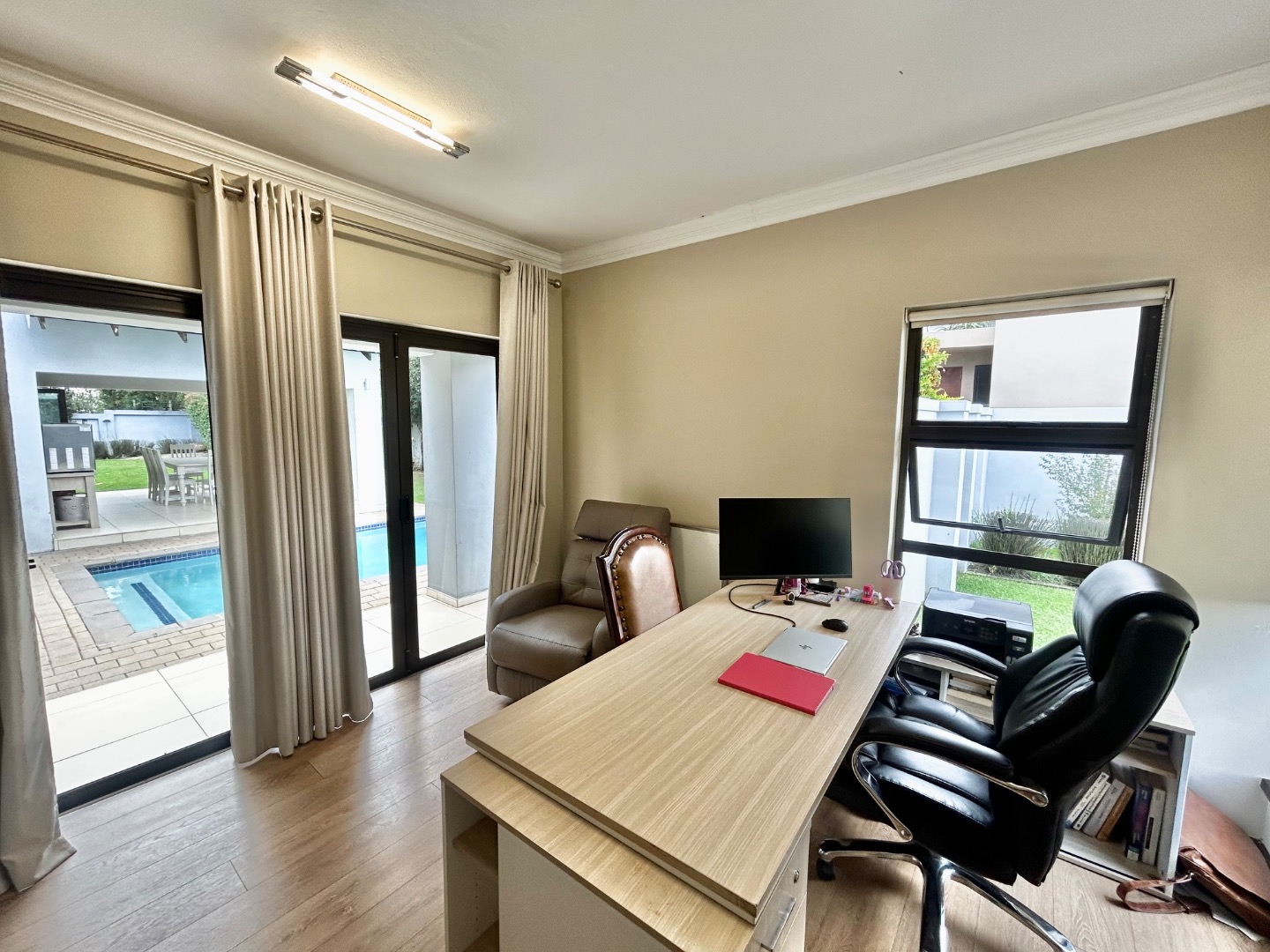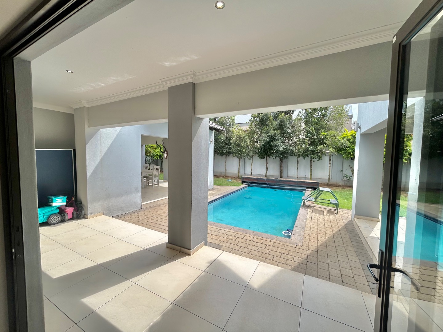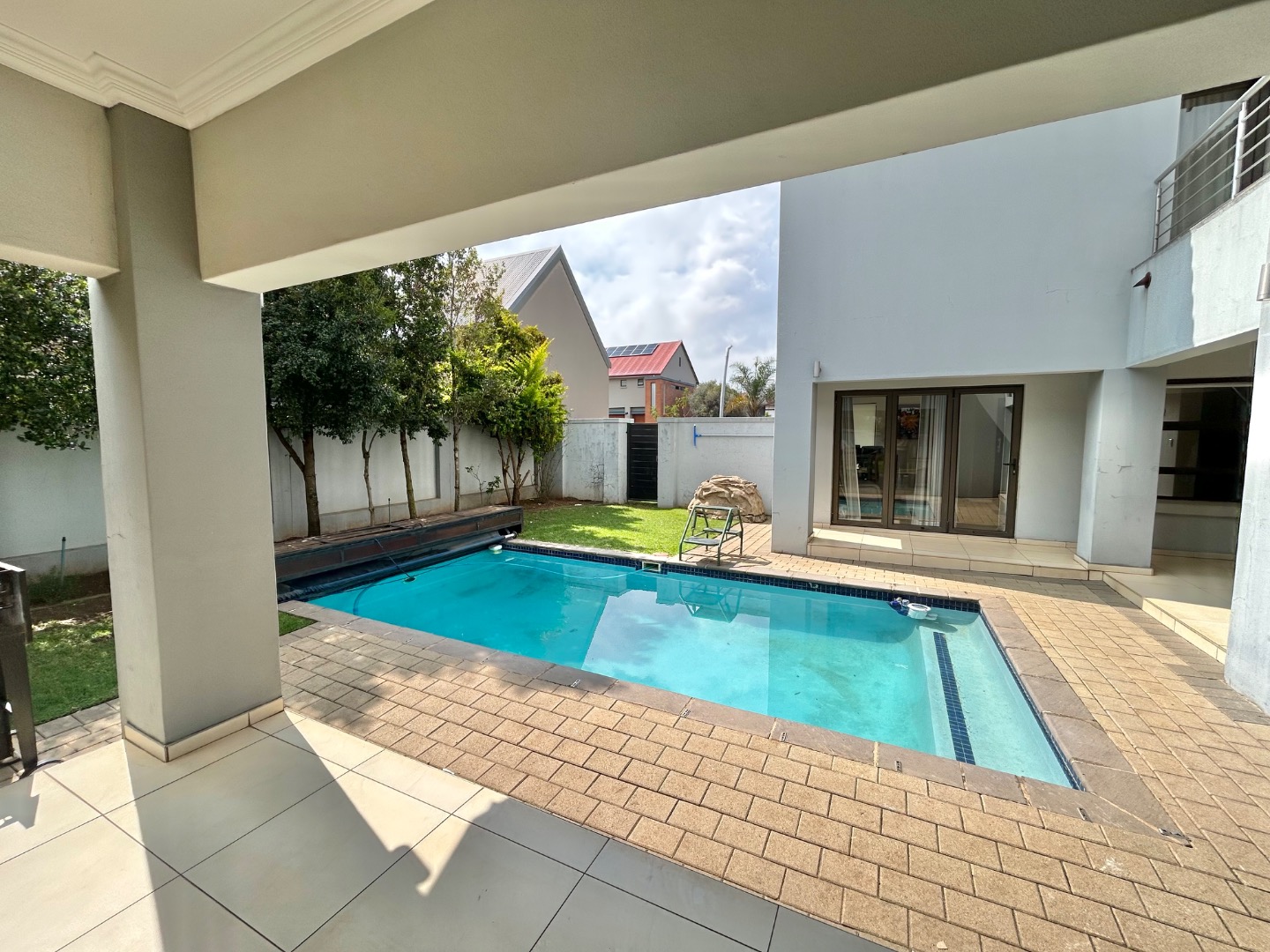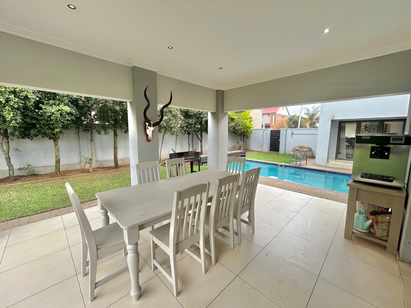 - Covered patio overlooking the pool and landscaped garden