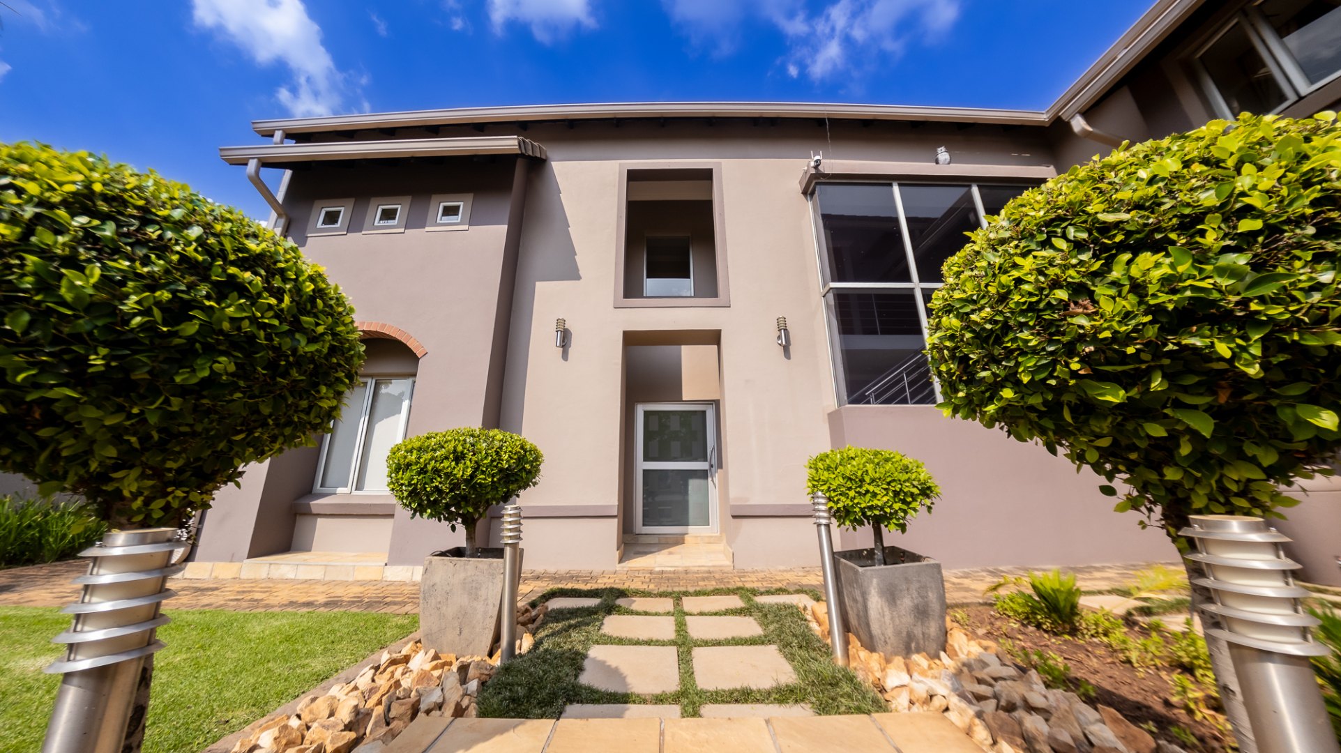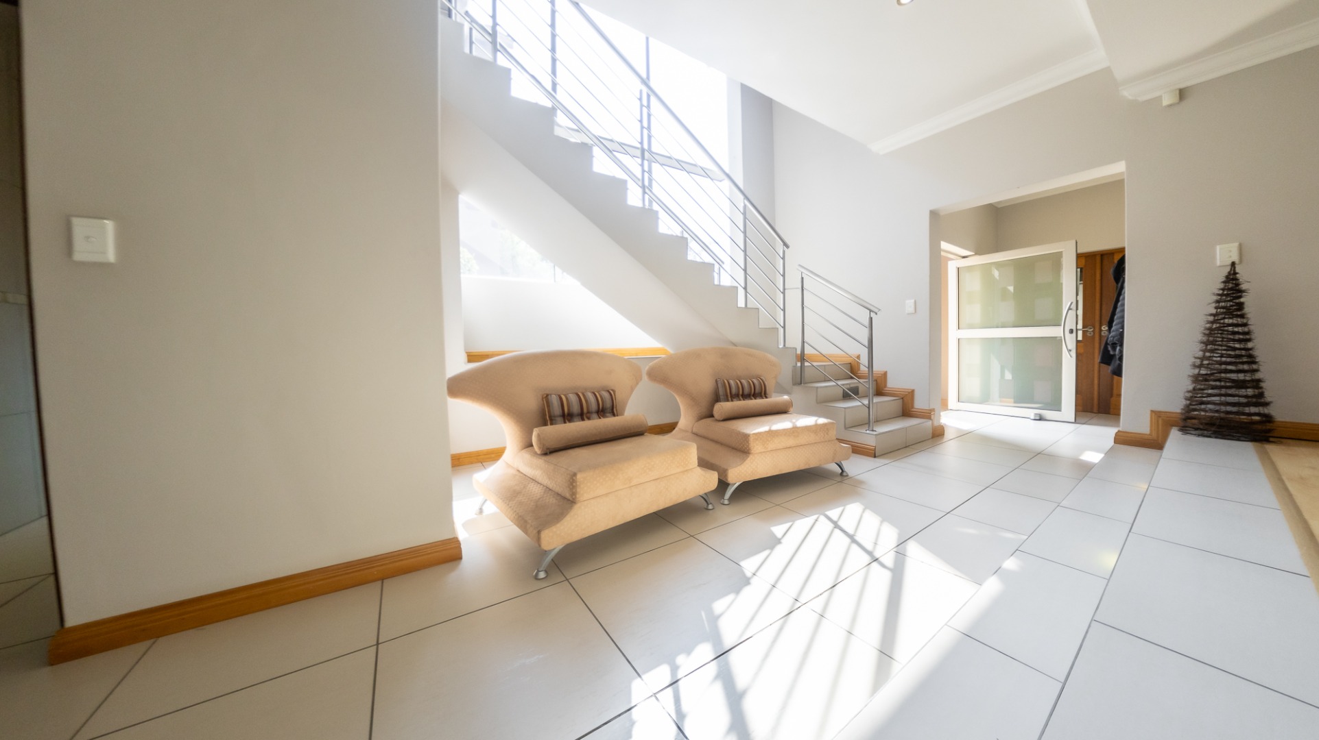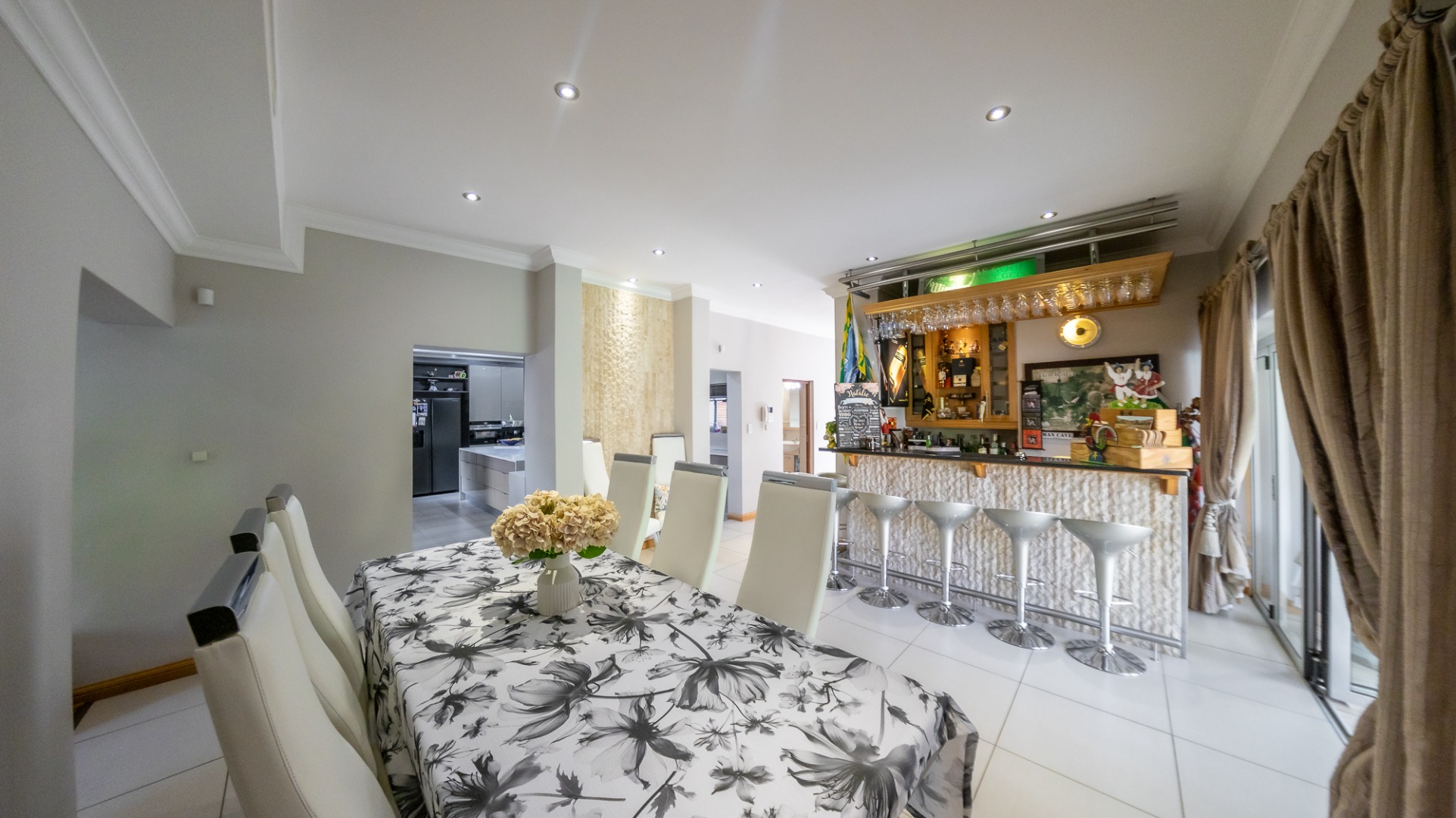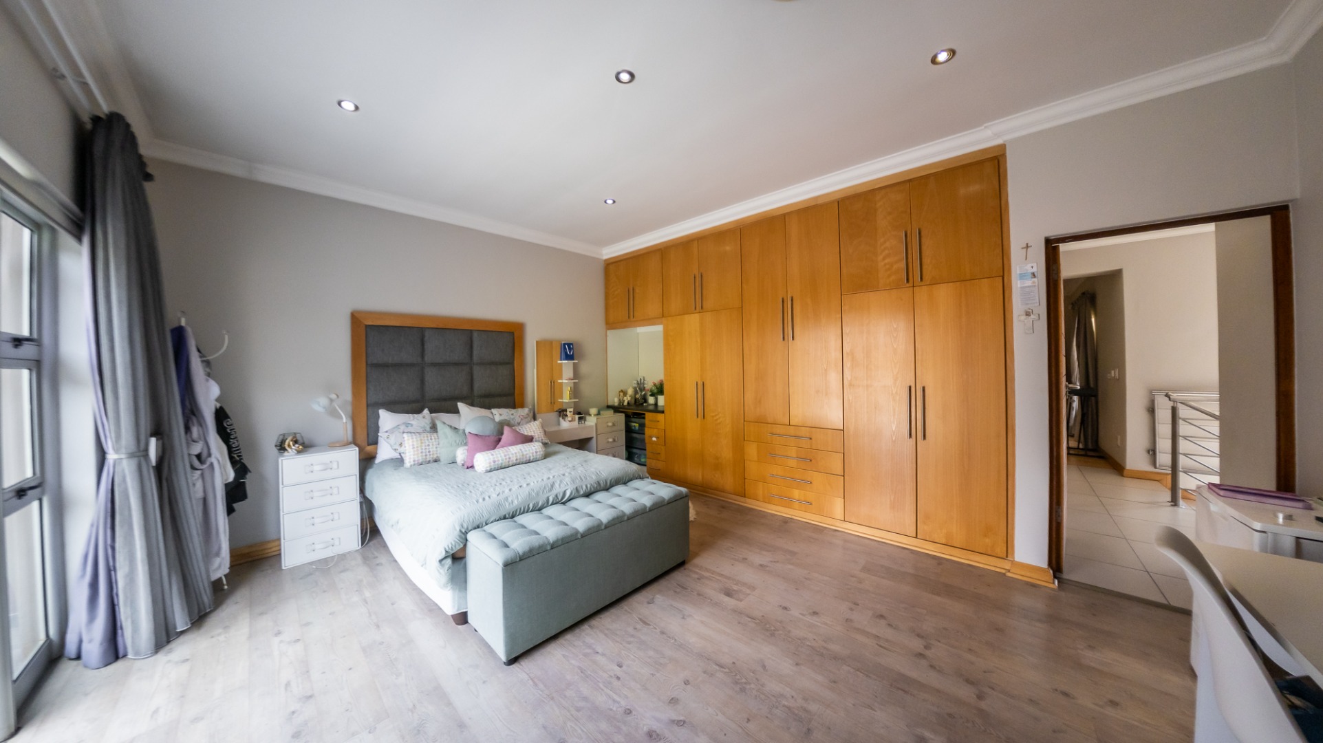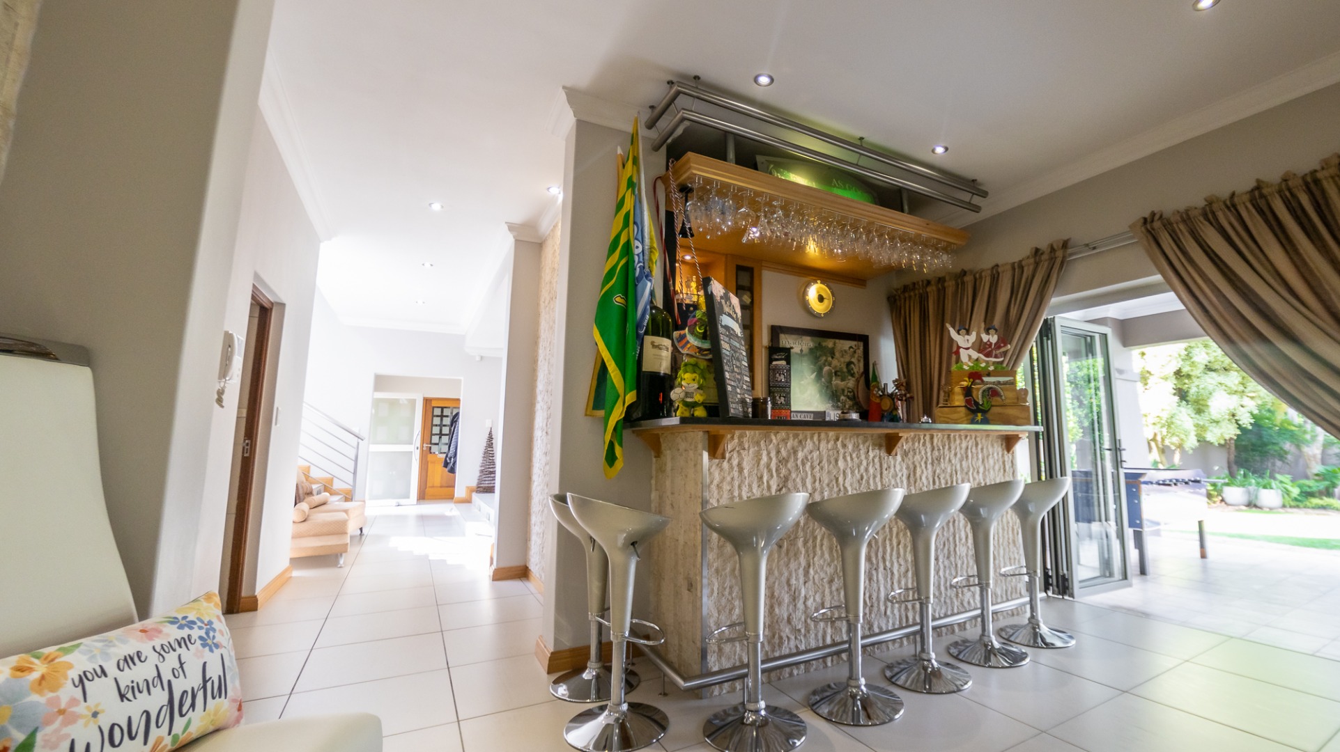 Discover this impressive multi-level contemporary residence nestled within the secure and sought-after Midstream Estate in Centurion, South Africa. Boasting a generous 589 sqm under roof on an 1114 sqm erf, this property immediately captivates with its modern aesthetic, integrated double garage, and expansive paved driveway, offering excellent curb appeal and ample parking. Step inside to a bright and spacious interior, characterized by an open-plan design, high ceilings, and abundant natural light filtering through large windows. The home features three distinct lounge areas and a dedicated dining room, providing versatile spaces for relaxation and entertaining. Modern recessed lighting, clean wood laminate and tiled flooring, and a contemporary staircase with sleek metal railings enhance the sophisticated ambiance. A notable highlight is the well-equipped home bar, perfect for social gatherings, complemented by a cozy fireplace for cooler evenings. This residence offers four comfortable bedrooms and three and a half bathrooms, including two en-suite facilities and a convenient guest toilet. The bathrooms feature modern floating vanities and neutral-toned tiled surfaces, ensuring both style and functionality. A dedicated study provides an ideal space for work or quiet contemplation. Outdoor living is equally impressive, with a private swimming pool set within a large, well-maintained lawn, offering a serene escape. A covered patio provides an ideal spot for al fresco dining and entertaining, while an upper-level balcony extends the outdoor enjoyment. The property also benefits from three garages, staff quarters, and a garden. Security is paramount within this eco-estate and gated community, featuring 24-hour security, a security post, access gates, and electric fencing, ensuring peace of mind. Modern conveniences include air conditioning, a central vacuum system, solar geyser, and fibre connectivity, enhancing comfort and efficiency. Pets are allowed, making this a truly family-friendly environment. Midstream Estate is renowned for its secure, family-oriented lifestyle, offering residents access to a clubhouse and a vibrant community atmosphere within Centurion. Key Features: * 4 Bedrooms, 3.5 Bathrooms (2 En-suite) * 3 Lounges, 1 Dining Room, Study * Private Swimming Pool & Covered Patio * Dedicated Home Bar & Fireplace * 3 Garages & Ample Paved Parking * 24-Hour Security in Gated Eco-Estate * Air Conditioning, Solar Geyser, Fibre Connectivity * Staff Quarters & Garden