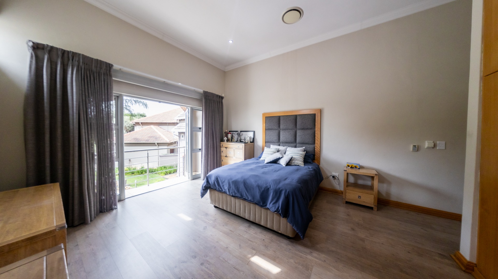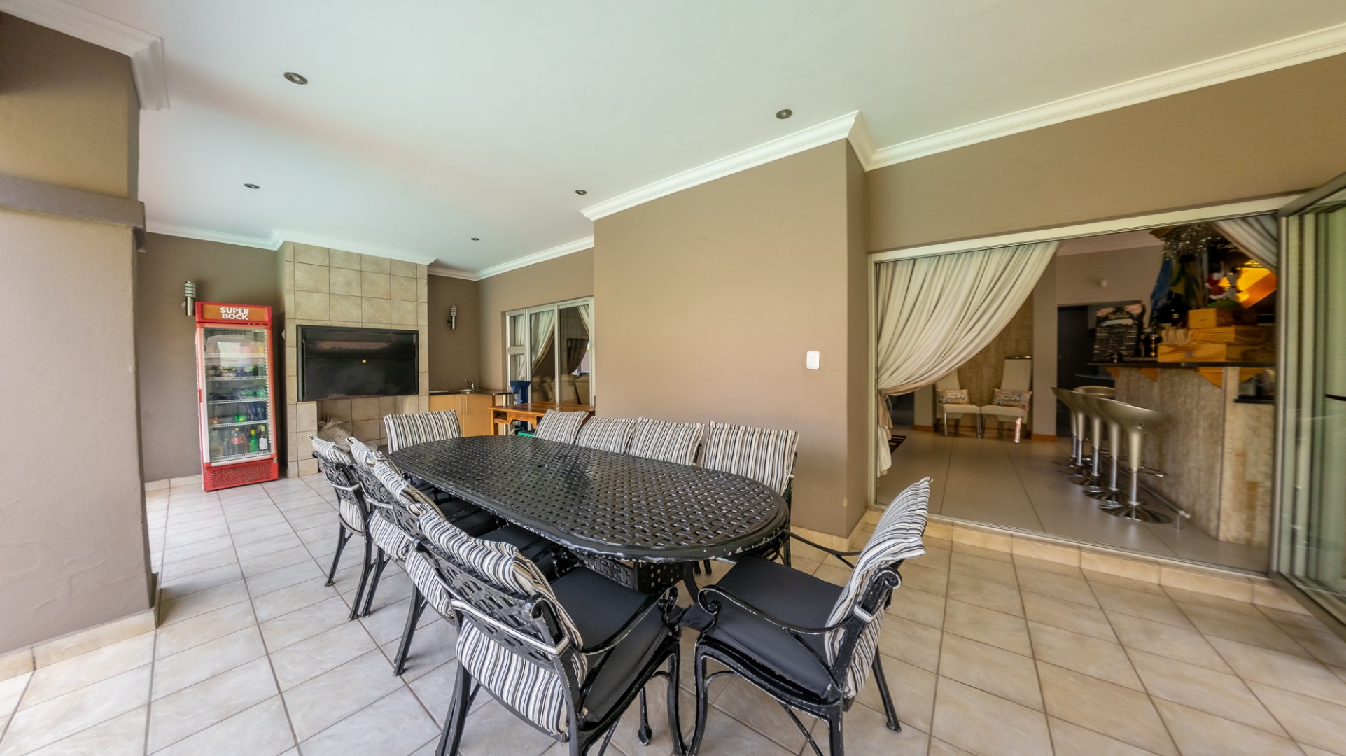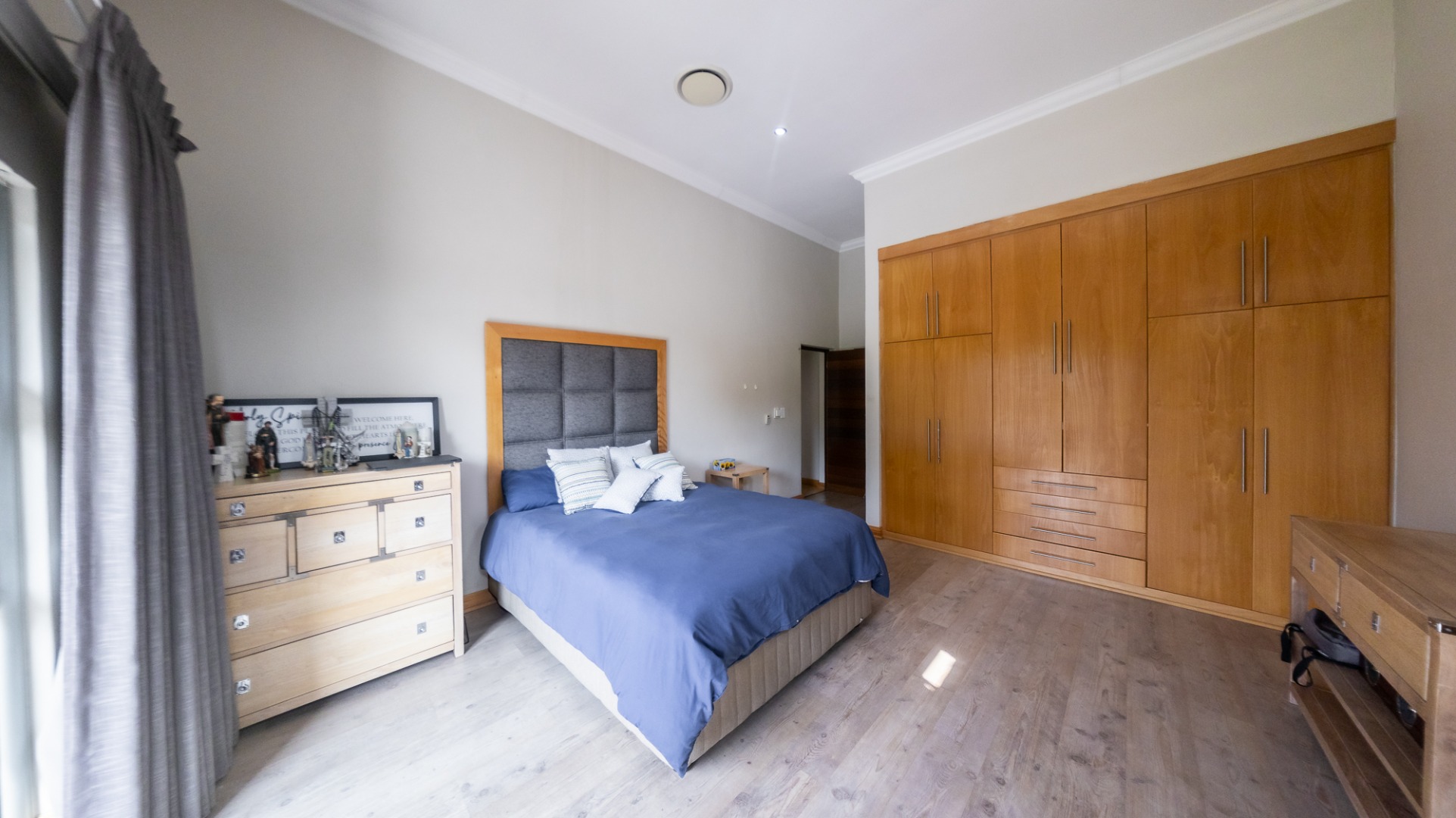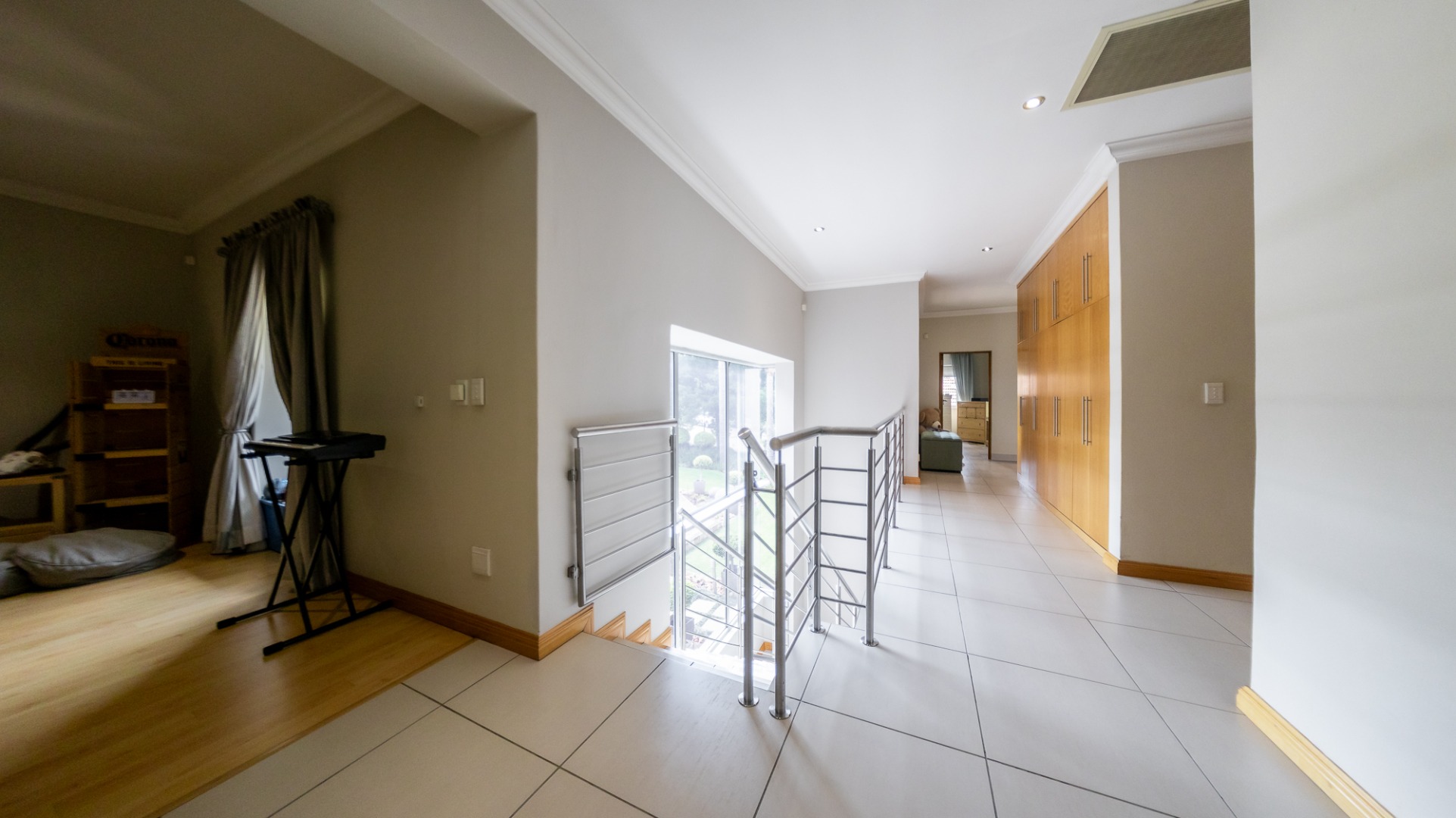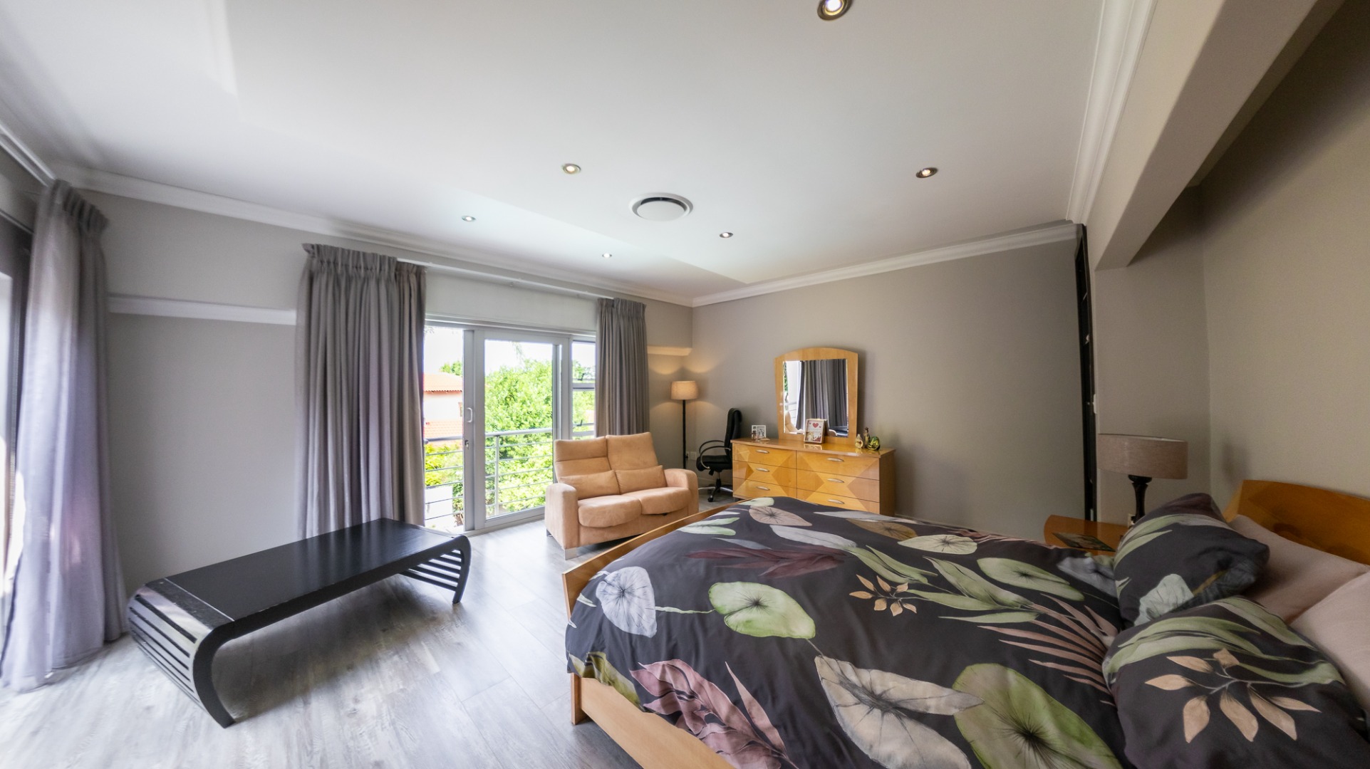 Discover this impressive multi-level contemporary residence nestled within the secure and sought-after Midstream Estate in Centurion, South Africa. Boasting a generous 589 sqm under roof on an 1114 sqm erf, this property immediately captivates with its modern aesthetic, integrated double garage, and expansive paved driveway, offering excellent curb appeal and ample parking. Step inside to a bright and spacious interior, characterized by an open-plan design, high ceilings, and abundant natural light filtering through large windows. The home features three distinct lounge areas and a dedicated dining room, providing versatile spaces for relaxation and entertaining. Modern recessed lighting, clean wood laminate and tiled flooring, and a contemporary staircase with sleek metal railings enhance the sophisticated ambiance. A notable highlight is the well-equipped home bar, perfect for social gatherings, complemented by a cozy fireplace for cooler evenings. This residence offers four comfortable bedrooms and three and a half bathrooms, including two en-suite facilities and a convenient guest toilet. The bathrooms feature modern floating vanities and neutral-toned tiled surfaces, ensuring both style and functionality. A dedicated study provides an ideal space for work or quiet contemplation. Outdoor living is equally impressive, with a private swimming pool set within a large, well-maintained lawn, offering a serene escape. A covered patio provides an ideal spot for al fresco dining and entertaining, while an upper-level balcony extends the outdoor enjoyment. The property also benefits from three garages, staff quarters, and a garden. Security is paramount within this eco-estate and gated community, featuring 24-hour security, a security post, access gates, and electric fencing, ensuring peace of mind. Modern conveniences include air conditioning, a central vacuum system, solar geyser, and fibre connectivity, enhancing comfort and efficiency. Pets are allowed, making this a truly family-friendly environment. Midstream Estate is renowned for its secure, family-oriented lifestyle, offering residents access to a clubhouse and a vibrant community atmosphere within Centurion. Key Features: * 4 Bedrooms, 3.5 Bathrooms (2 En-suite) * 3 Lounges, 1 Dining Room, Study * Private Swimming Pool & Covered Patio * Dedicated Home Bar & Fireplace * 3 Garages & Ample Paved Parking * 24-Hour Security in Gated Eco-Estate * Air Conditioning, Solar Geyser, Fibre Connectivity * Staff Quarters & Garden