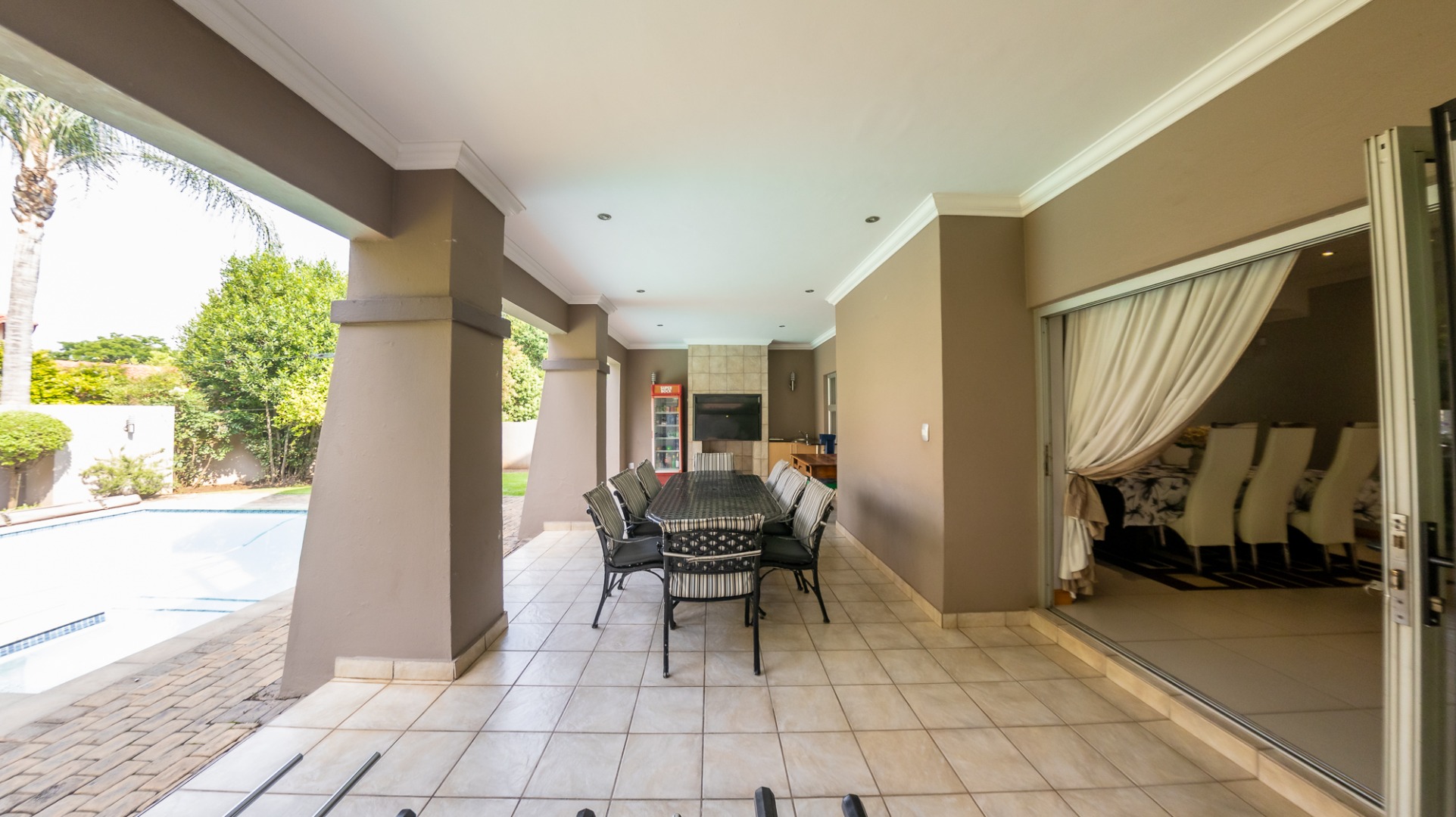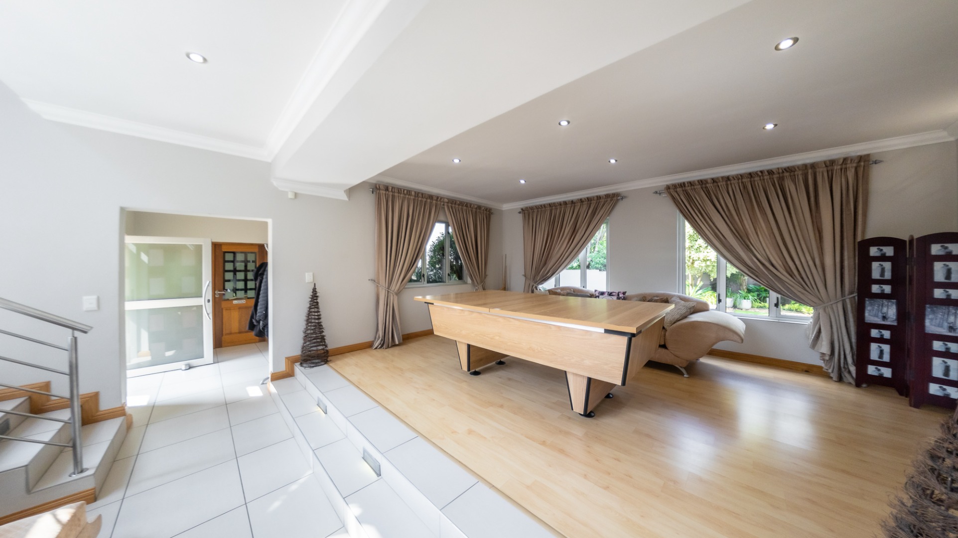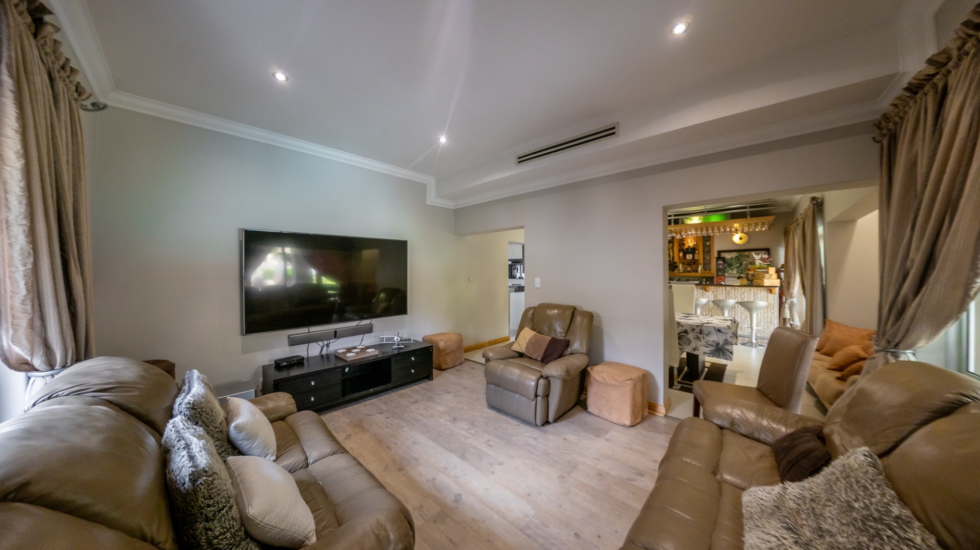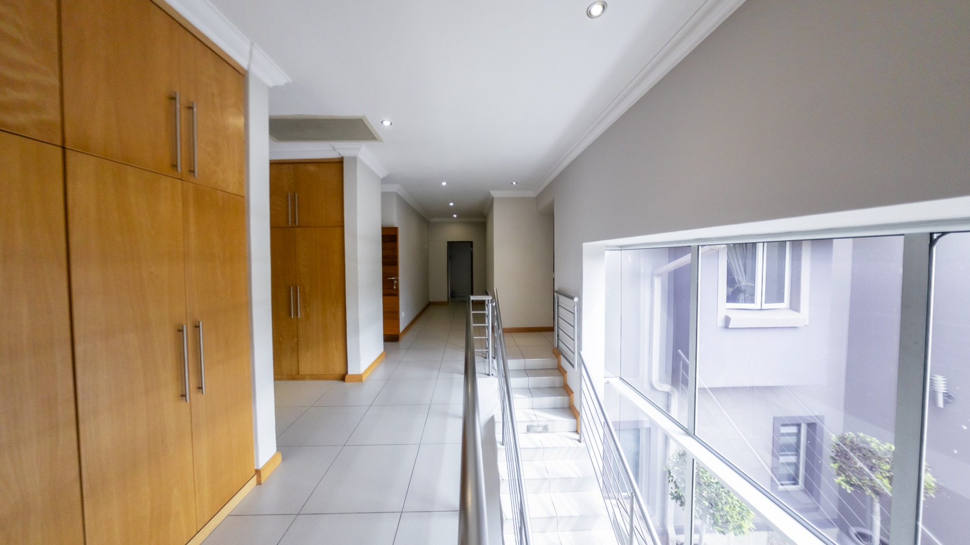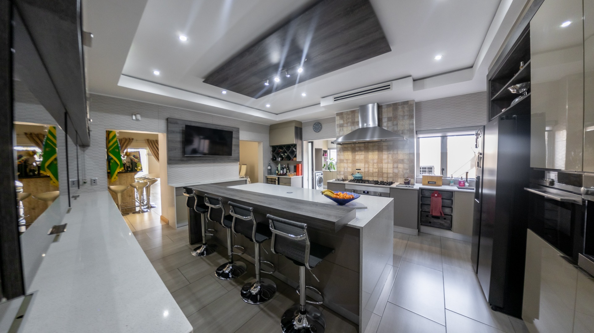 Discover this impressive multi-level contemporary residence nestled within the secure and sought-after Midstream Estate in Centurion, South Africa. Boasting a generous 589 sqm under roof on an 1114 sqm erf, this property immediately captivates with its modern aesthetic, integrated double garage, and expansive paved driveway, offering excellent curb appeal and ample parking. Step inside to a bright and spacious interior, characterized by an open-plan design, high ceilings, and abundant natural light filtering through large windows. The home features three distinct lounge areas and a dedicated dining room, providing versatile spaces for relaxation and entertaining. Modern recessed lighting, clean wood laminate and tiled flooring, and a contemporary staircase with sleek metal railings enhance the sophisticated ambiance. A notable highlight is the well-equipped home bar, perfect for social gatherings, complemented by a cozy fireplace for cooler evenings. This residence offers four comfortable bedrooms and three and a half bathrooms, including two en-suite facilities and a convenient guest toilet. The bathrooms feature modern floating vanities and neutral-toned tiled surfaces, ensuring both style and functionality. A dedicated study provides an ideal space for work or quiet contemplation. Outdoor living is equally impressive, with a private swimming pool set within a large, well-maintained lawn, offering a serene escape. A covered patio provides an ideal spot for al fresco dining and entertaining, while an upper-level balcony extends the outdoor enjoyment. The property also benefits from three garages, staff quarters, and a garden. Security is paramount within this eco-estate and gated community, featuring 24-hour security, a security post, access gates, and electric fencing, ensuring peace of mind. Modern conveniences include air conditioning, a central vacuum system, solar geyser, and fibre connectivity, enhancing comfort and efficiency. Pets are allowed, making this a truly family-friendly environment. Midstream Estate is renowned for its secure, family-oriented lifestyle, offering residents access to a clubhouse and a vibrant community atmosphere within Centurion. Key Features: * 4 Bedrooms, 3.5 Bathrooms (2 En-suite) * 3 Lounges, 1 Dining Room, Study * Private Swimming Pool & Covered Patio * Dedicated Home Bar & Fireplace * 3 Garages & Ample Paved Parking * 24-Hour Security in Gated Eco-Estate * Air Conditioning, Solar Geyser, Fibre Connectivity * Staff Quarters & Garden