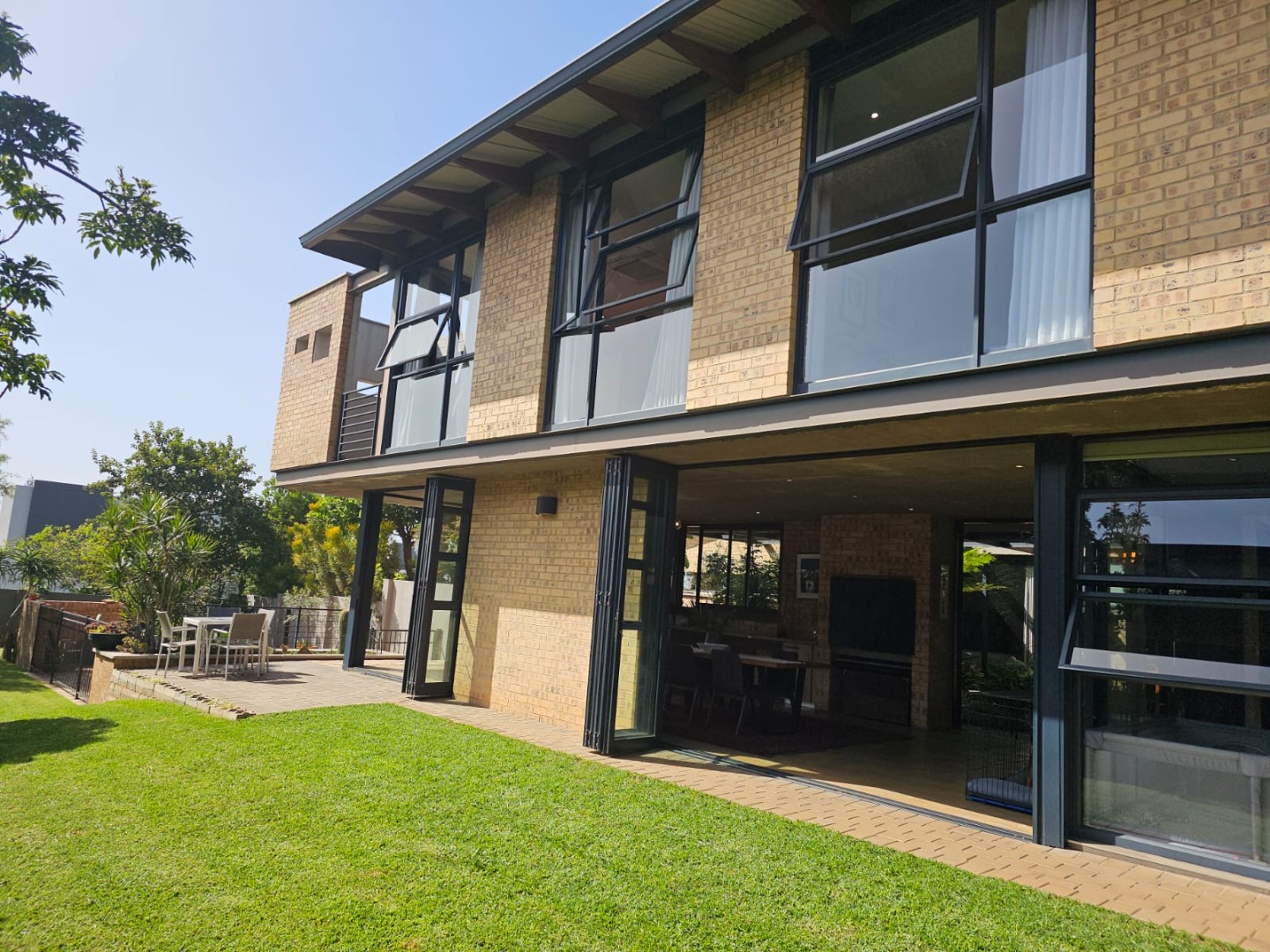 This stunning 4-bedroom home in Midstream Ridge Estate offers a fantastic blend of modern design and comfortable living. From the moment you arrive, the contemporary brick exterior, large floor-to-ceiling windows, and bifold doors create a welcoming first impression, hinting at the bright and airy spaces within. The well-maintained lawn and paved patio invite you to enjoy the outdoors, complete with a private swimming pool for those sunny South African days.