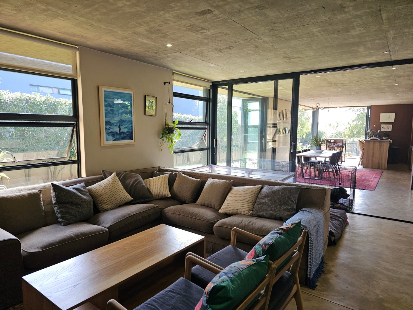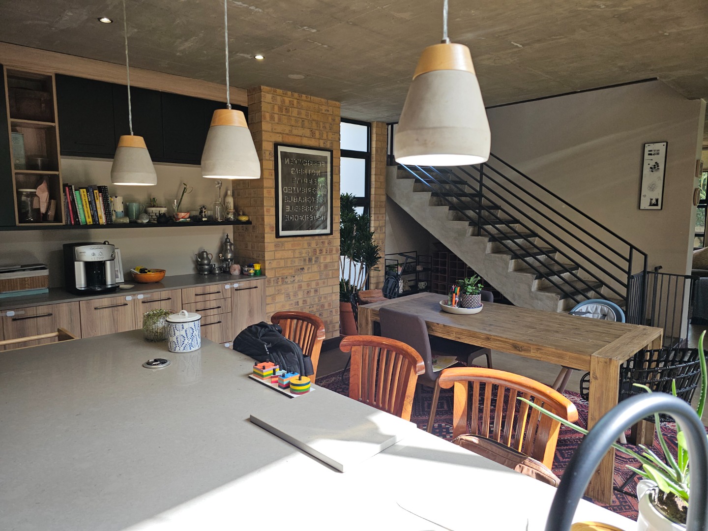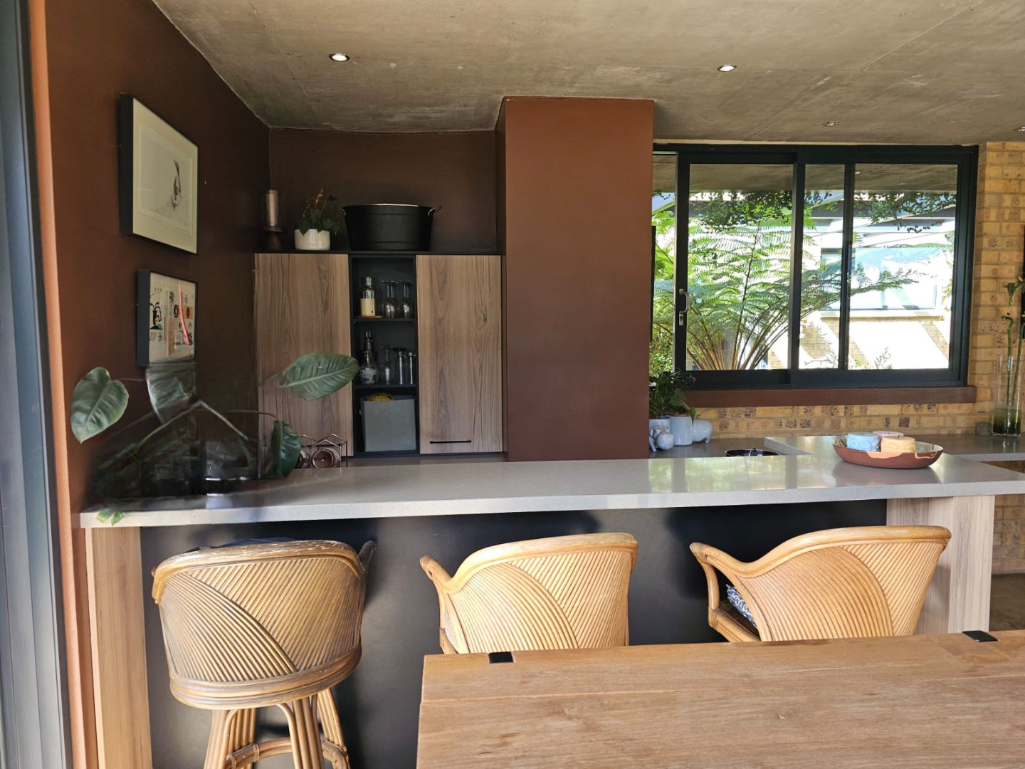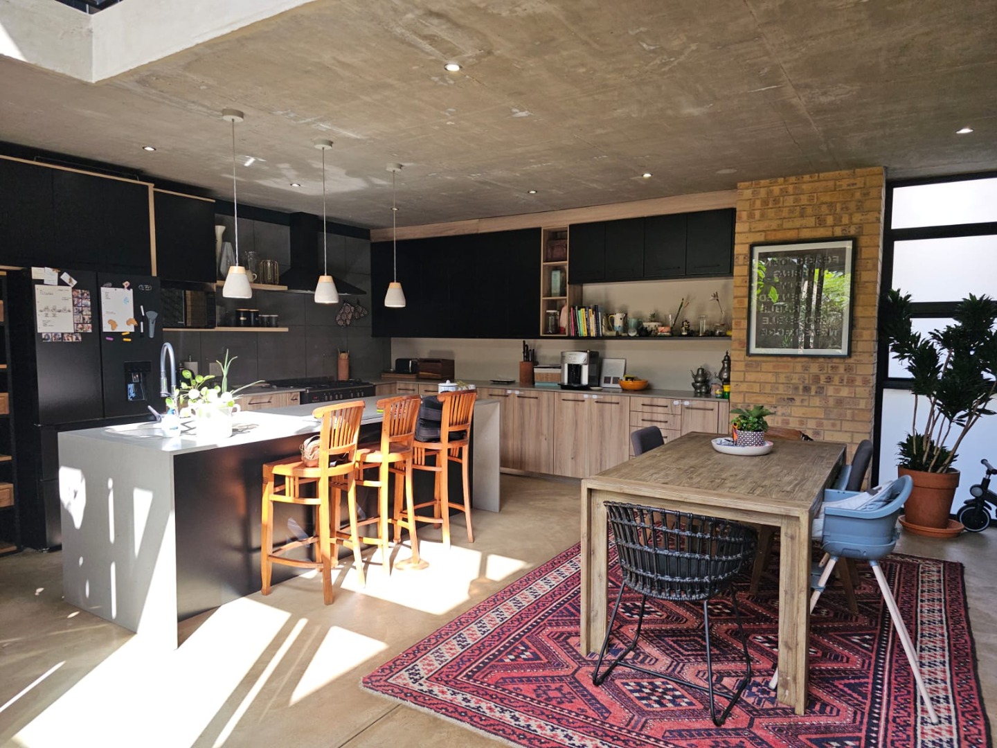 Step inside and discover an open-plan layout that truly embraces modern living with a beautiful atrium. High exposed concrete ceilings and screed floors give the home an industrial-accent and abundant natural light streaming through expansive windows and sliding doors. You'll find two spacious lounges and a dedicated dining room, perfect for family gatherings or entertaining friends. The modern kitchen, featuring a large island, black cabinetry and a stylish brick accent wall, is a dream for any home chef. Plus, there's a handy pantry and an inviting entrance hall.