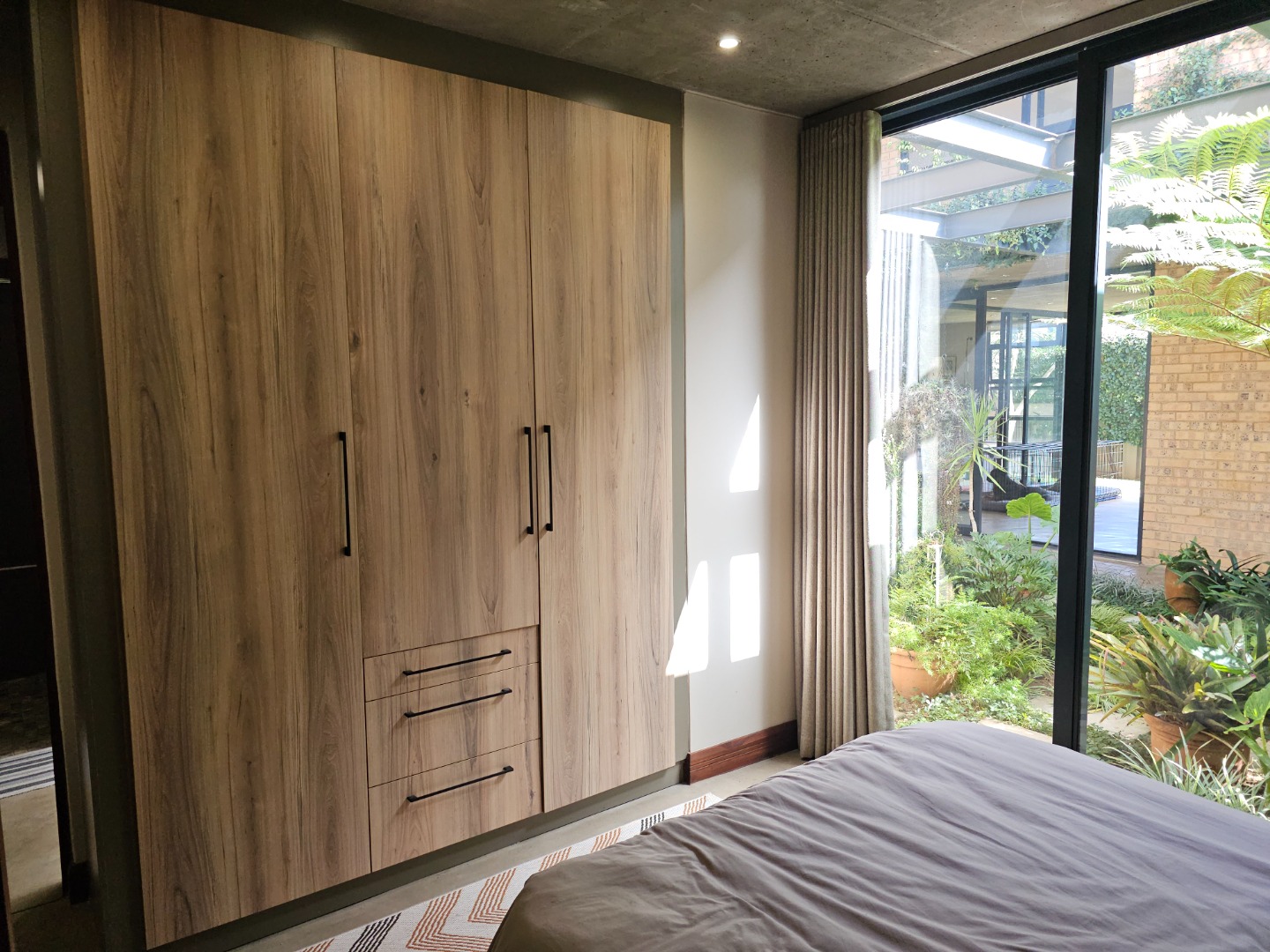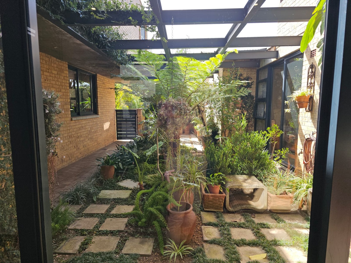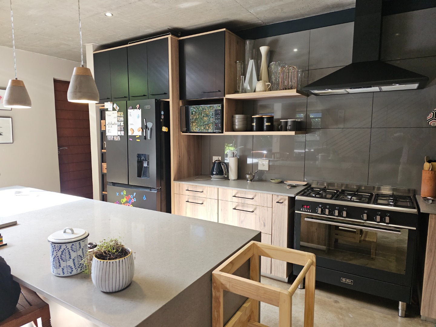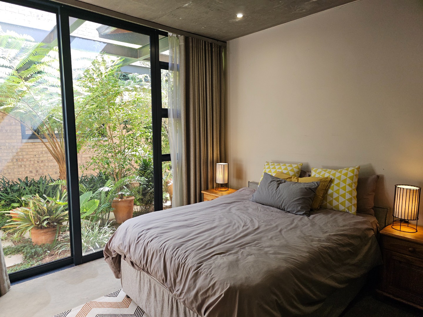 Step inside and discover an open-plan layout that truly embraces modern living with a beautiful atrium. High exposed concrete ceilings and screed floors give the home an industrial-accent and abundant natural light streaming through expansive windows and sliding doors. You'll find two spacious lounges and a dedicated dining room, perfect for family gatherings or entertaining friends. The modern kitchen, featuring a large island, black cabinetry and a stylish brick accent wall, is a dream for any home chef. Plus, there's a handy pantry and an inviting entrance hall.