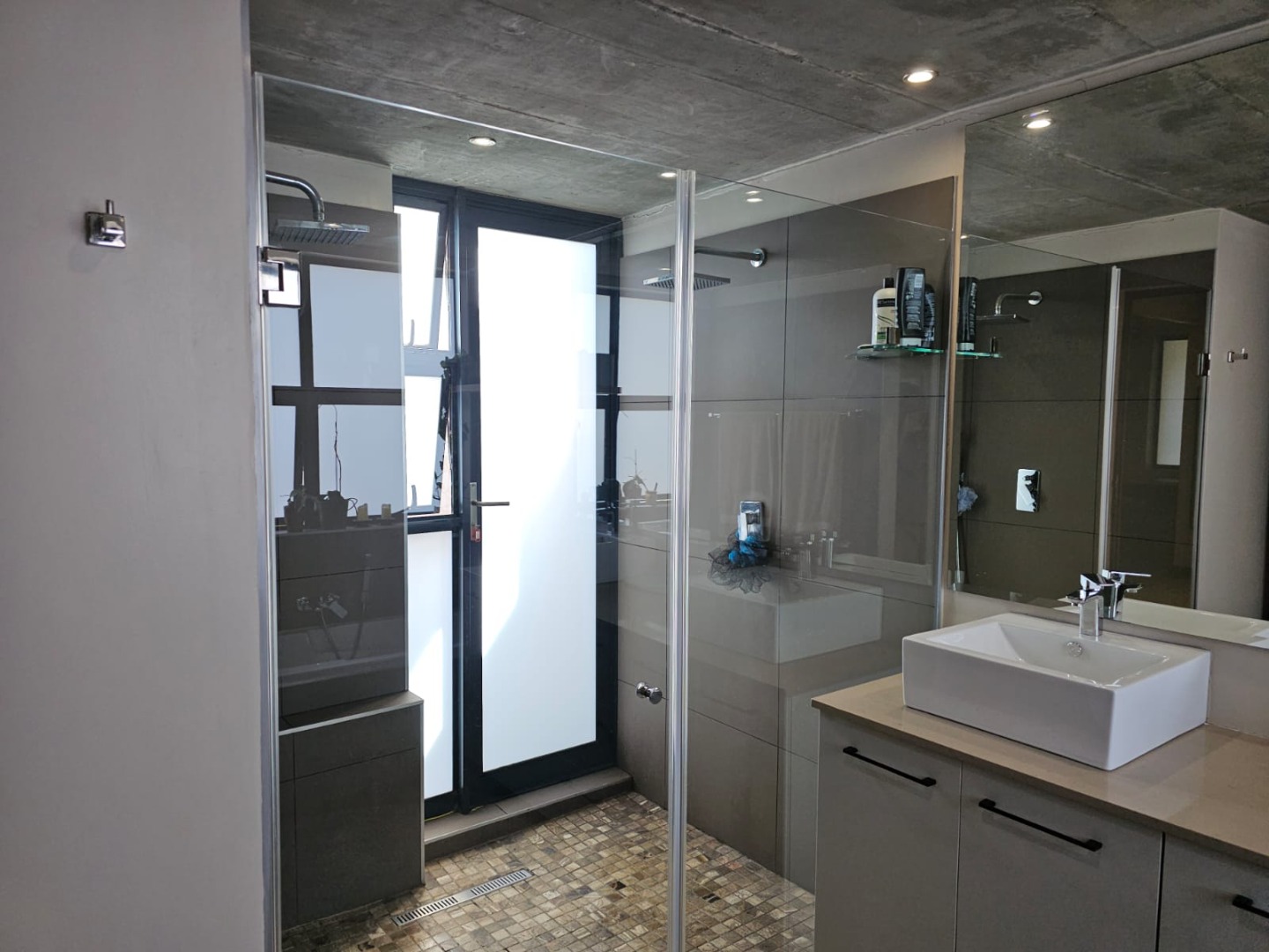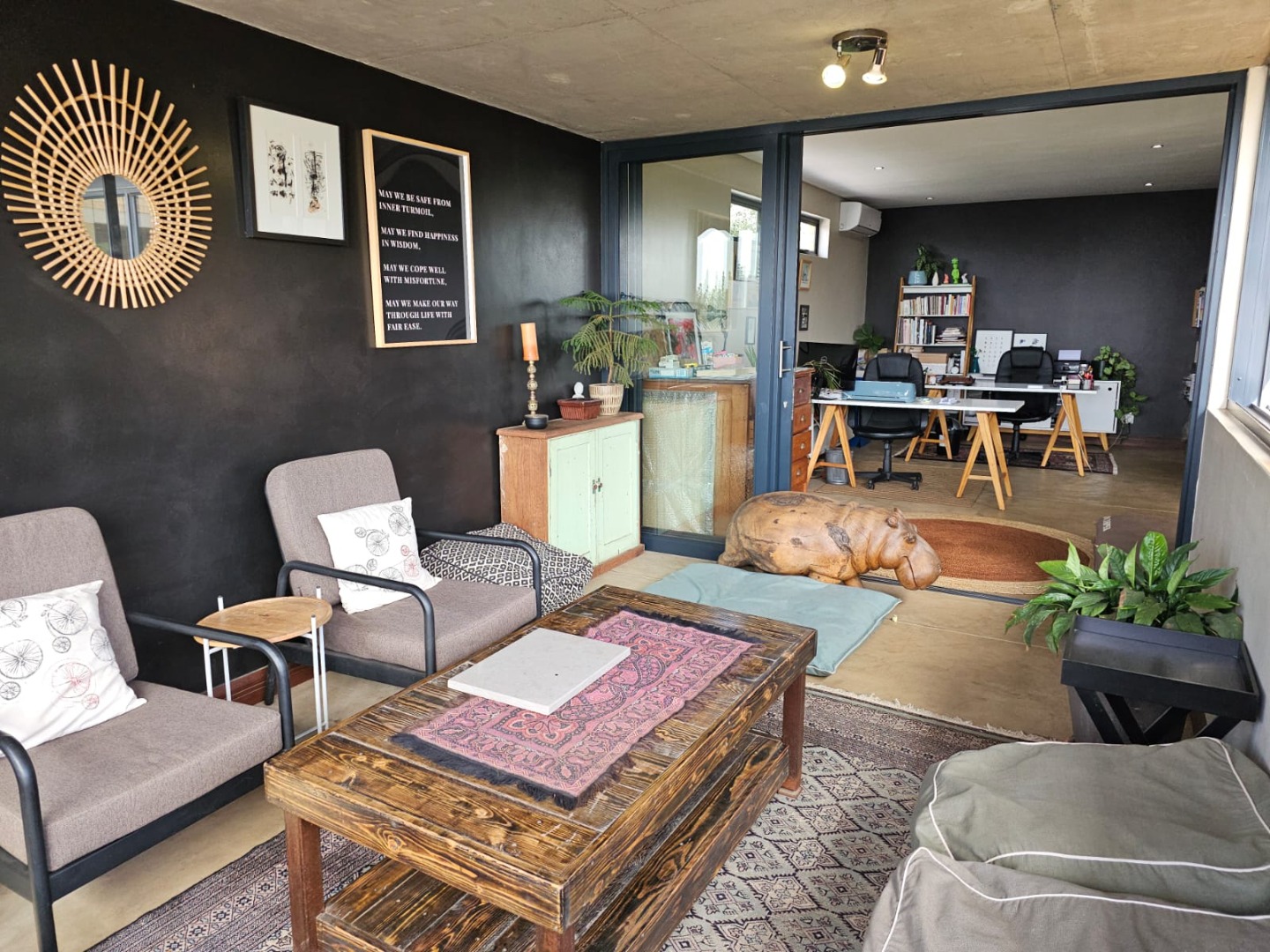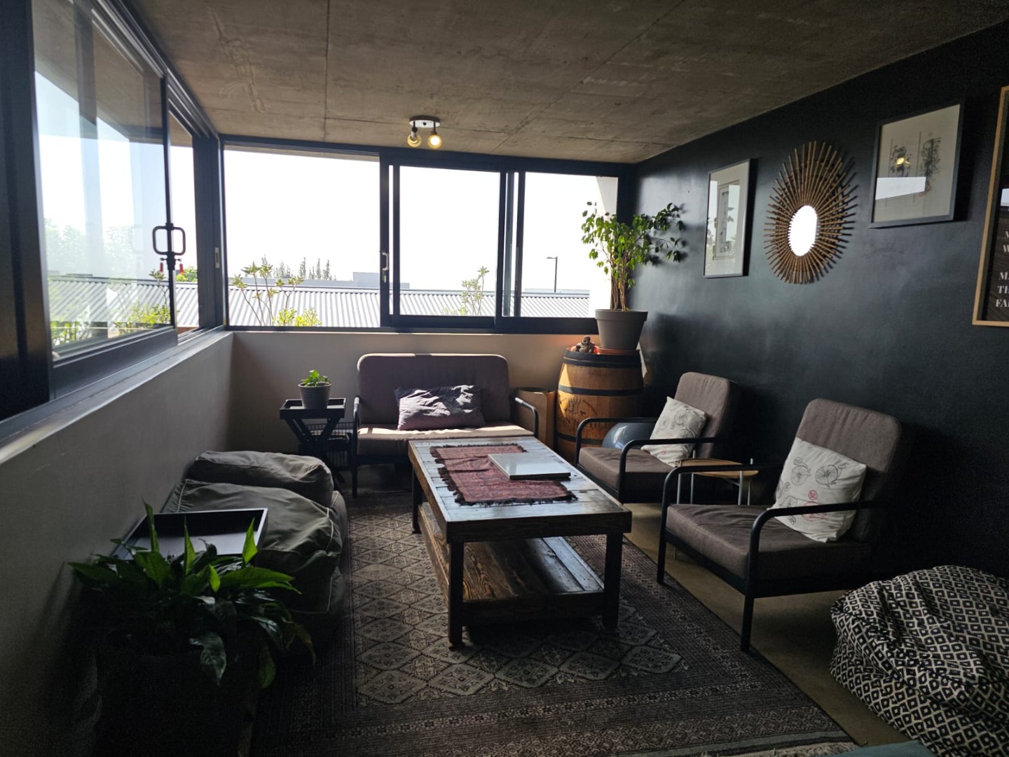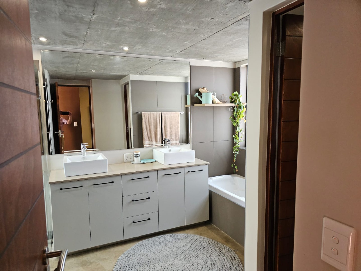 Step inside and discover an open-plan layout that truly embraces modern living with a beautiful atrium. High exposed concrete ceilings and screed floors give the home an industrial-accent and abundant natural light streaming through expansive windows and sliding doors. You'll find two spacious lounges and a dedicated dining room, perfect for family gatherings or entertaining friends. The modern kitchen, featuring a large island, black cabinetry and a stylish brick accent wall, is a dream for any home chef. Plus, there's a handy pantry and an inviting entrance hall.
