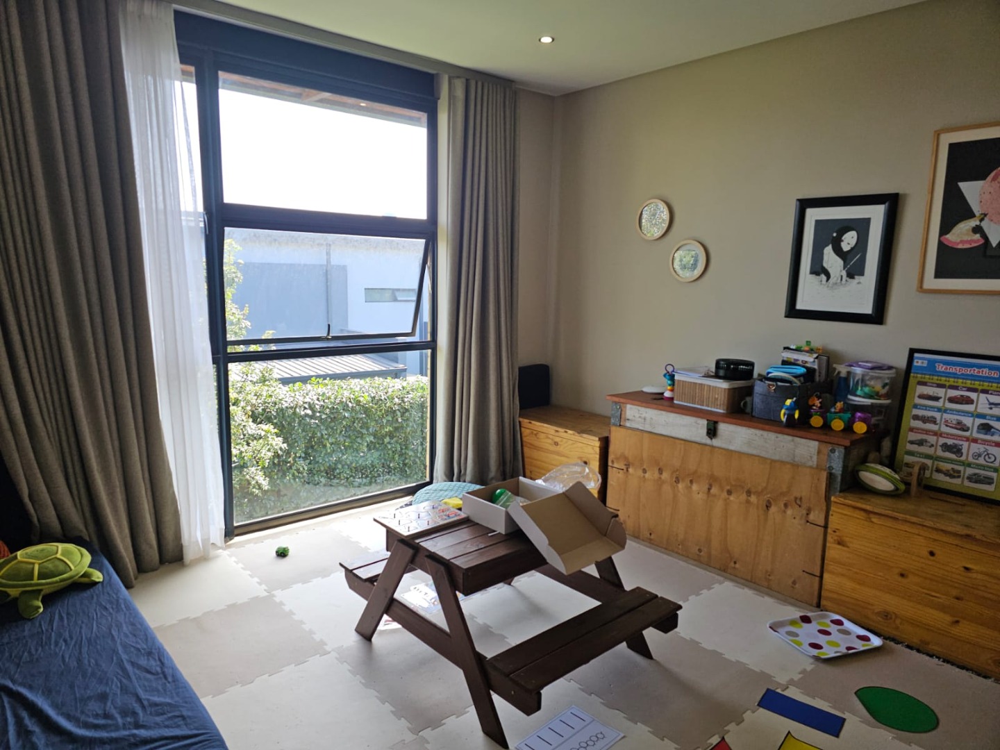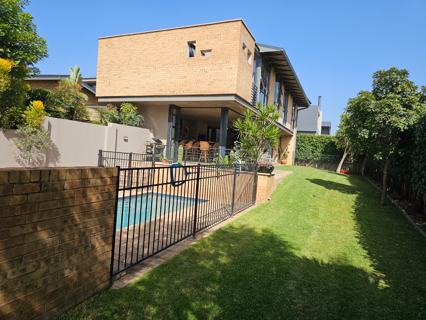 This stunning 4-bedroom home in Midstream Ridge Estate offers a fantastic blend of modern design and comfortable living. From the moment you arrive, the contemporary brick exterior, large floor-to-ceiling windows, and bifold doors create a welcoming first impression, hinting at the bright and airy spaces within. The well-maintained lawn and paved patio invite you to enjoy the outdoors, complete with a private swimming pool for those sunny South African days.