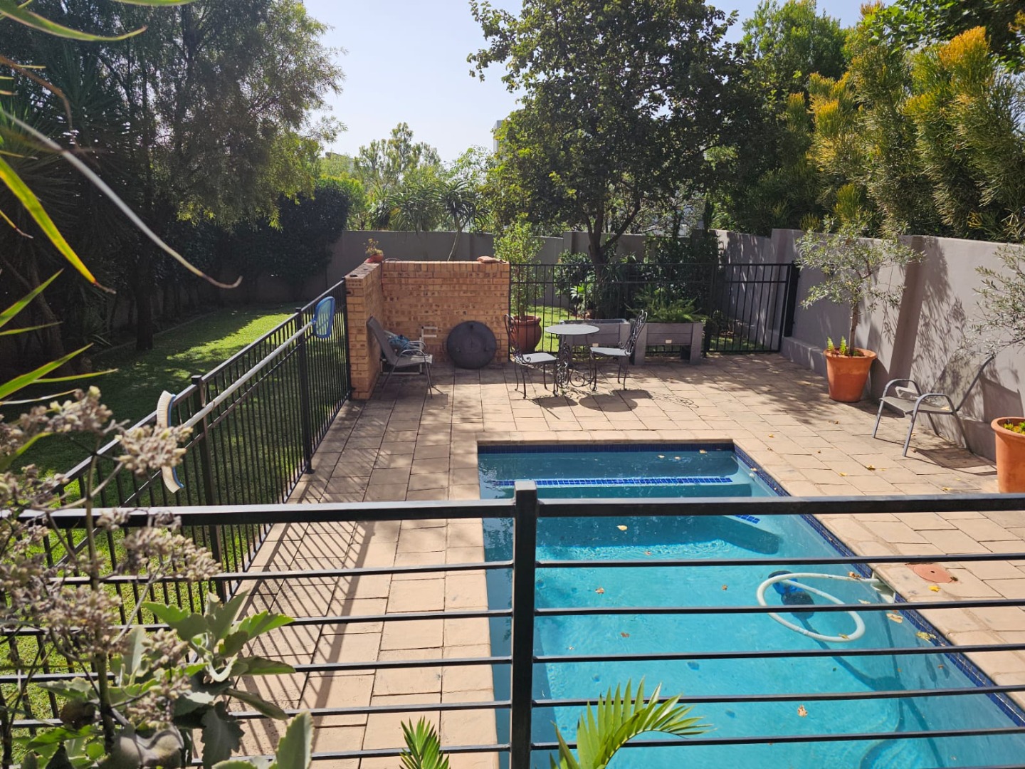Outdoor living is a breeze with a lovely enclosed entertainment area, built in braai a private swimming pool with heat pump and outside paved area. The property is pet-friendly, so your furry friends are welcome, regrettably no cats! With three garages and storage spaces, there's plenty of room. Enjoy year-round entertaining with a built-in braai in the open-plan area and a cozy fire place for cooler evenings.