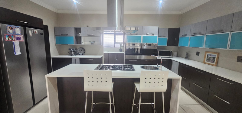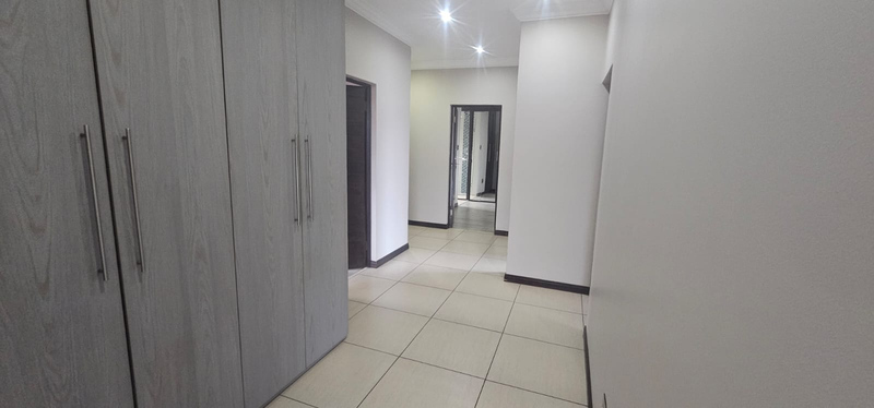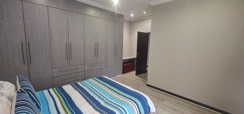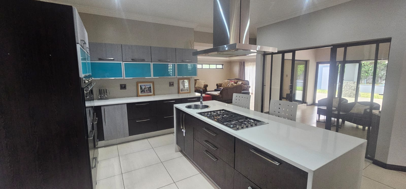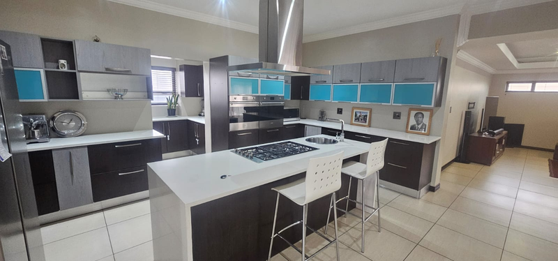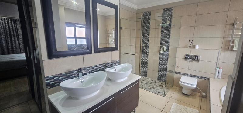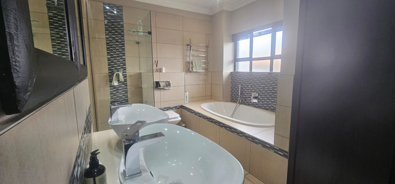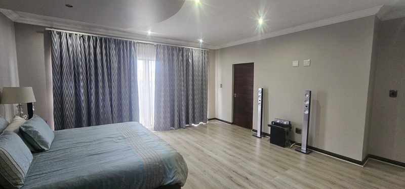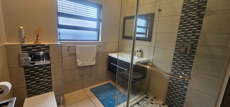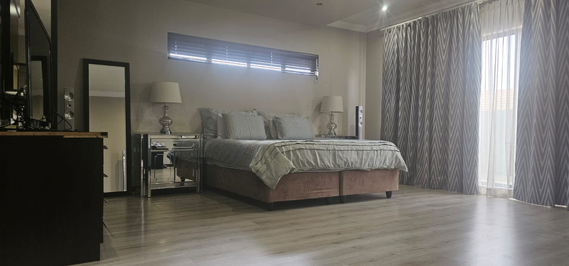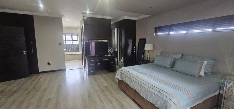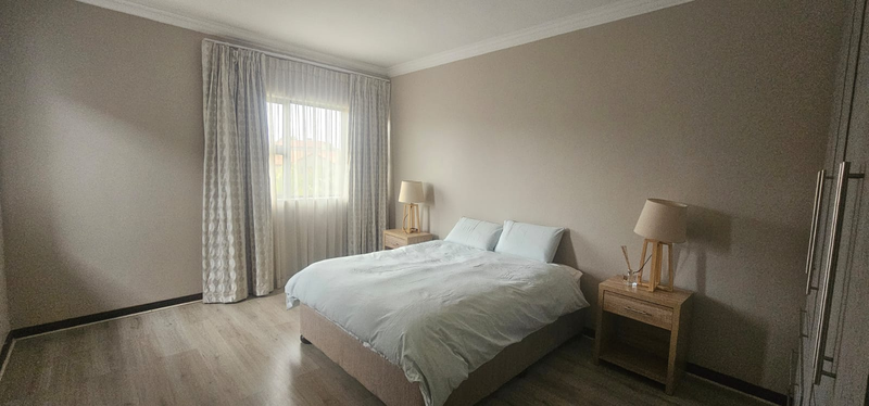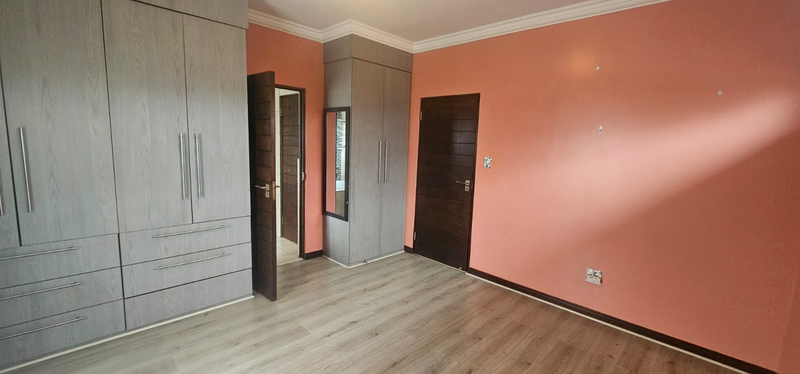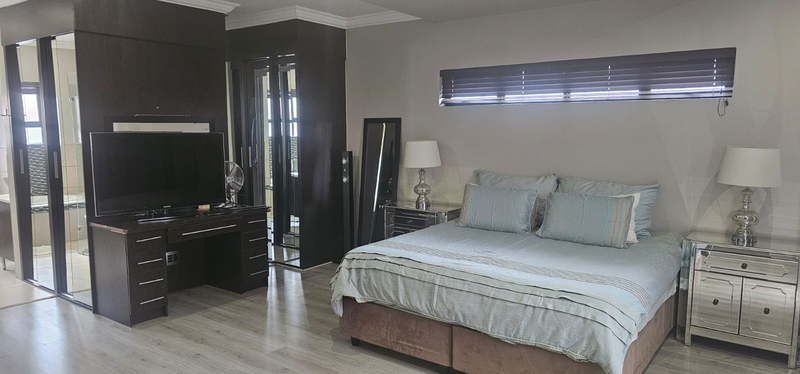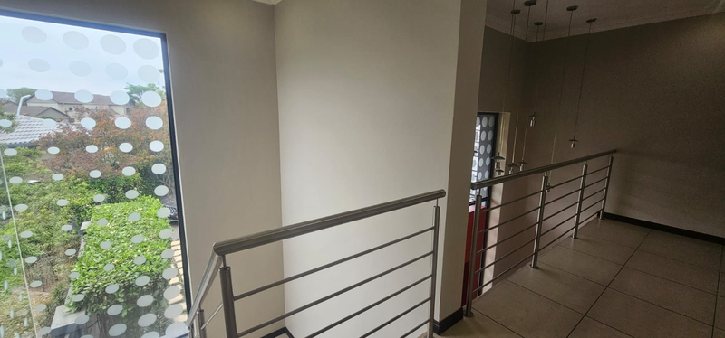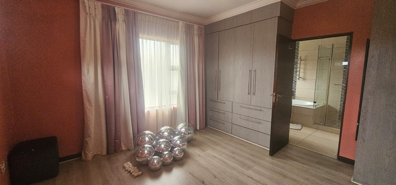 The modern kitchen features ample cupboard space, a separate scullery, and integrates beautifully with the living areas. A private guest suite downstairs includes its own en suite bathroom, while upstairs offers three sunlit bedrooms, including a luxurious master suite with mirrored walk-through cupboards, full en suite bathroom, private balcony, and an adjacent study or nursery.