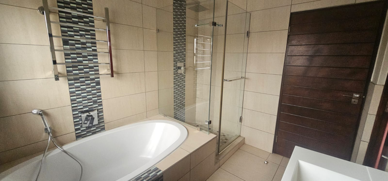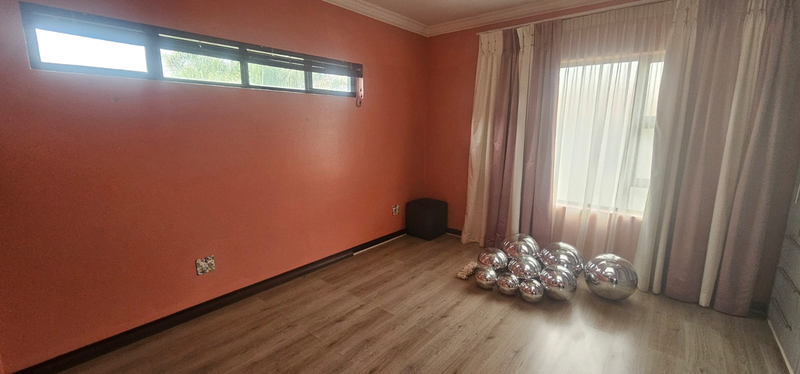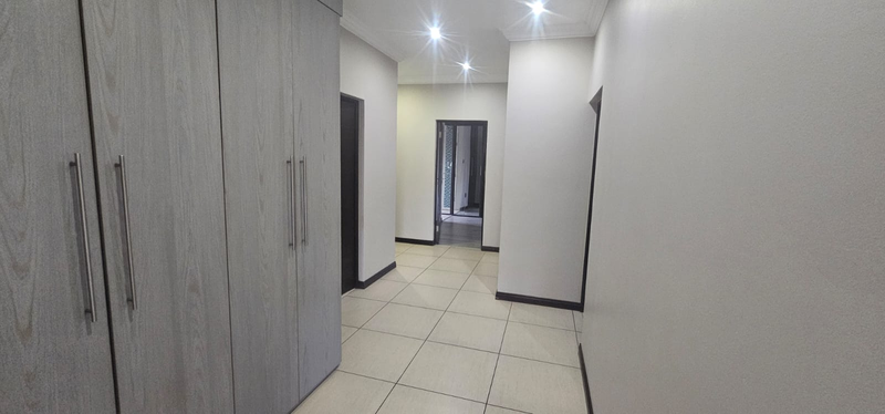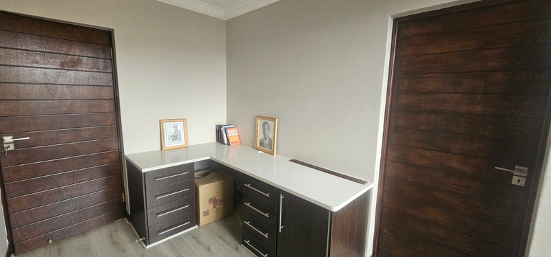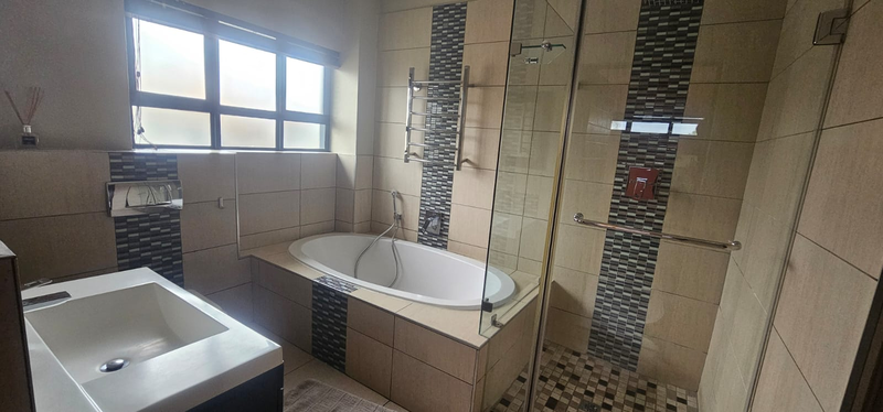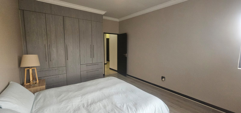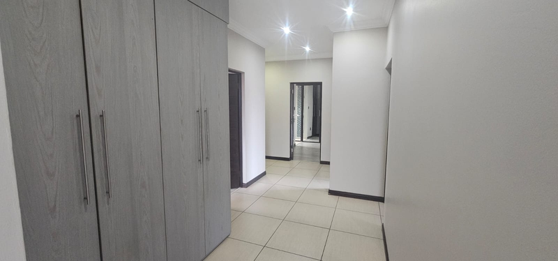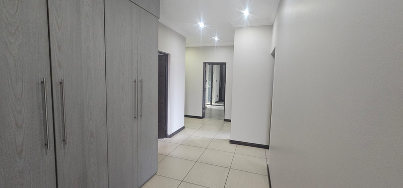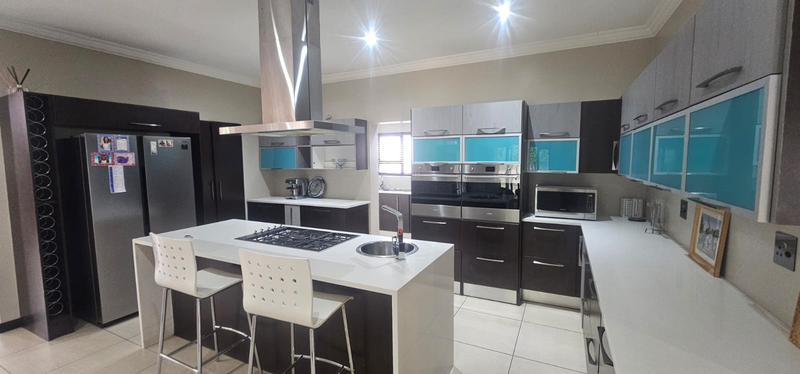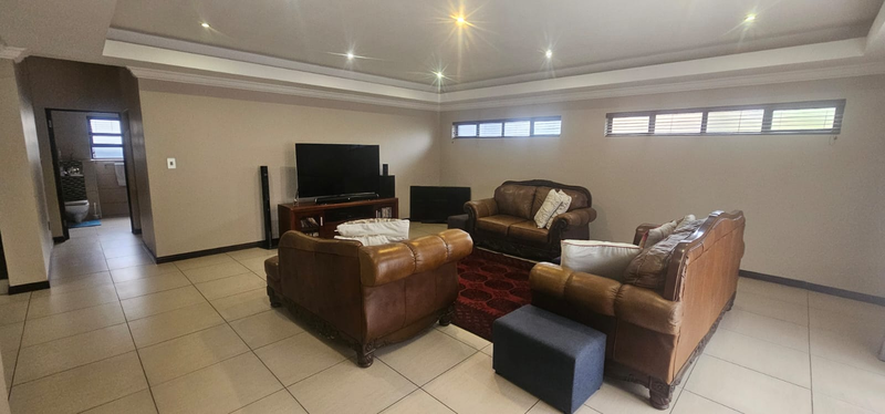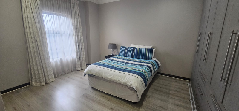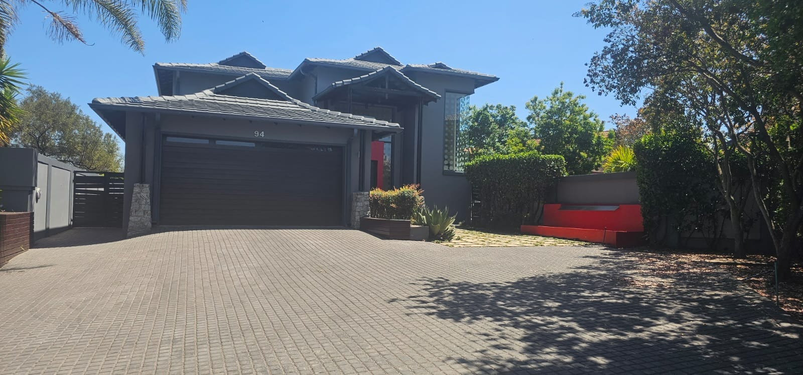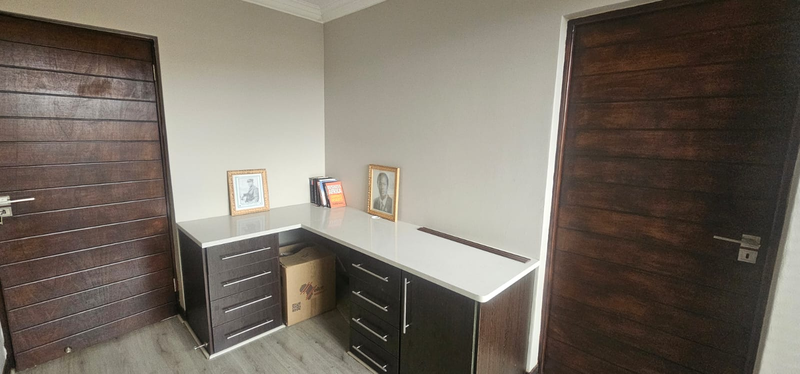 The modern kitchen features ample cupboard space, a separate scullery, and integrates beautifully with the living areas. A private guest suite downstairs includes its own en suite bathroom, while upstairs offers three sunlit bedrooms, including a luxurious master suite with mirrored walk-through cupboards, full en suite bathroom, private balcony, and an adjacent study or nursery.