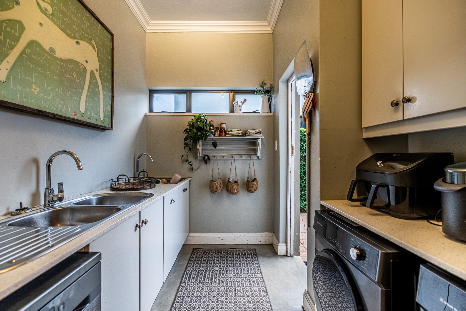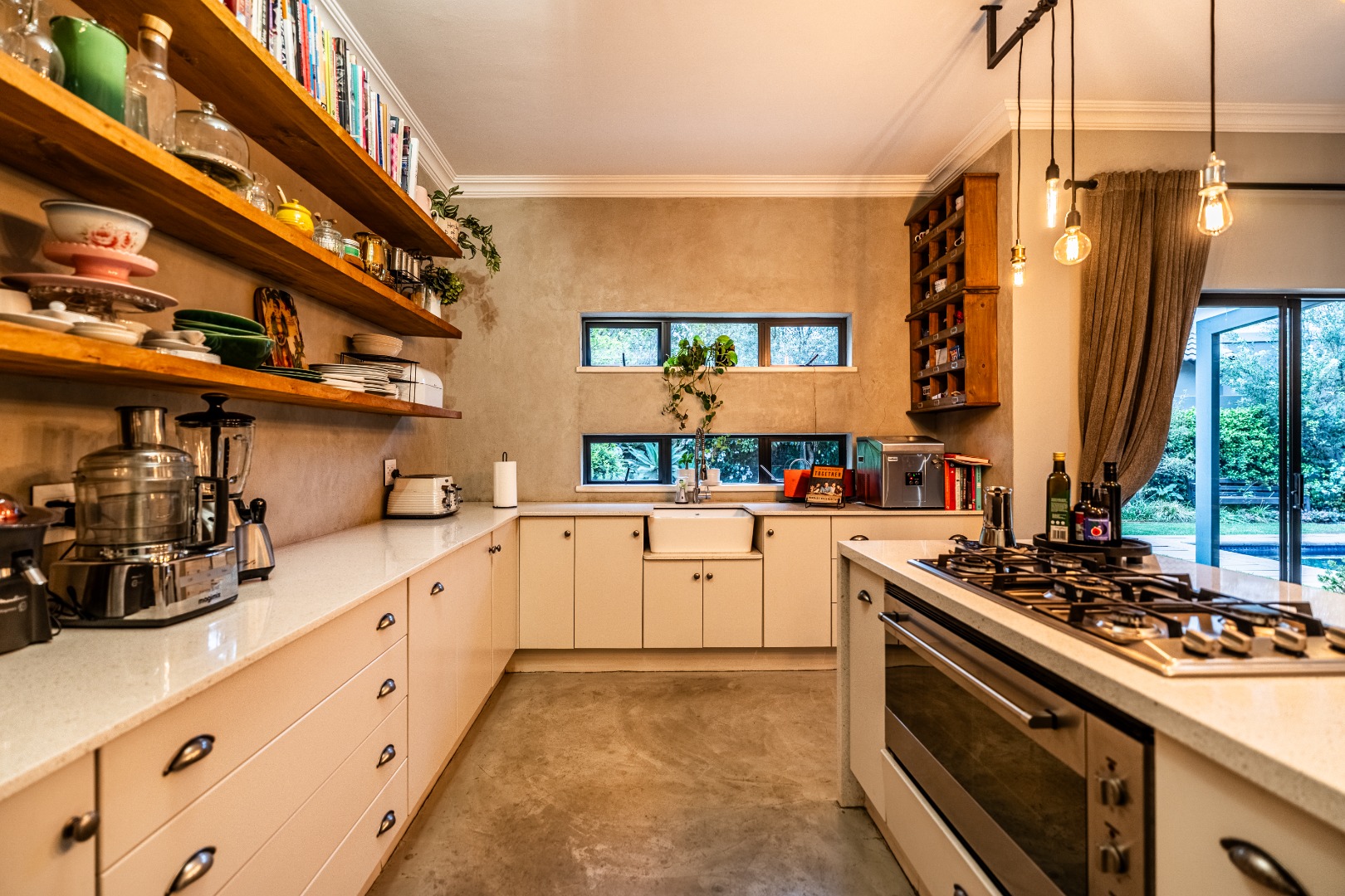 Adjacent is a farm-style kitchen outfitted with modern cabinetry, ample worktop space, and a separate scullery complete with pantry cupboard for extra storage.