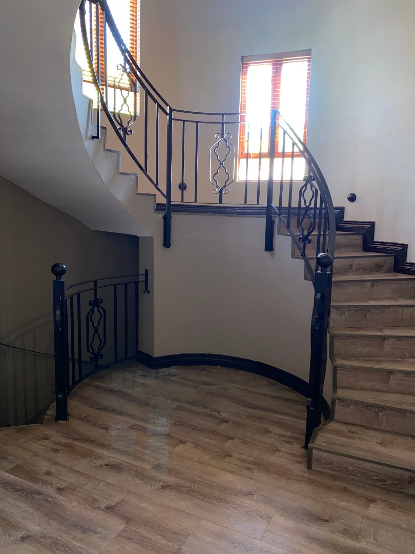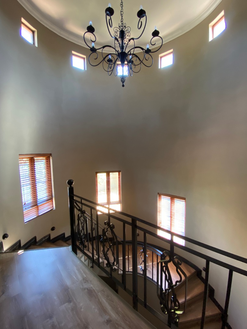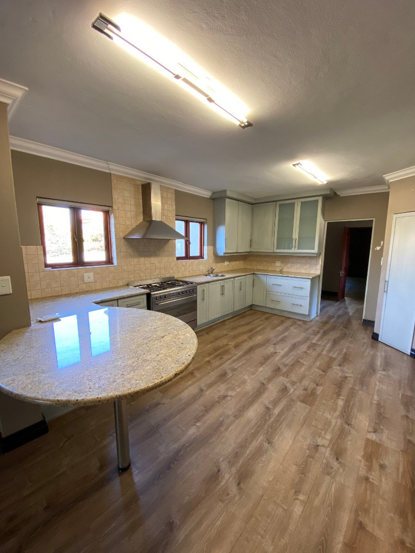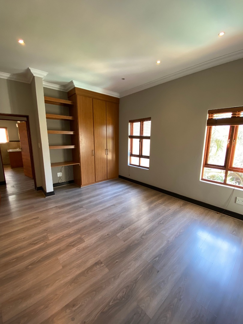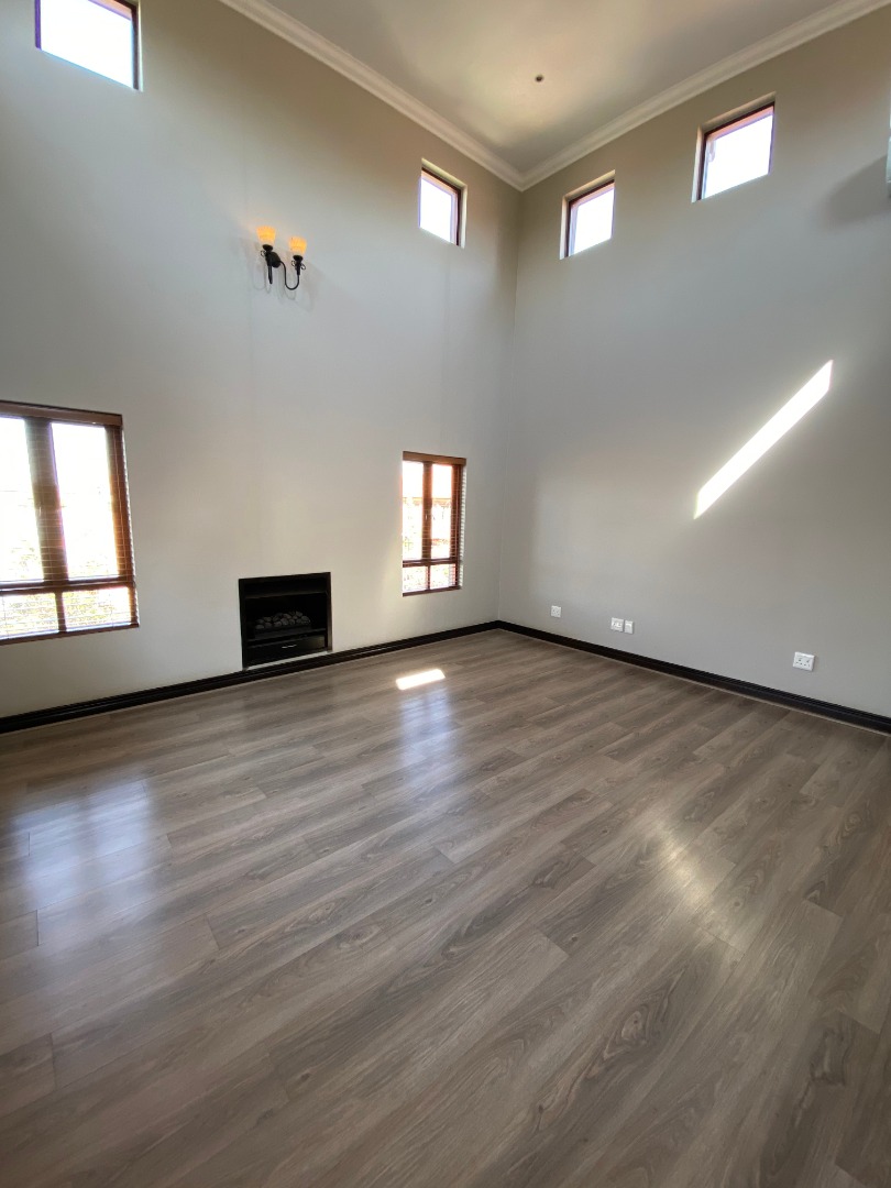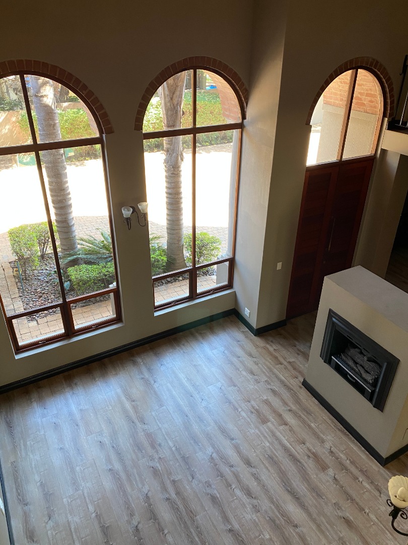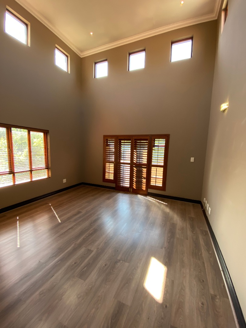 Offering downstairs – double volume entrance, dining room with large windows, gas fireplace, separate lounge, and TV room, all opening onto the patio with build in braai overlooking the sparkling pool, garden and park. The family size kitchen offers modern finishes, pantry and separate scullery.
