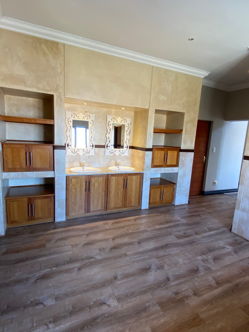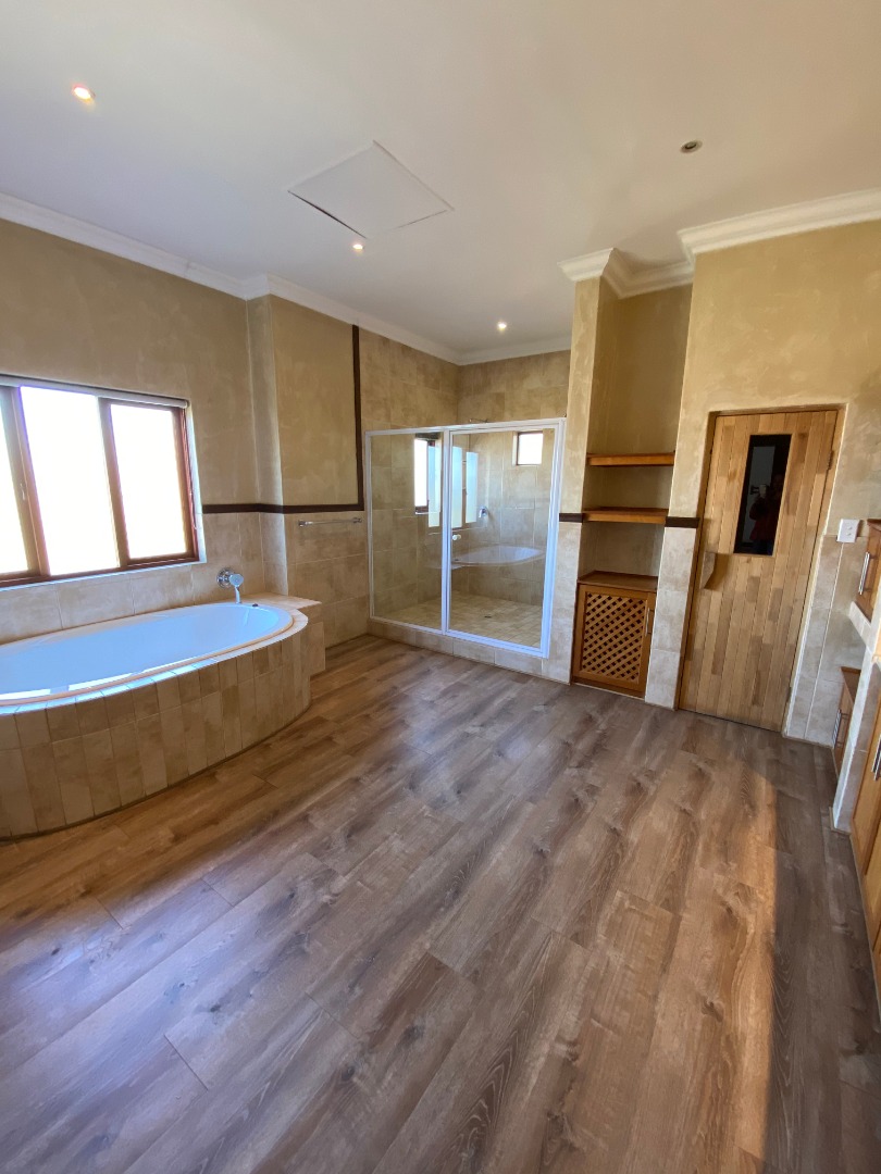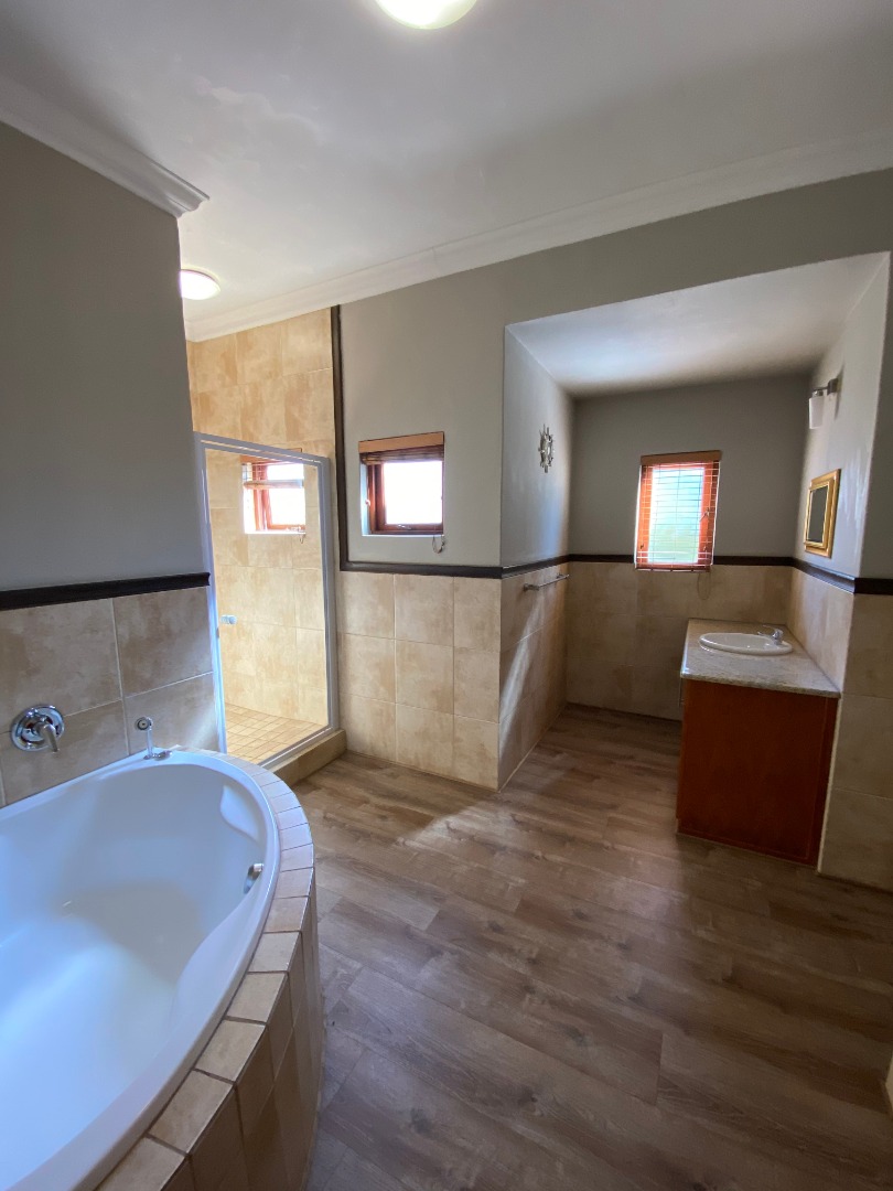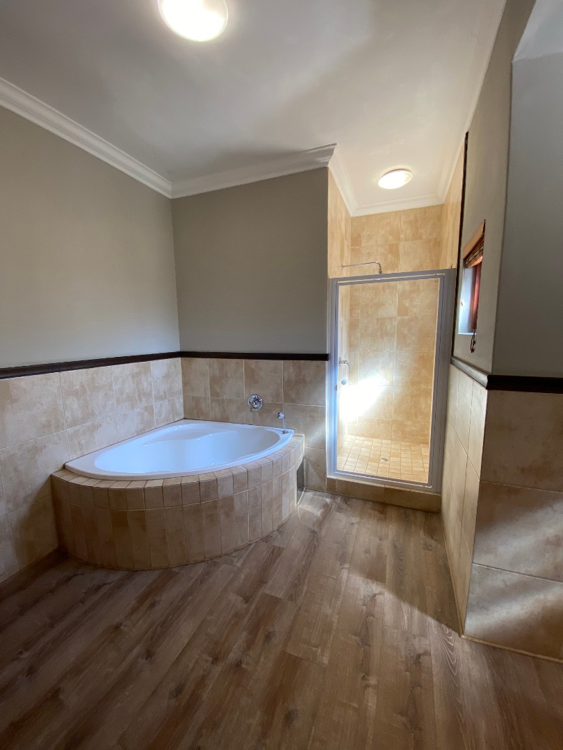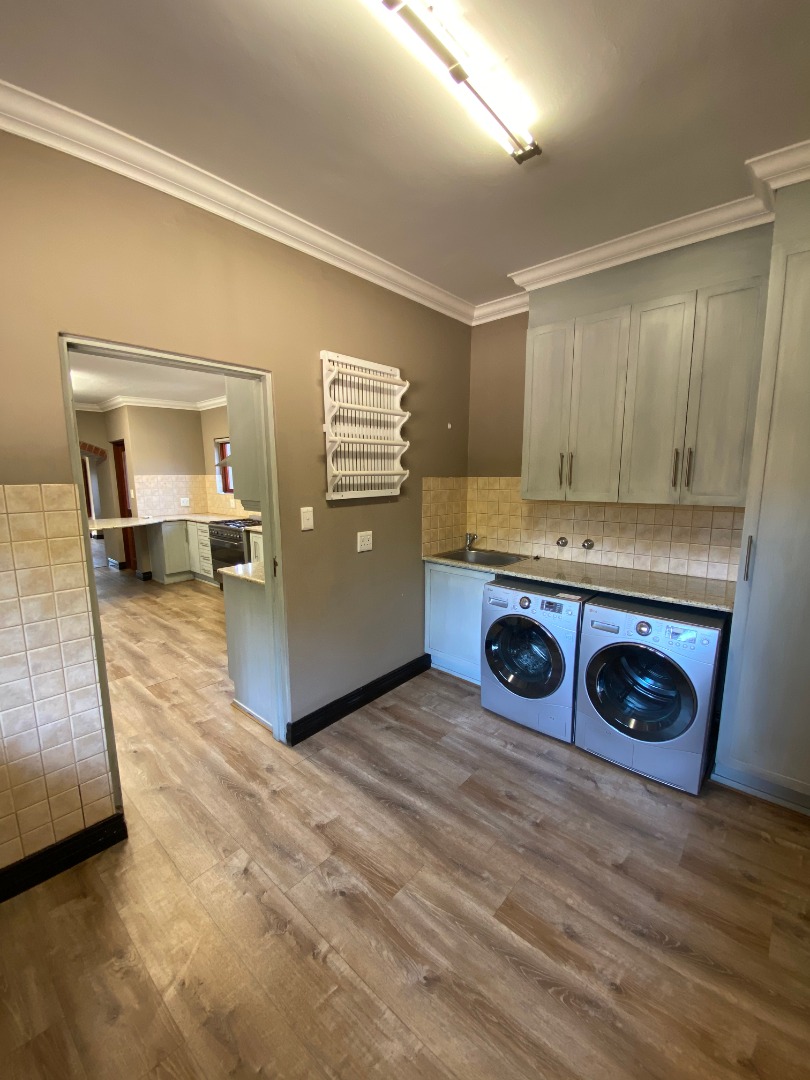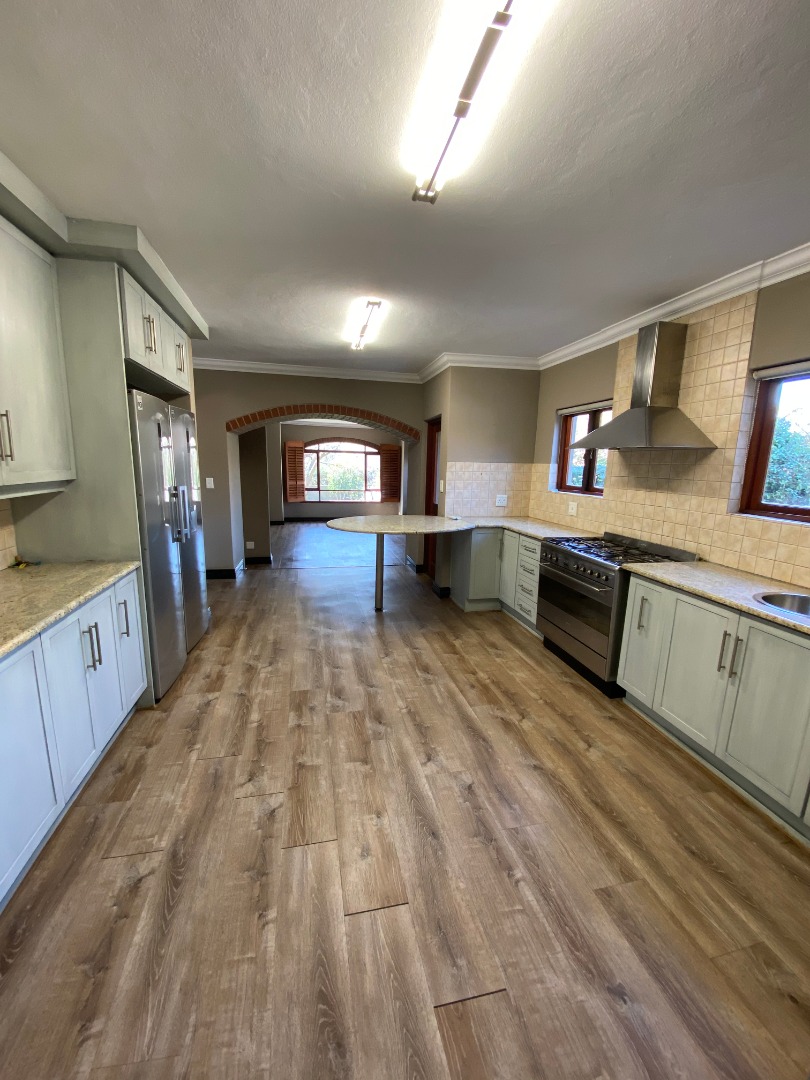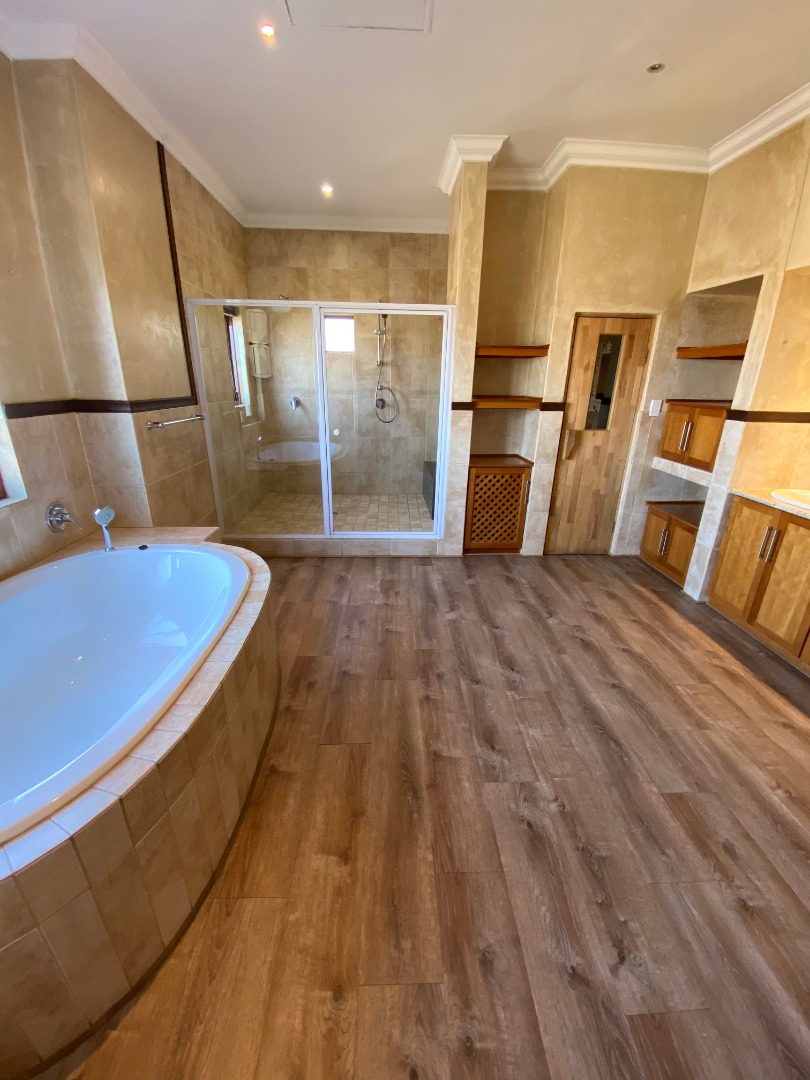 Offering downstairs – double volume entrance, dining room with large windows, gas fireplace, separate lounge, and TV room, all opening onto the patio with build in braai overlooking the sparkling pool, garden and park. The family size kitchen offers modern finishes, pantry and separate scullery.
