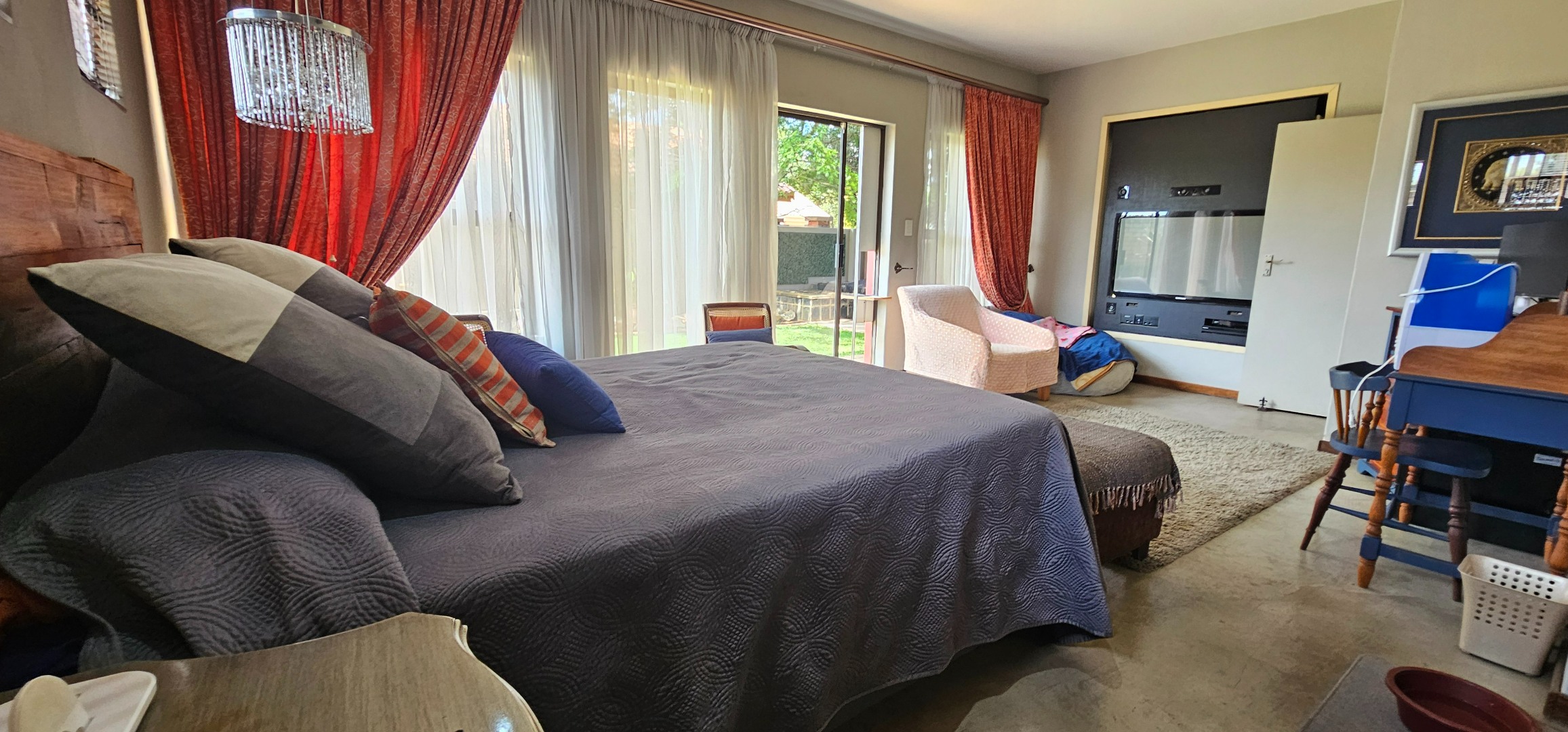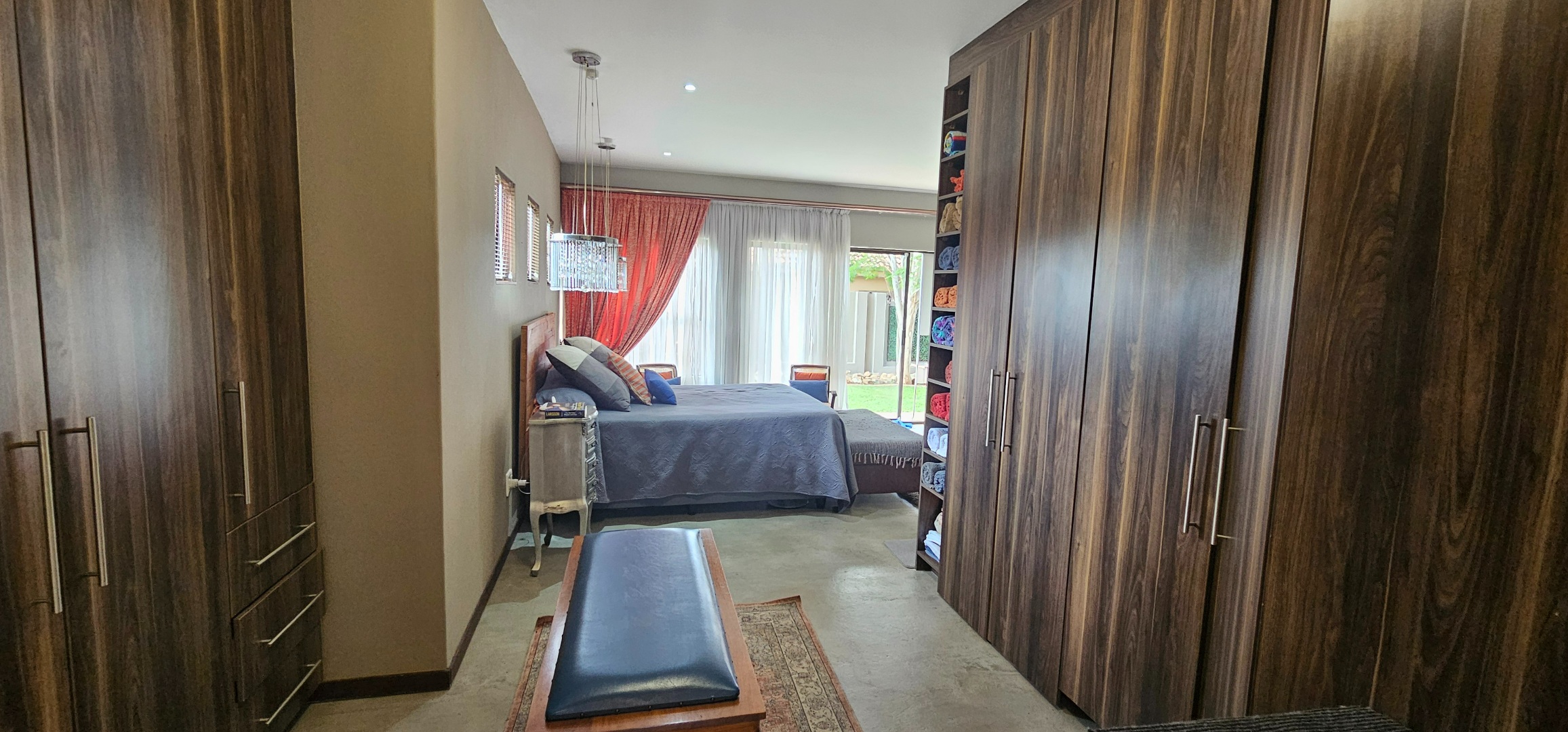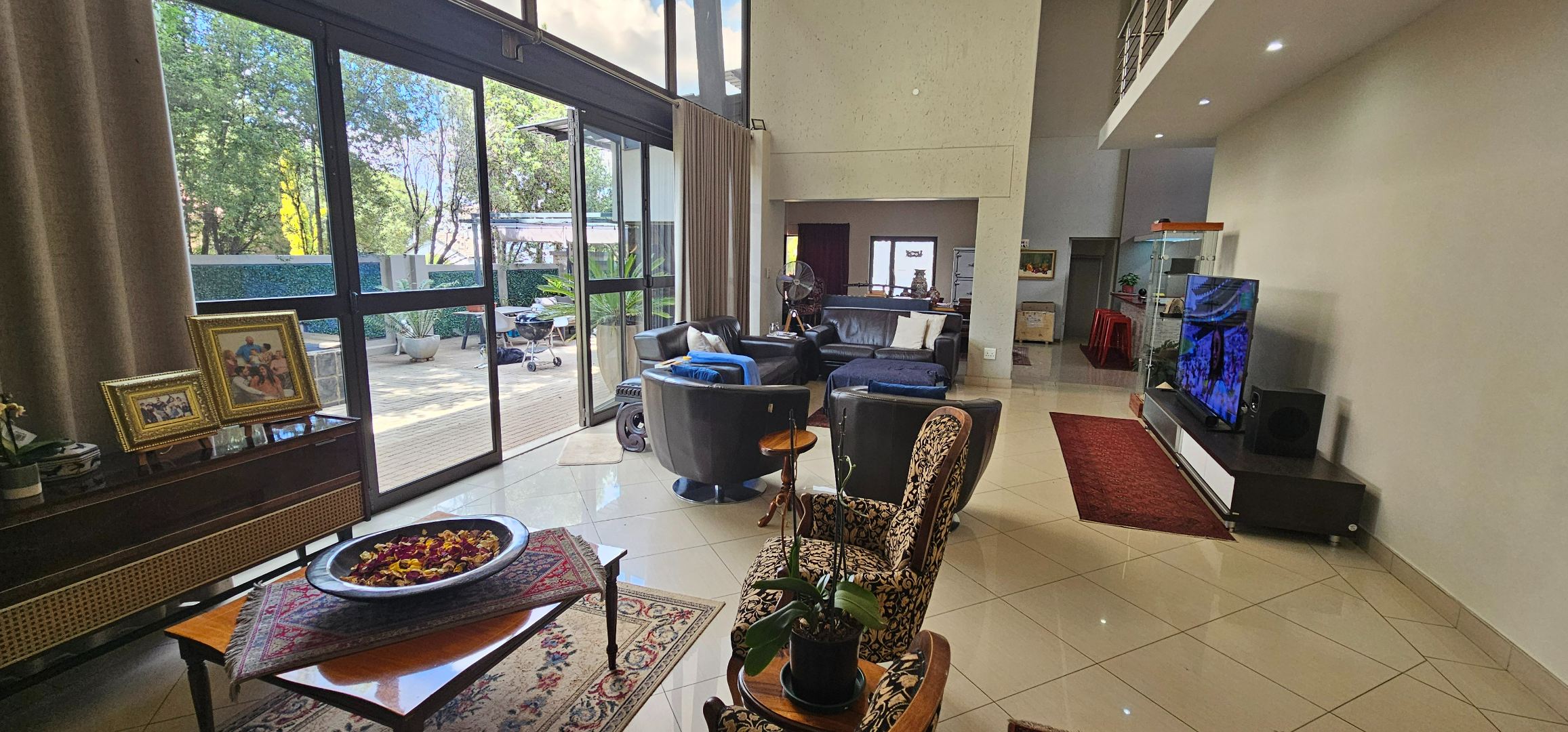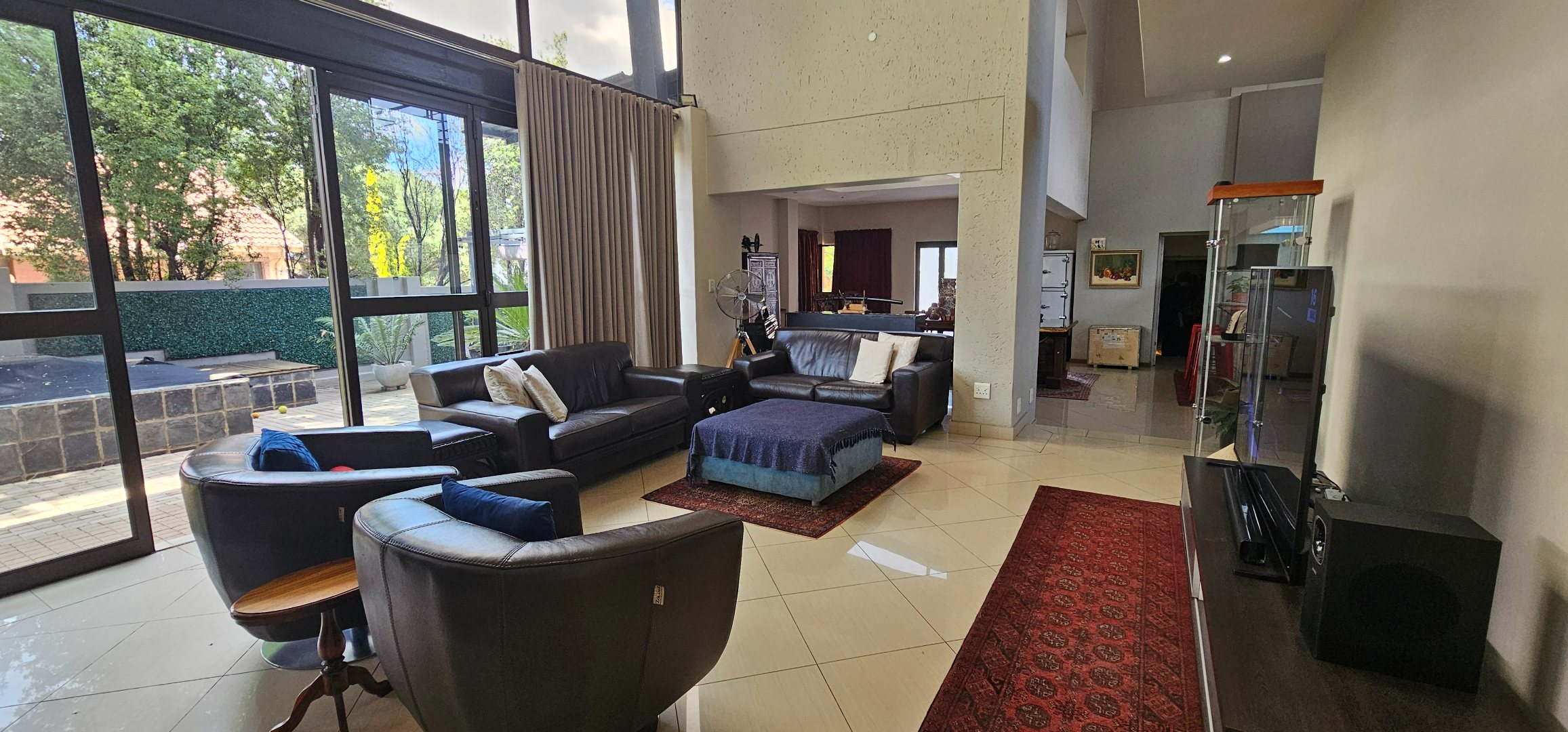 Glass doors open onto a landscaped garden designed for tranquillity and relaxation. A koi pond and mature greenery create a serene outdoor setting, ideal for quiet mornings, relaxed entertaining, or evening enjoyment on the covered patio.