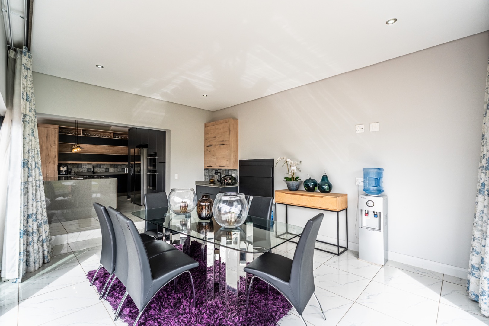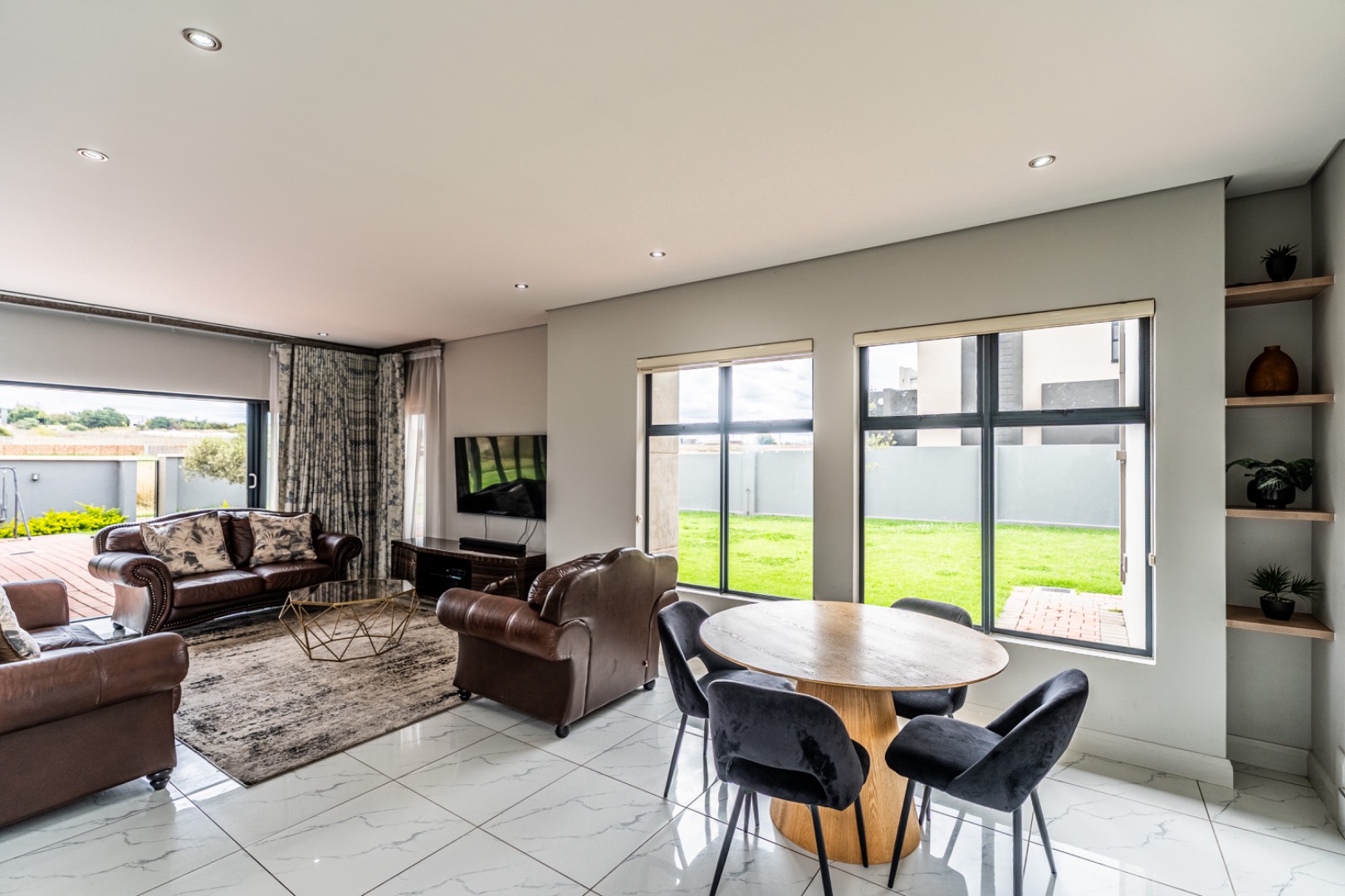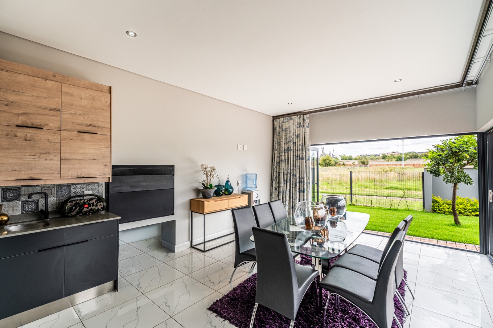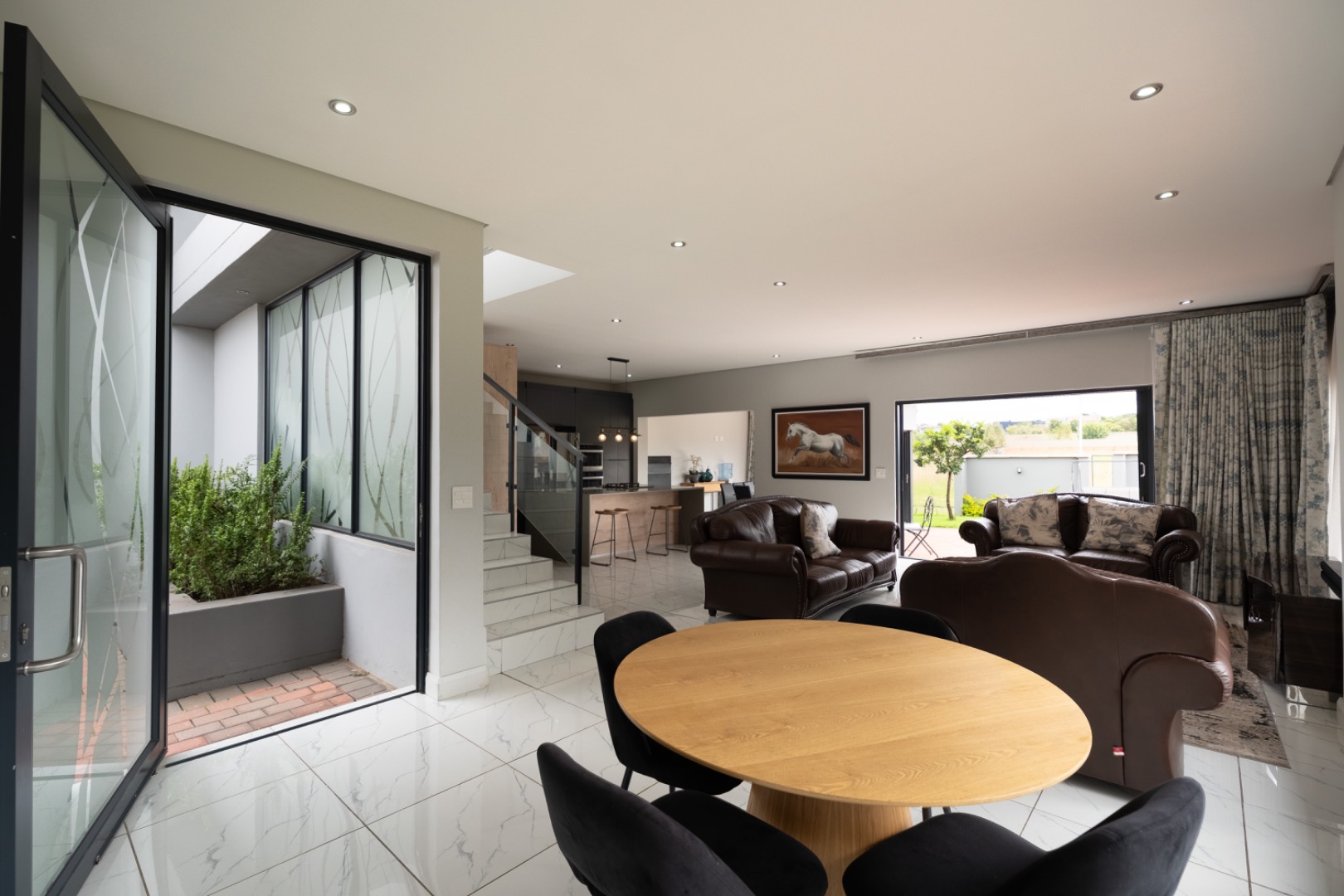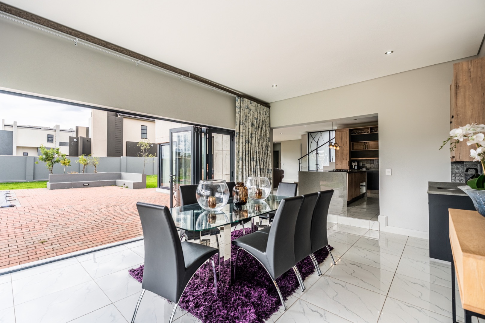 - Open-plan dining and lounge area seamlessly connects to an enclosed patio, complete with stacker doors that open onto a large stand. Enjoy the sparkling pool, boma area, and a built-in braai for all-season entertainment.