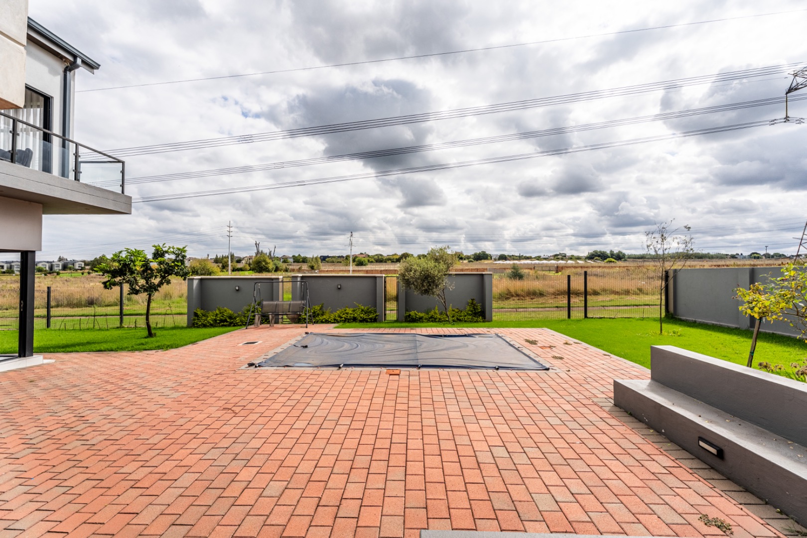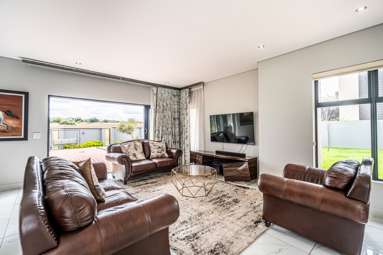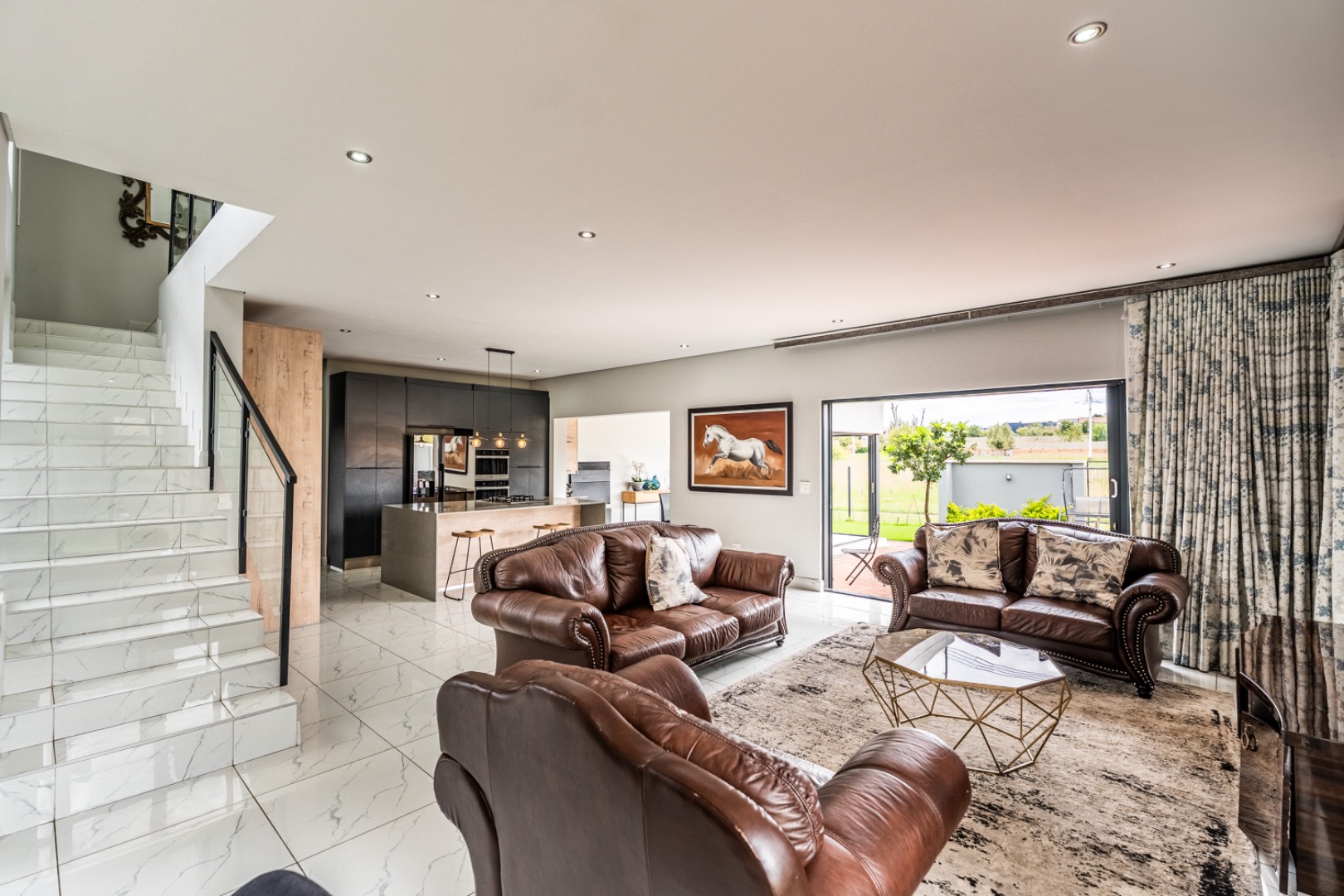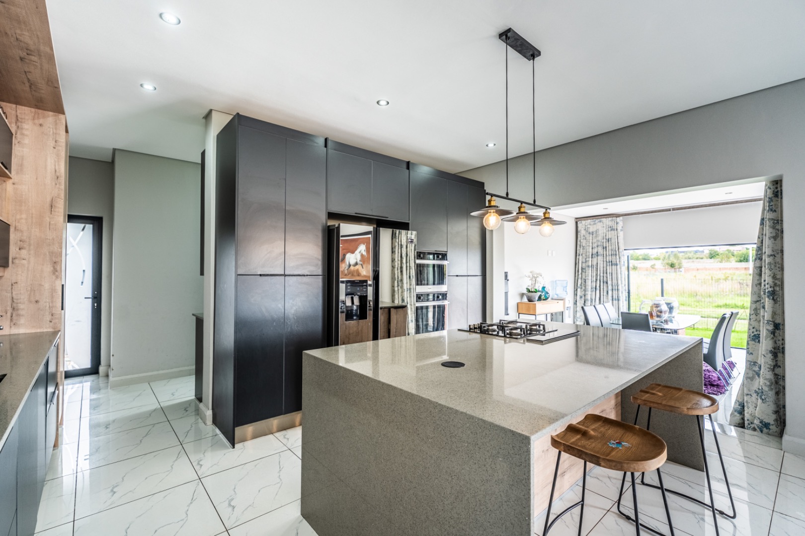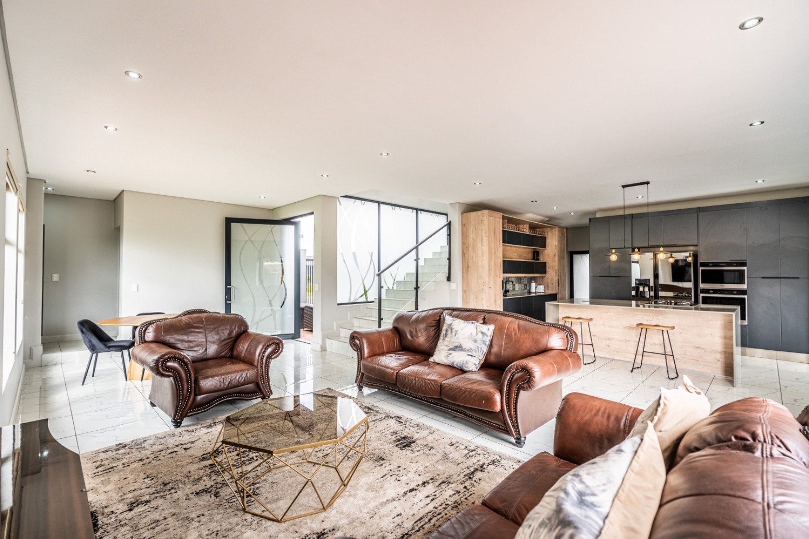 - Open-plan dining and lounge area seamlessly connects to an enclosed patio, complete with stacker doors that open onto a large stand. Enjoy the sparkling pool, boma area, and a built-in braai for all-season entertainment.