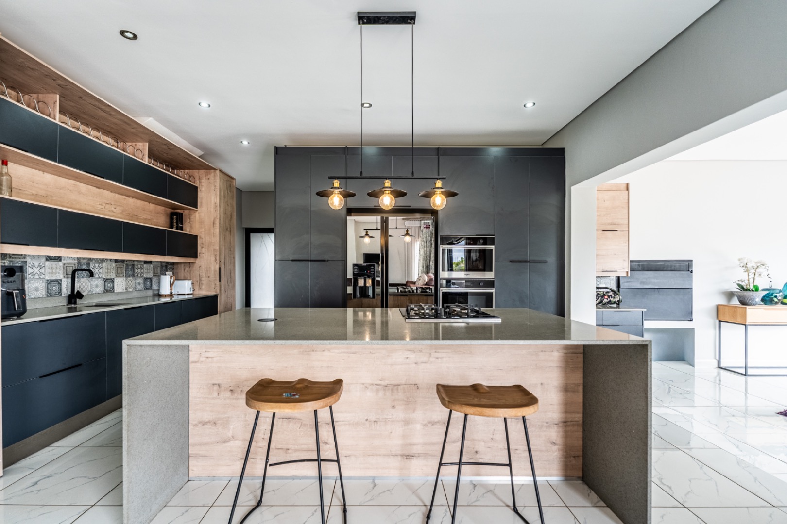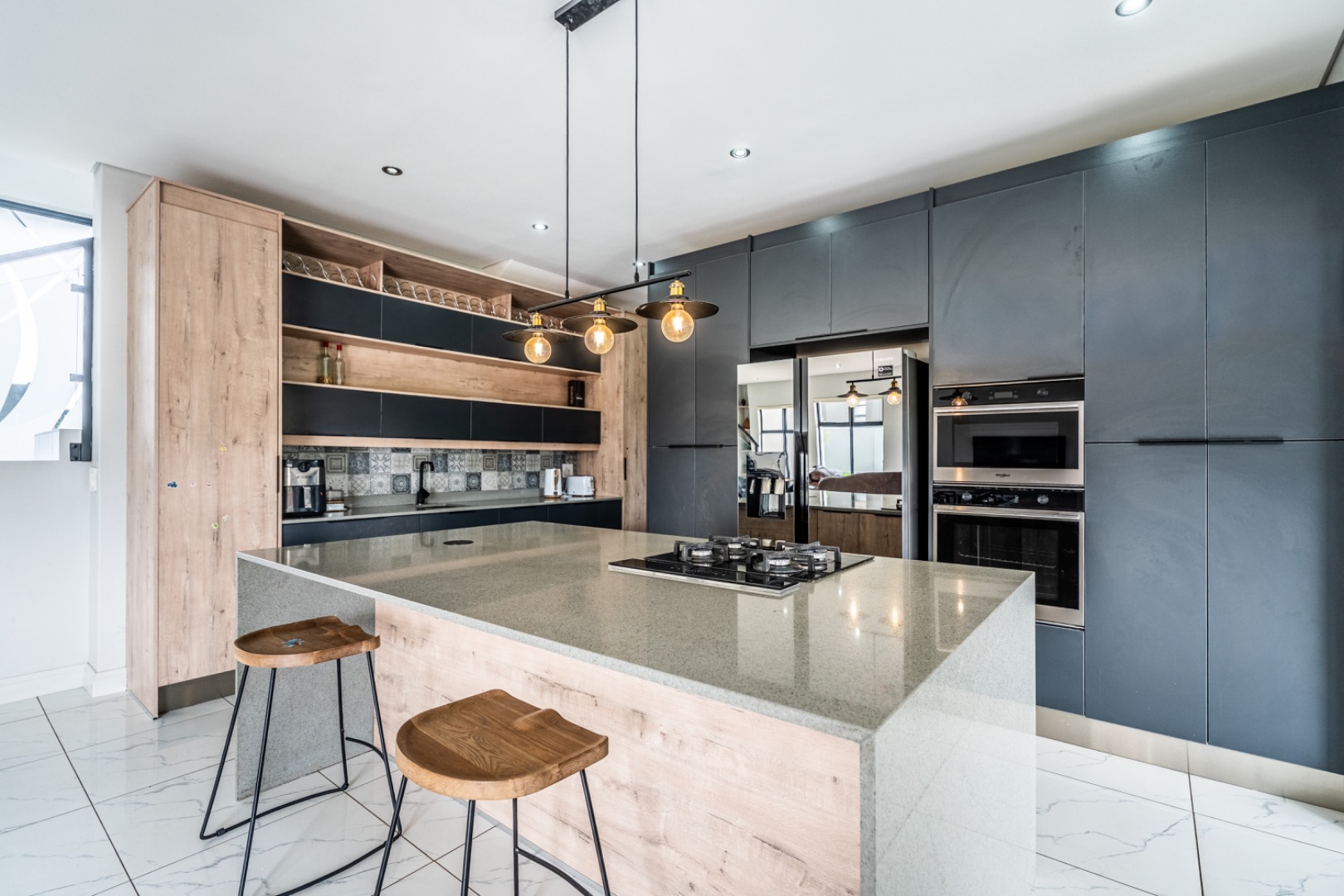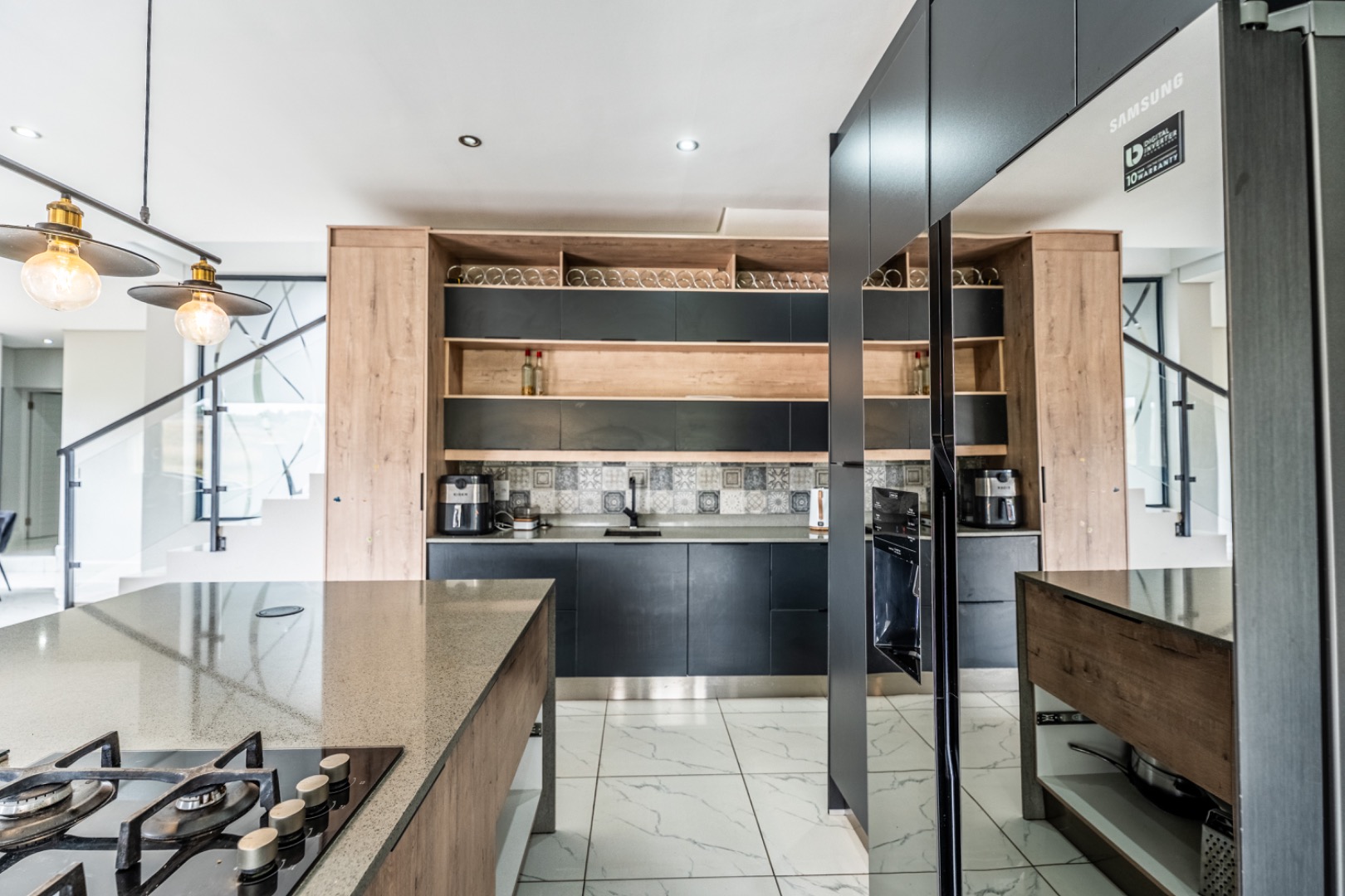 - The exquisite modern kitchen boasts ample cupboards, a breakfast nook, and a separate scullery accommodating three appliances.