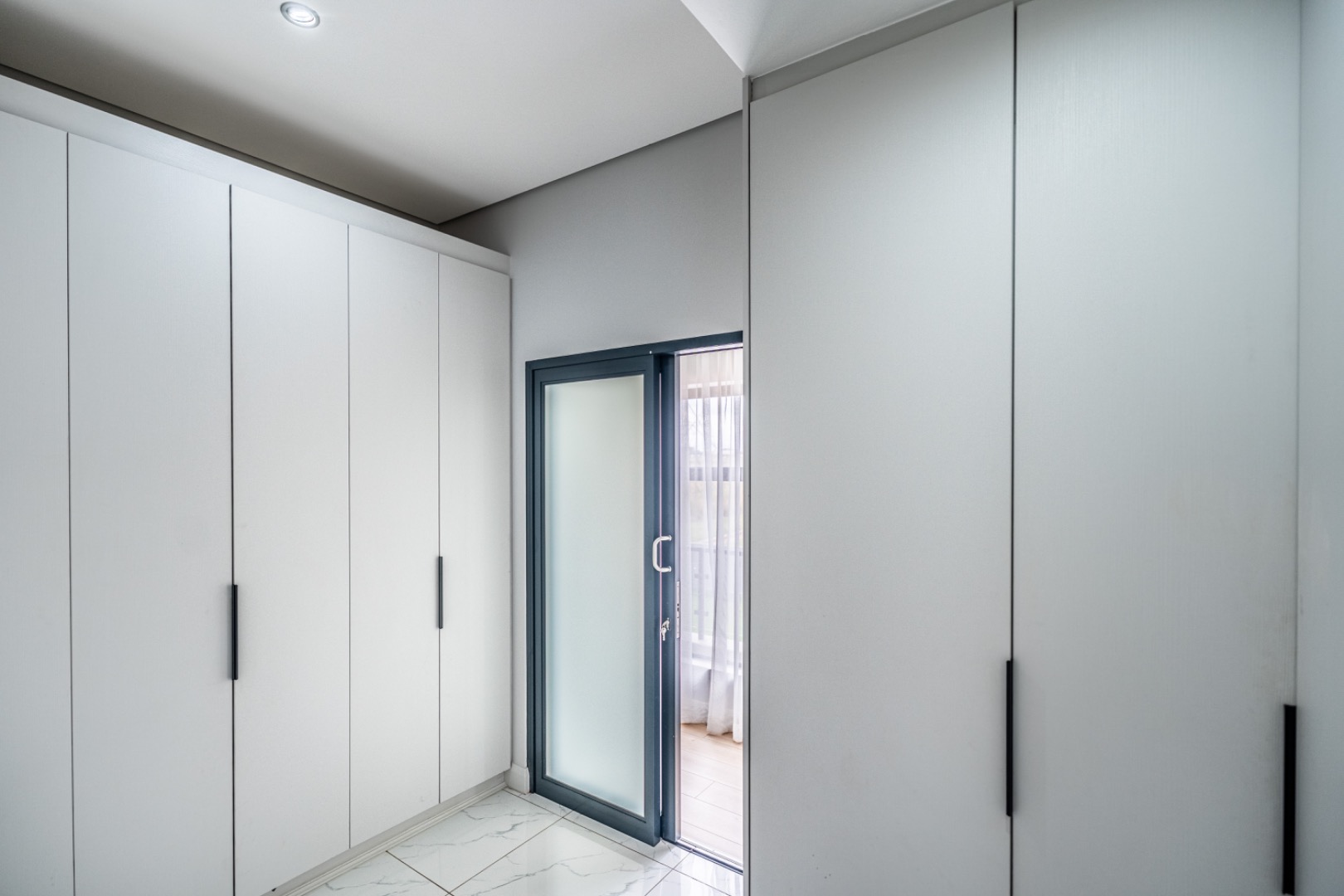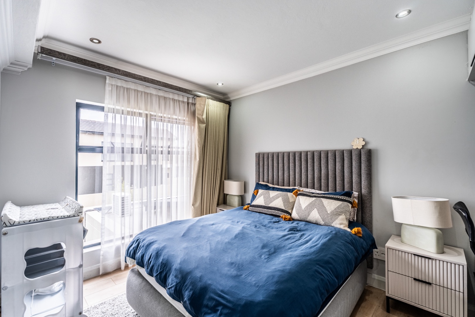 The main suite boast a custom-fitted walk-in wardrobe, luxurious ensuite full bathroom, aircon and sliding doors opening onto a balcony overlooking the garden and green area.
