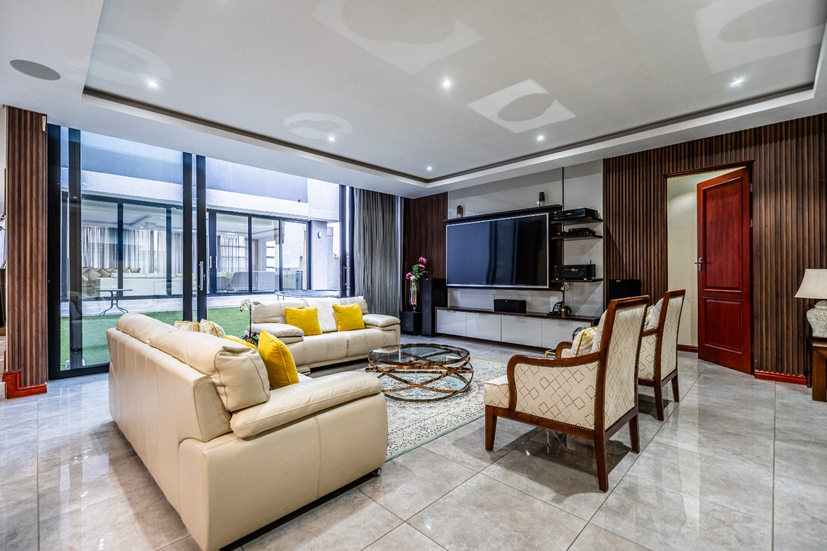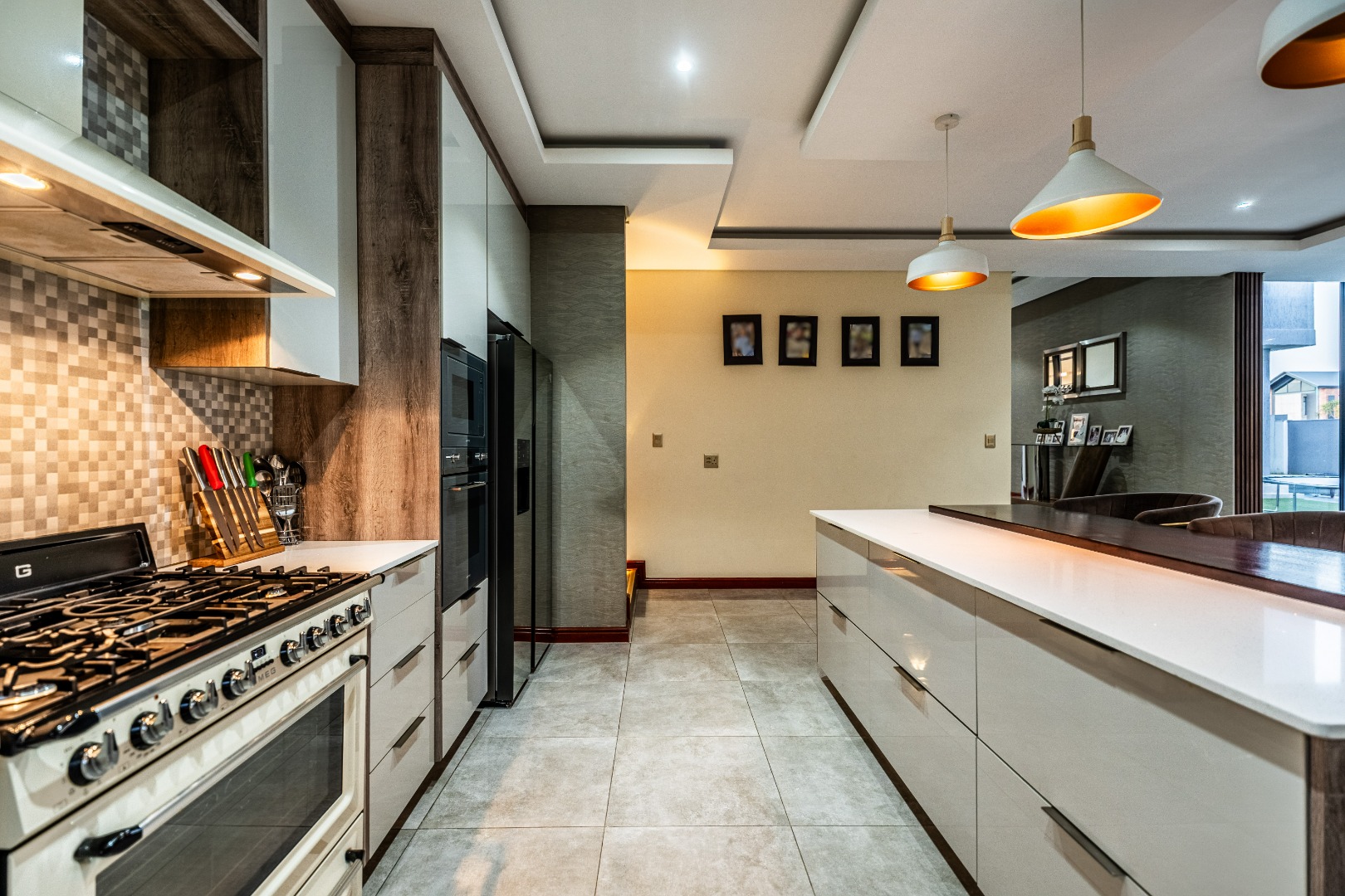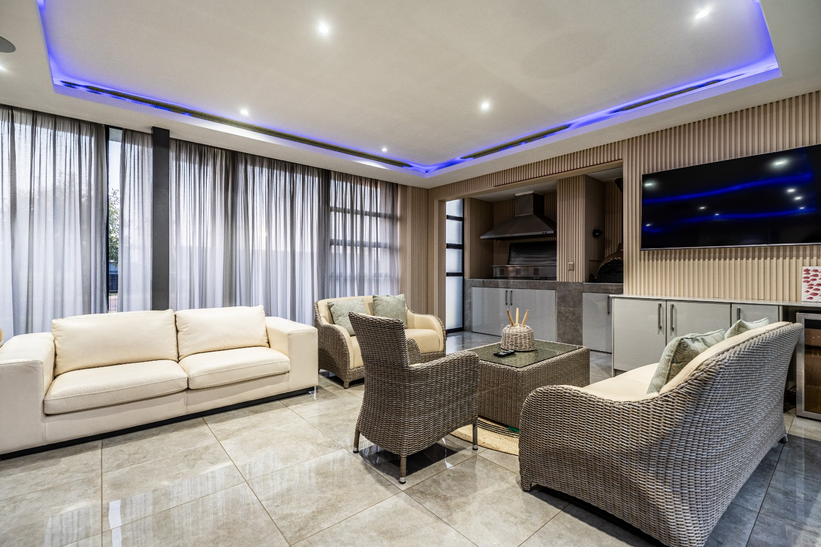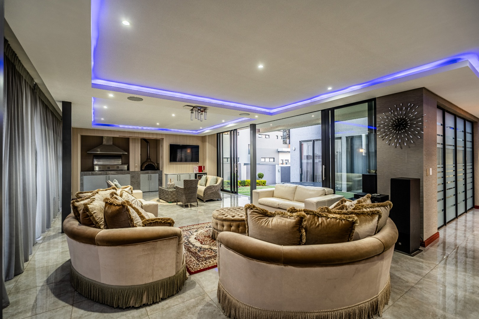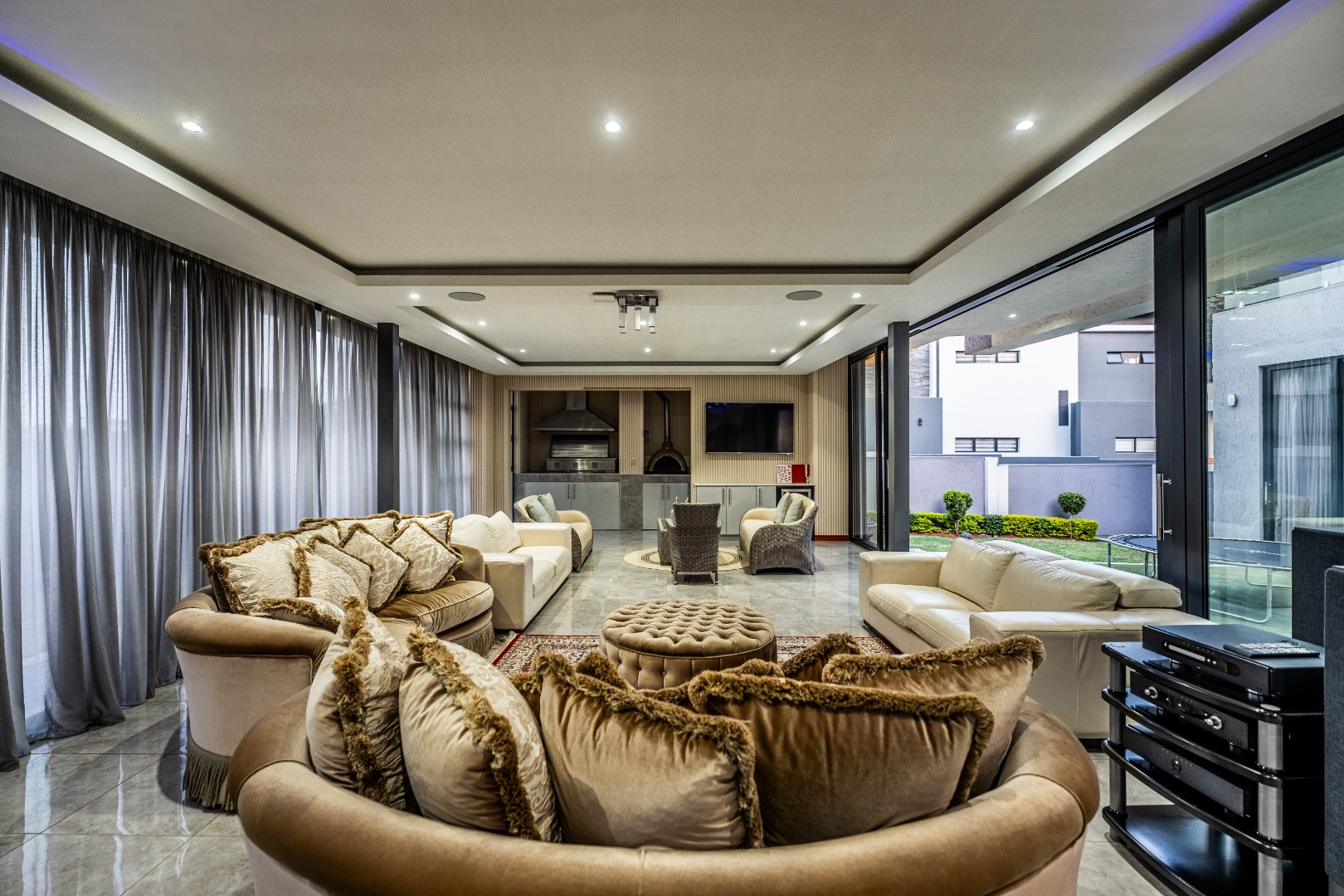 To the left of the entrance, an expansive entertainment area opens up — big enough to create two distinct living zones. Whether you're hosting weekend braais or pizza nights with friends, the built-in braai and pizza oven have you covered. Large stack doors connect the space to the garden, making indoor-outdoor living effortless.