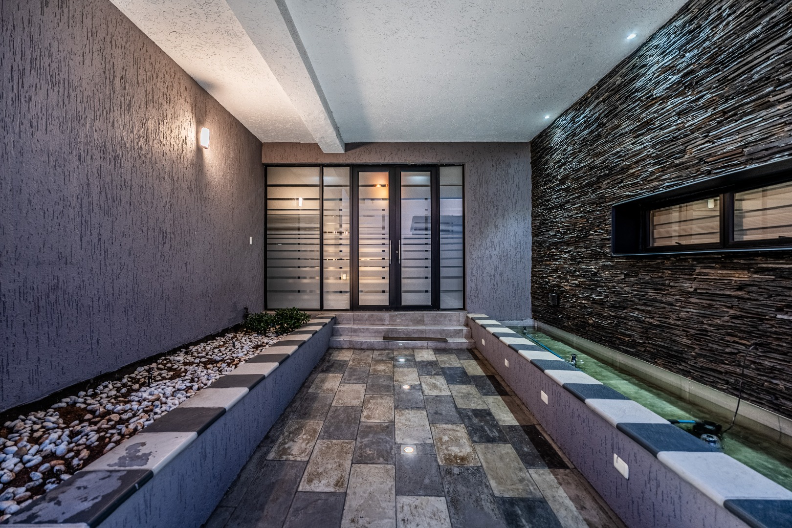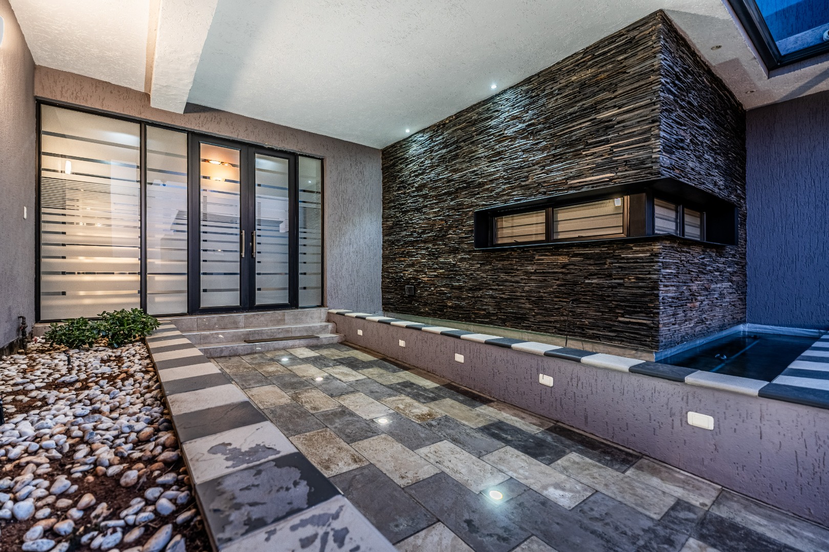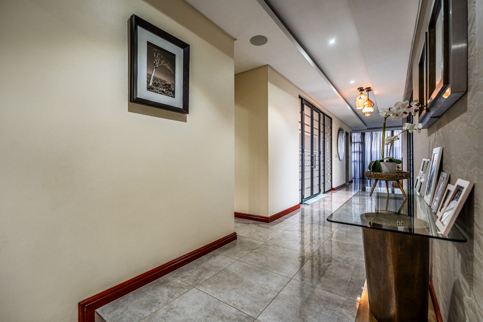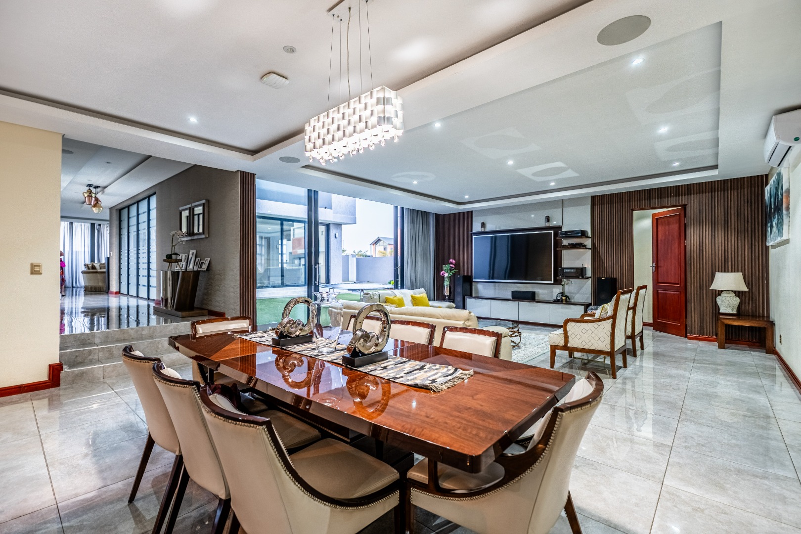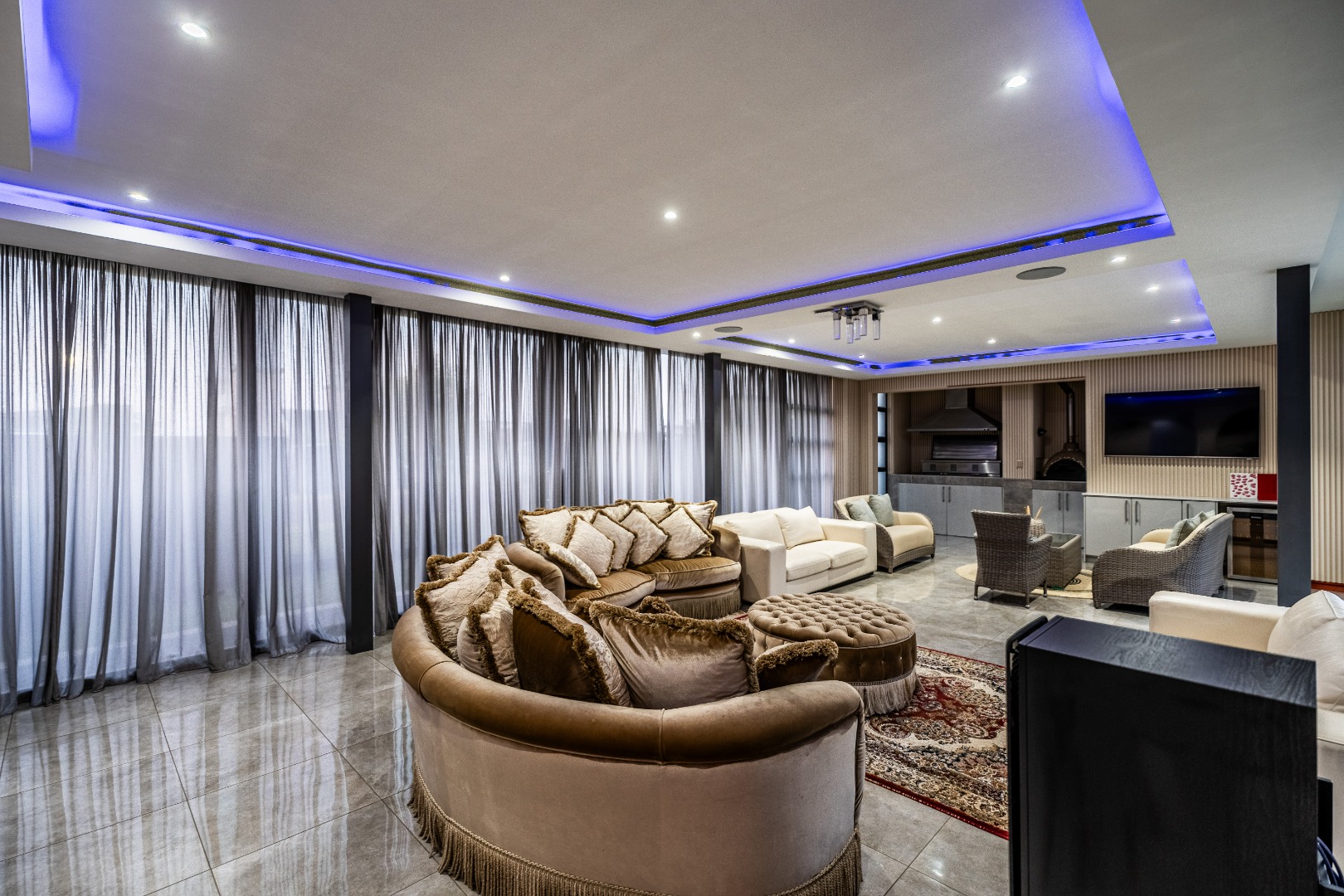 To the left of the entrance, an expansive entertainment area opens up — big enough to create two distinct living zones. Whether you're hosting weekend braais or pizza nights with friends, the built-in braai and pizza oven have you covered. Large stack doors connect the space to the garden, making indoor-outdoor living effortless.