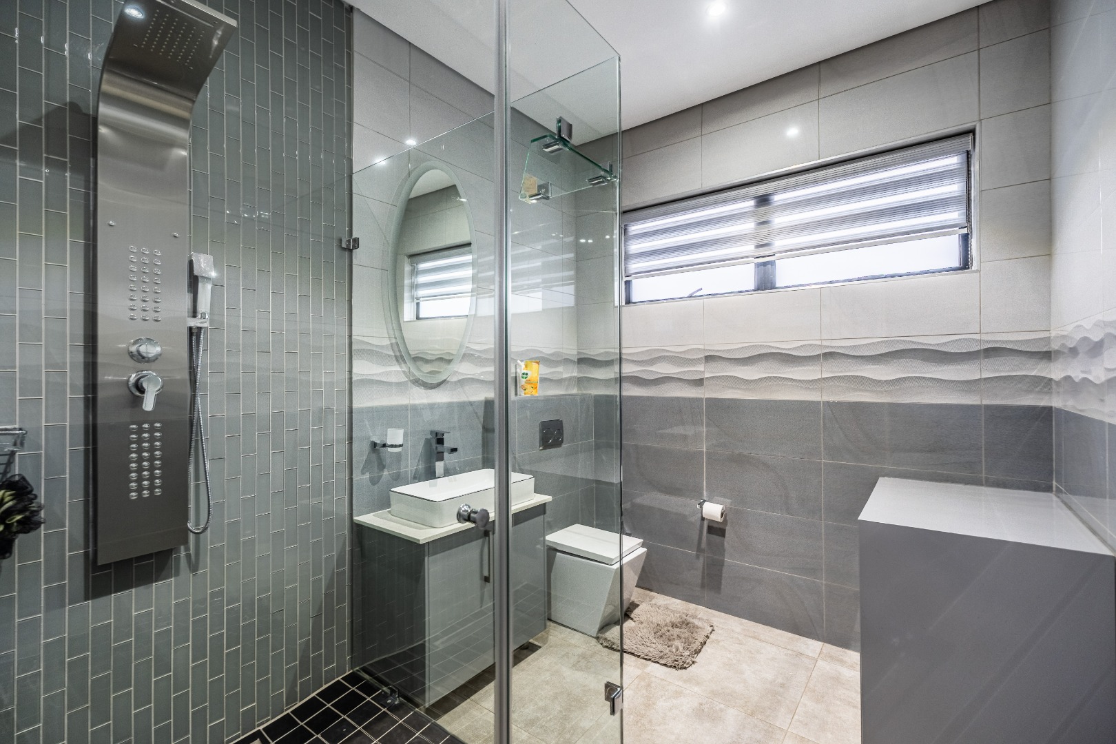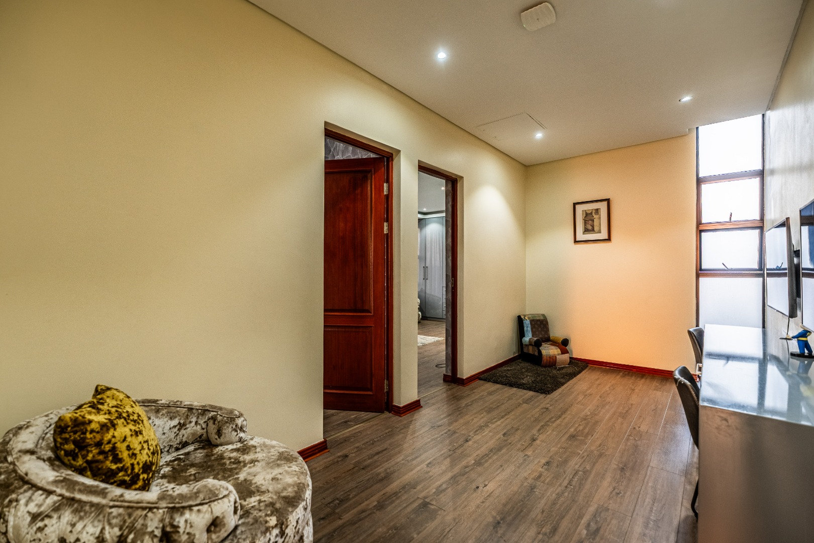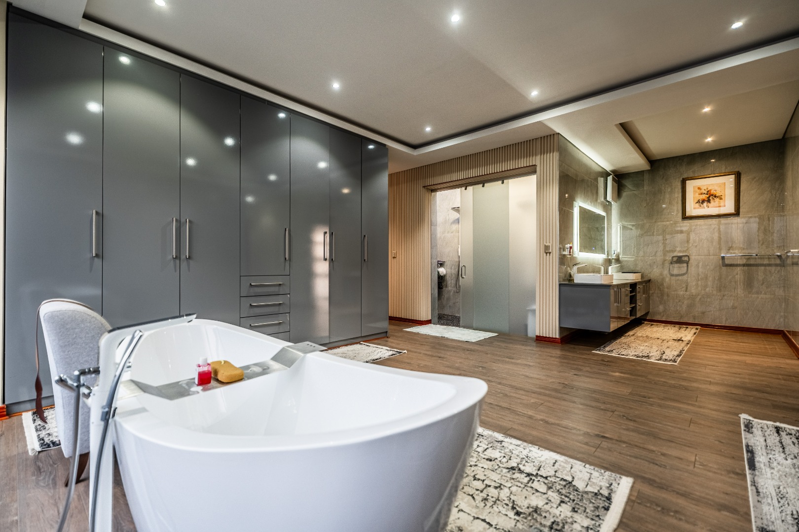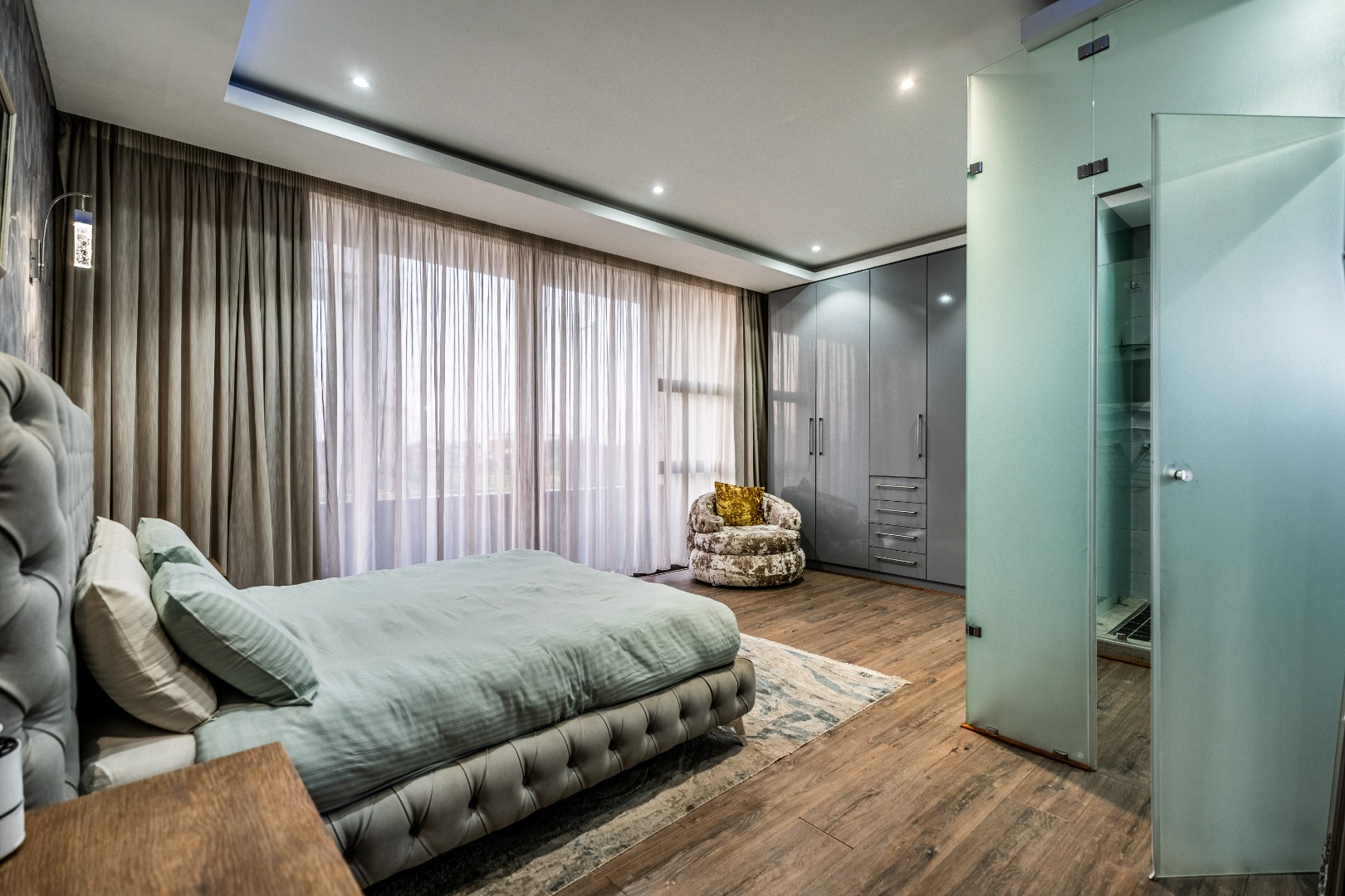 The main bedroom is your personal retreat, featuring loads of cupboard space and a double shower under a skylight that brings in gorgeous natural light — giving you that spa-like feel every morning. Two more ensuite bedrooms plus a flexible playroom or study area round off the upstairs perfectly.