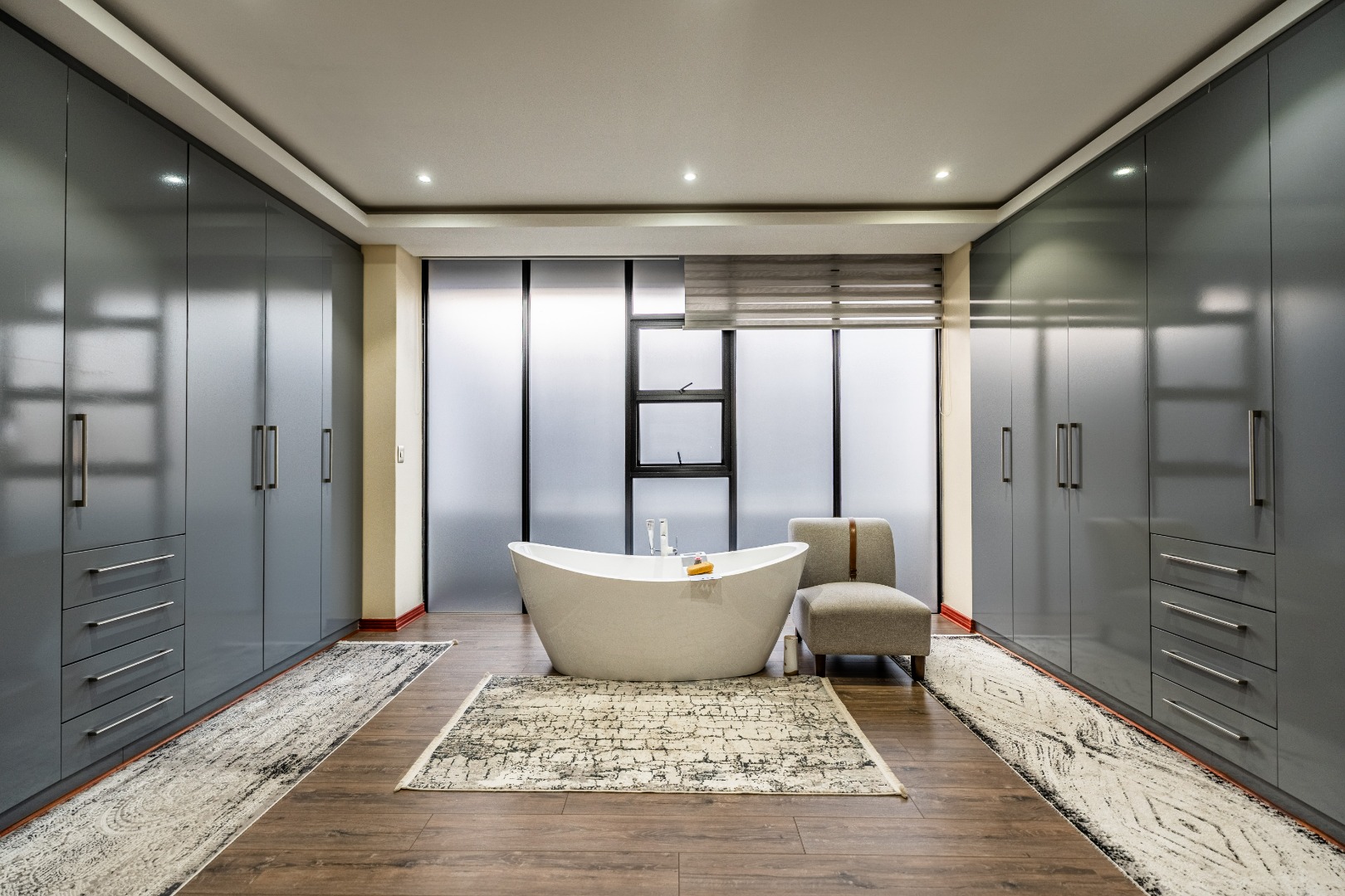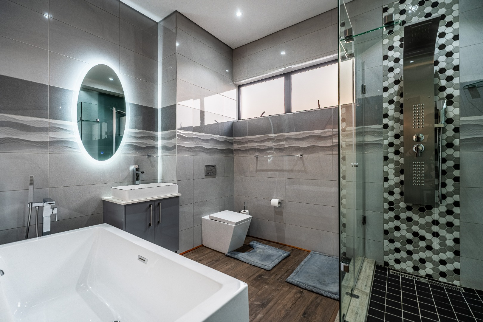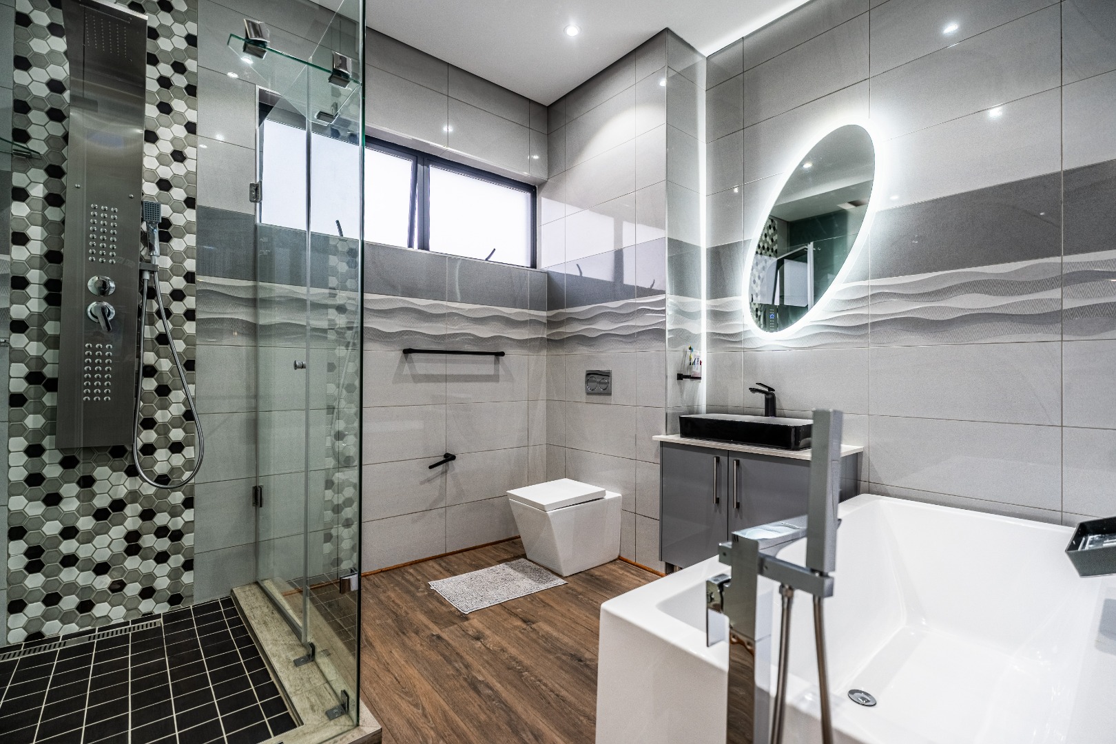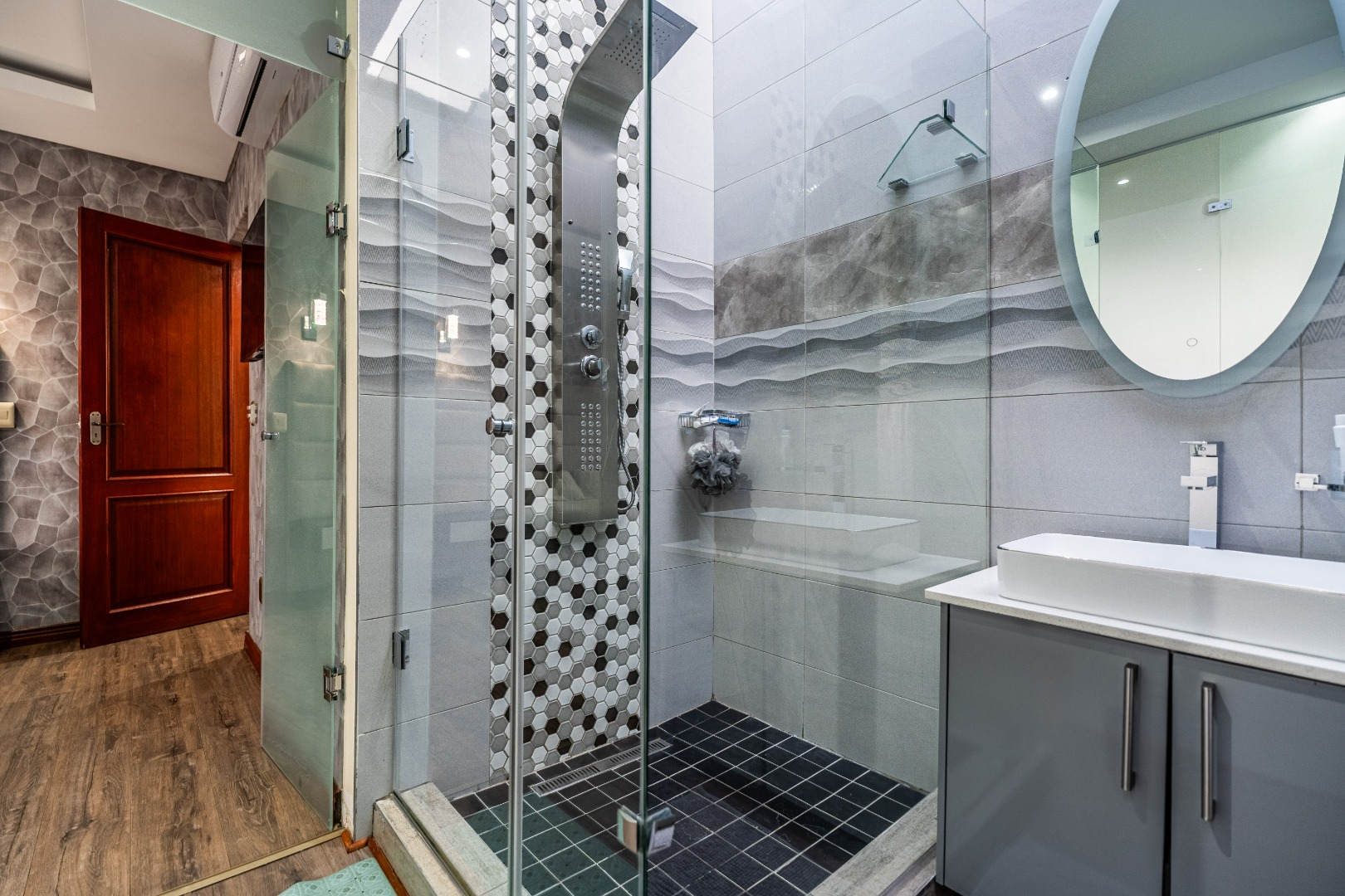 The main bedroom is your personal retreat, featuring loads of cupboard space and a double shower under a skylight that brings in gorgeous natural light — giving you that spa-like feel every morning. Two more ensuite bedrooms plus a flexible playroom or study area round off the upstairs perfectly.