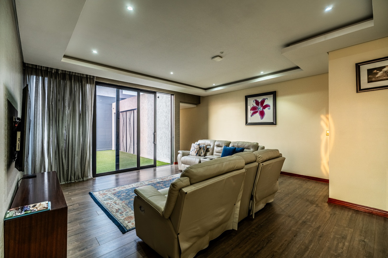 Head upstairs to the cozy family lounge that opens out onto a large patio with low-maintenance synthetic grass — a safe spot for kids to play while you kick back and relax.