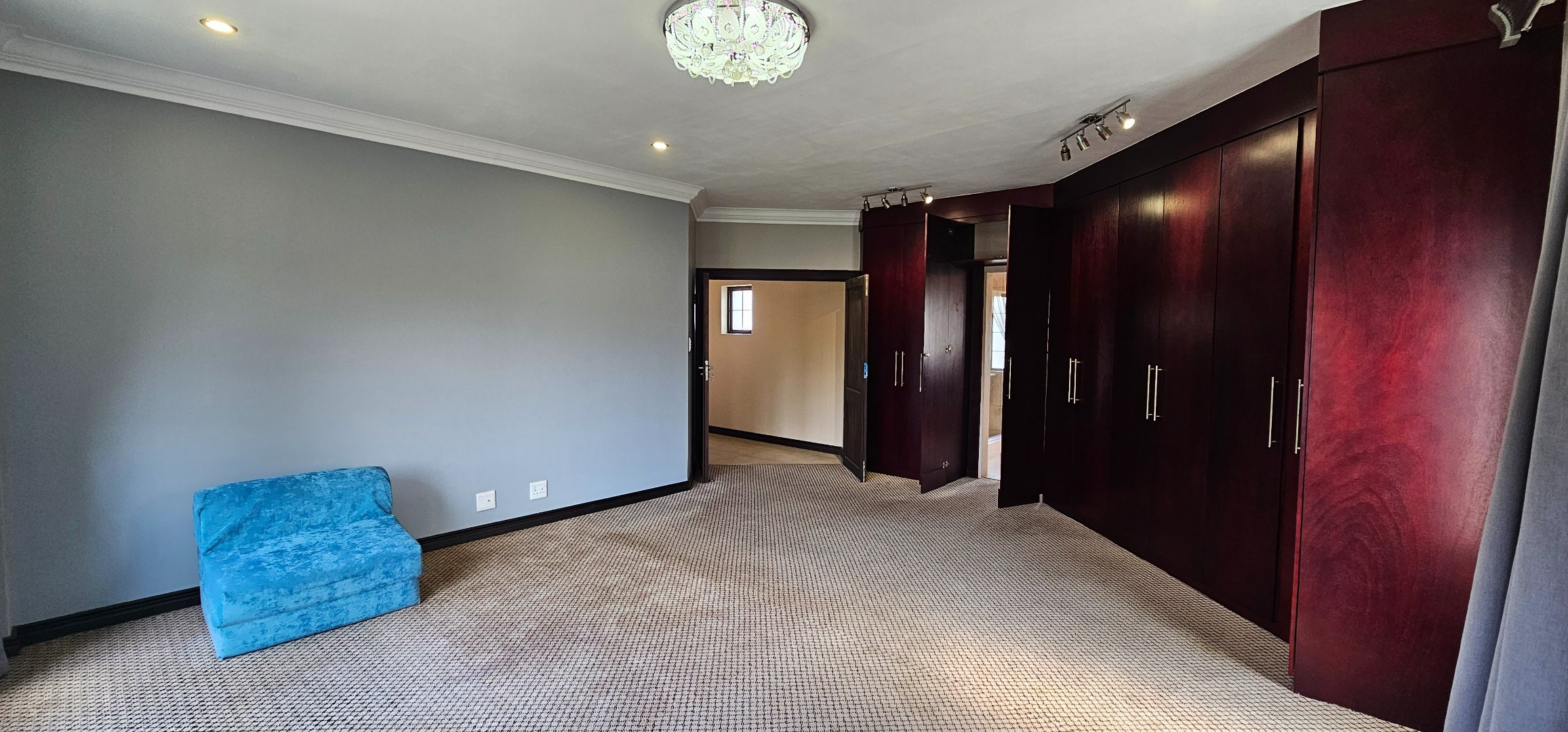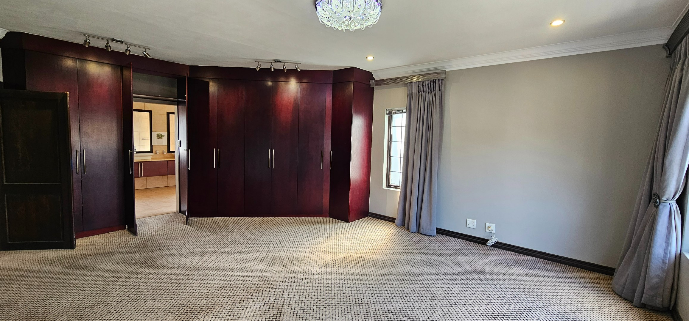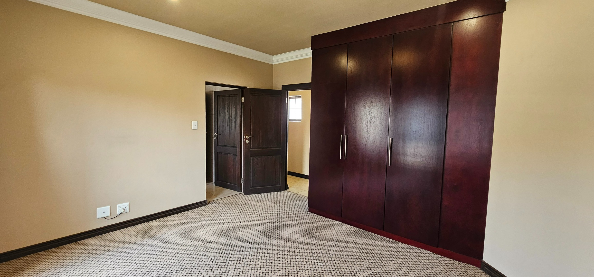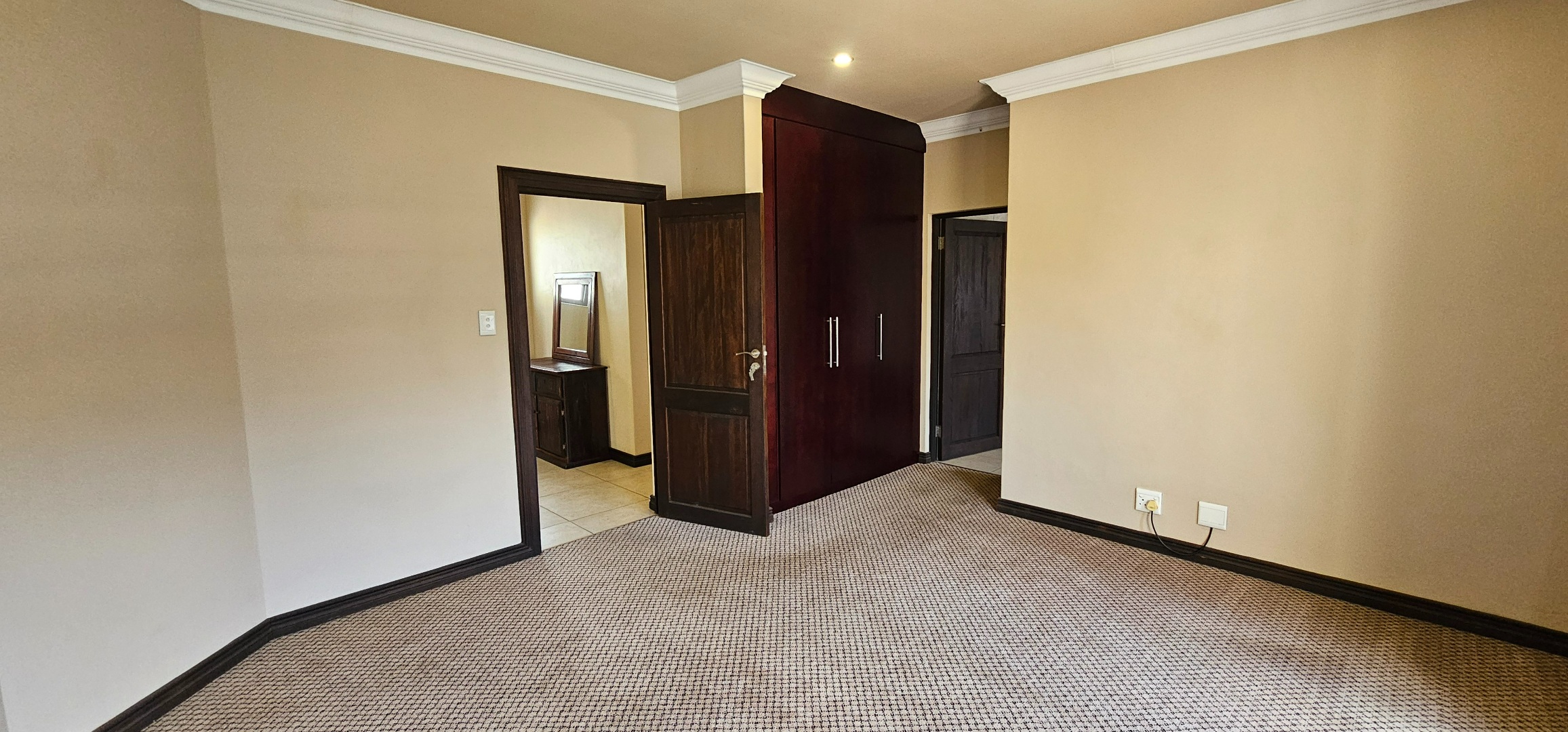 Luxurious main suite featuring ample cupboard space, a full en-suite bathroom, and a private balcony