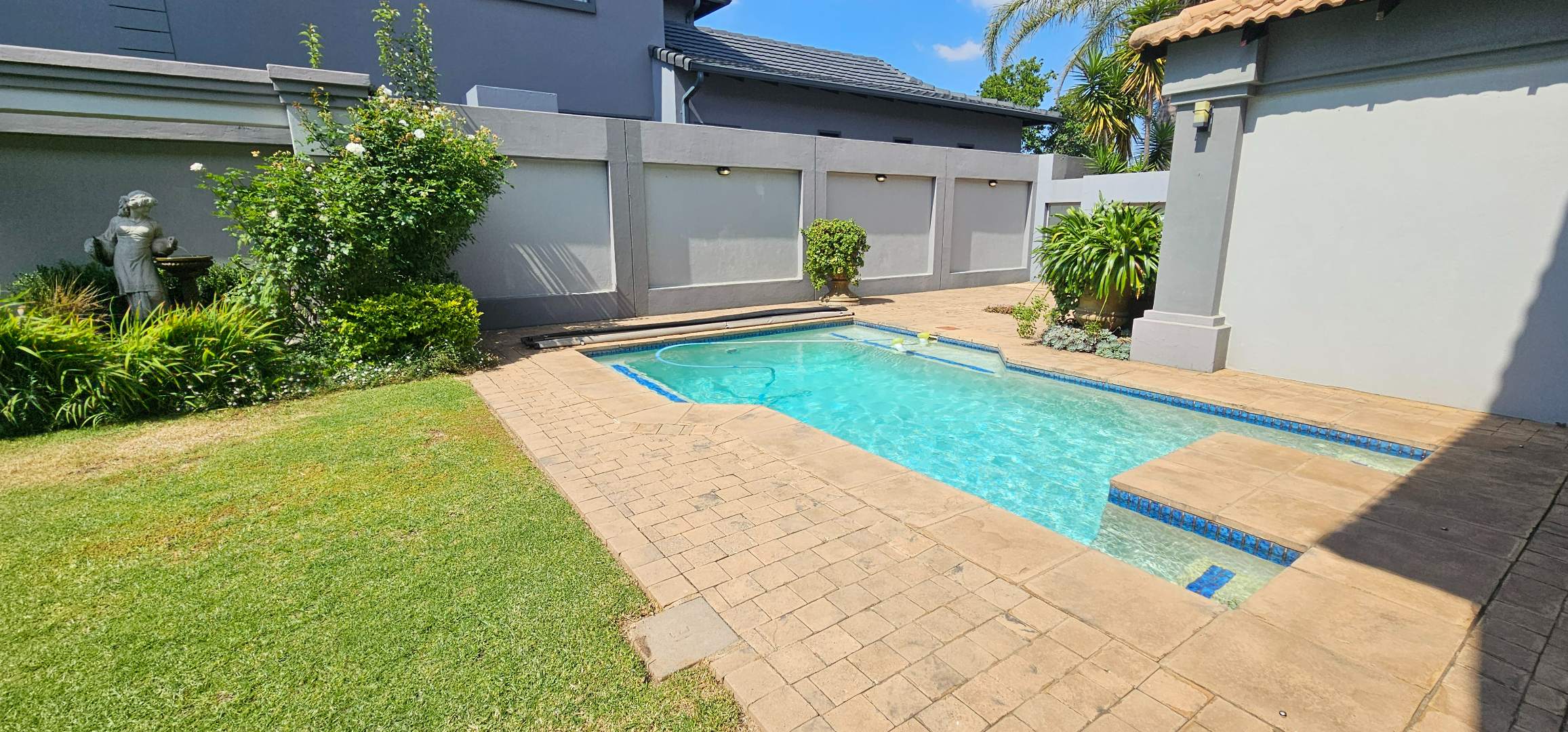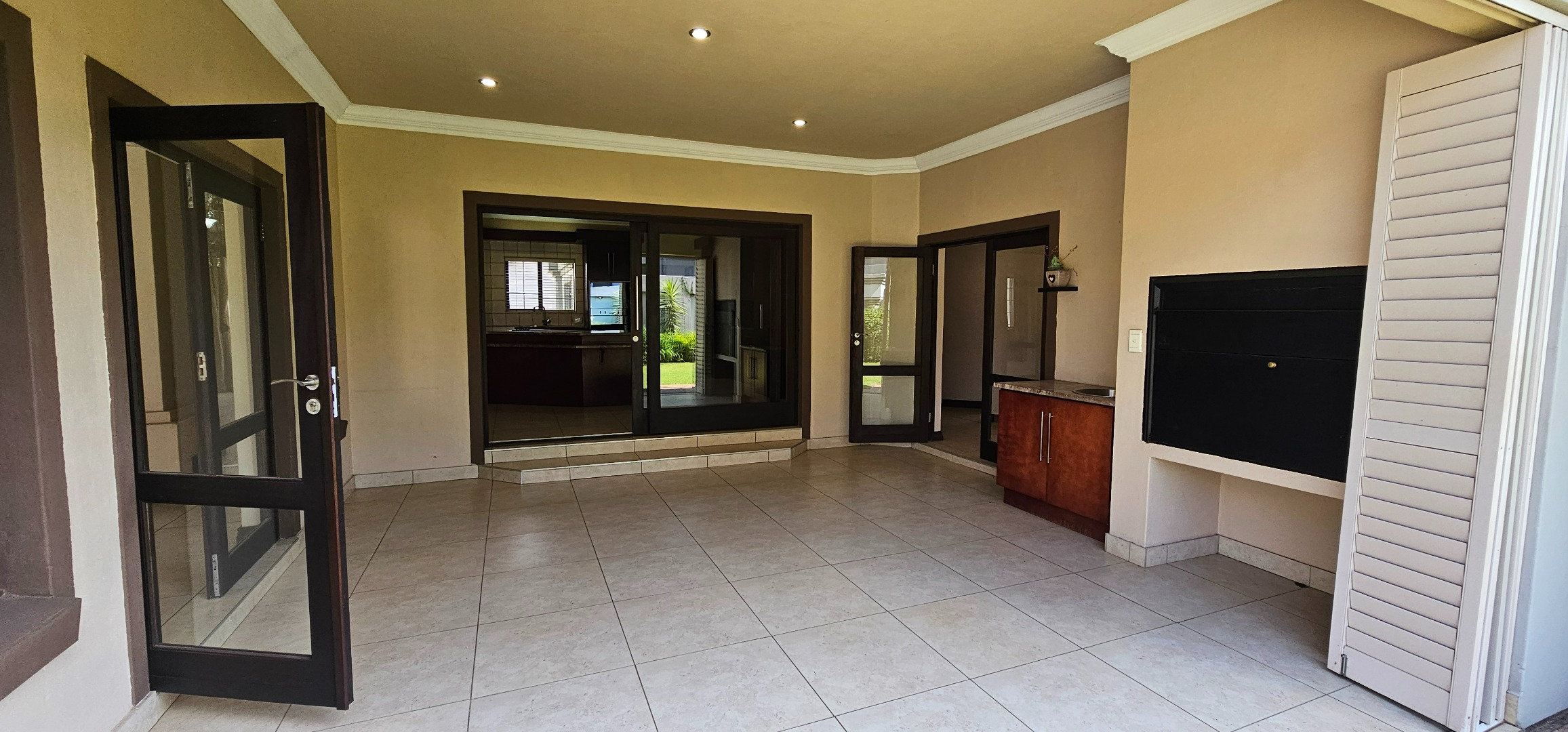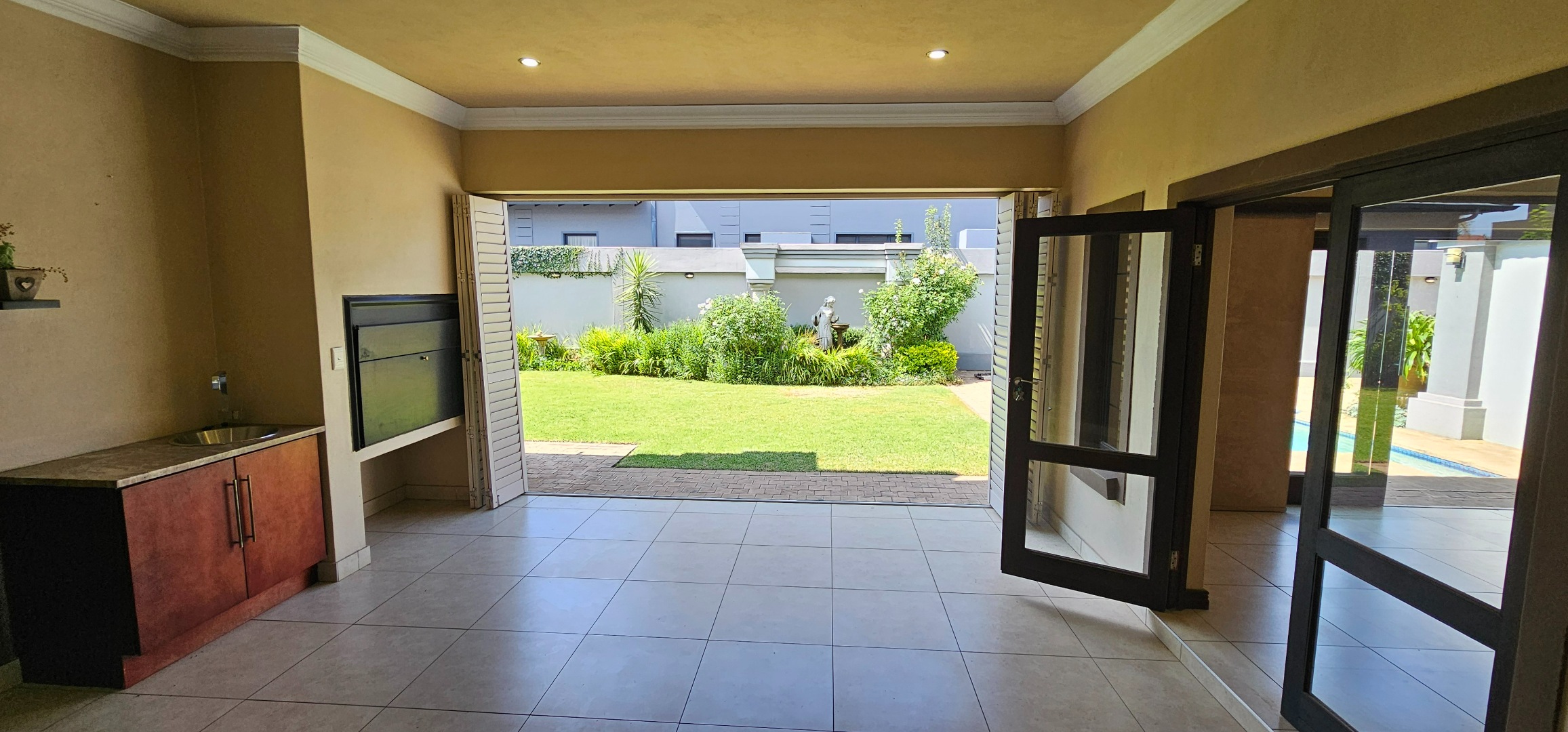 Enclosed entertainment patio with built-in braai, overlooking the manicured garden and heated swimming pool