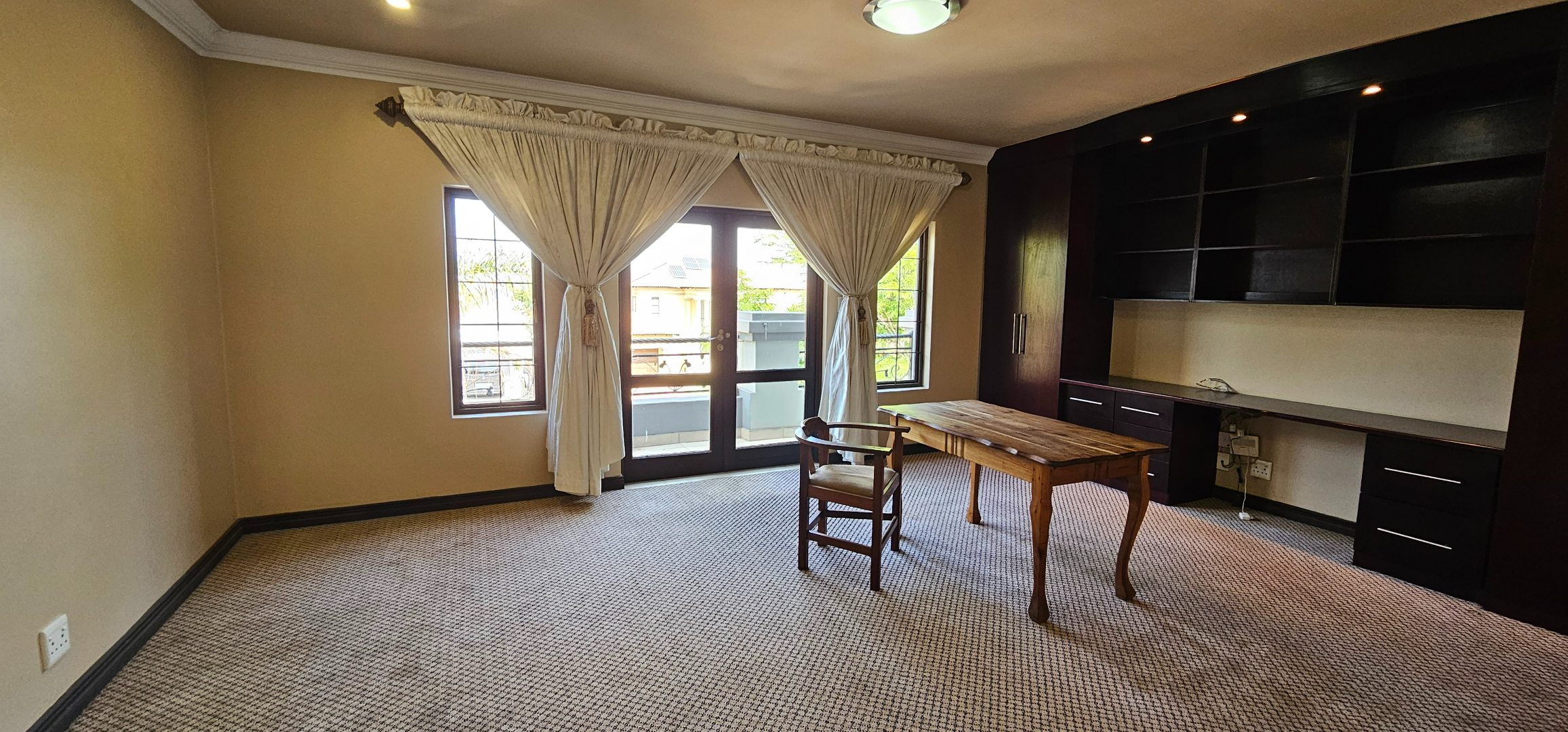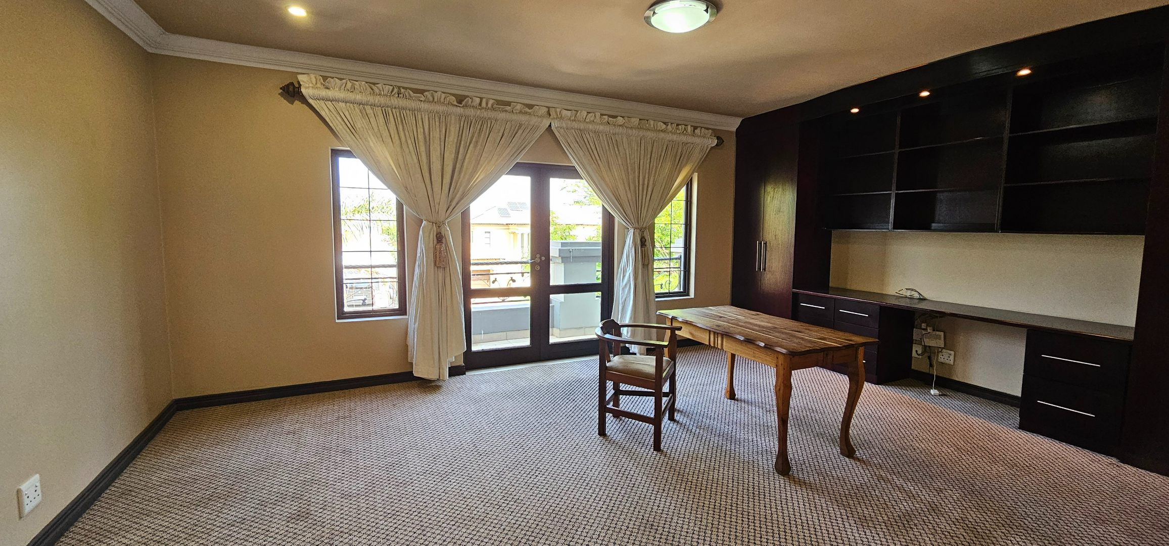 Third bedroom with en-suite bathroom, study nook, generous cupboards, and balcony—ideal as a large home office or guest suite