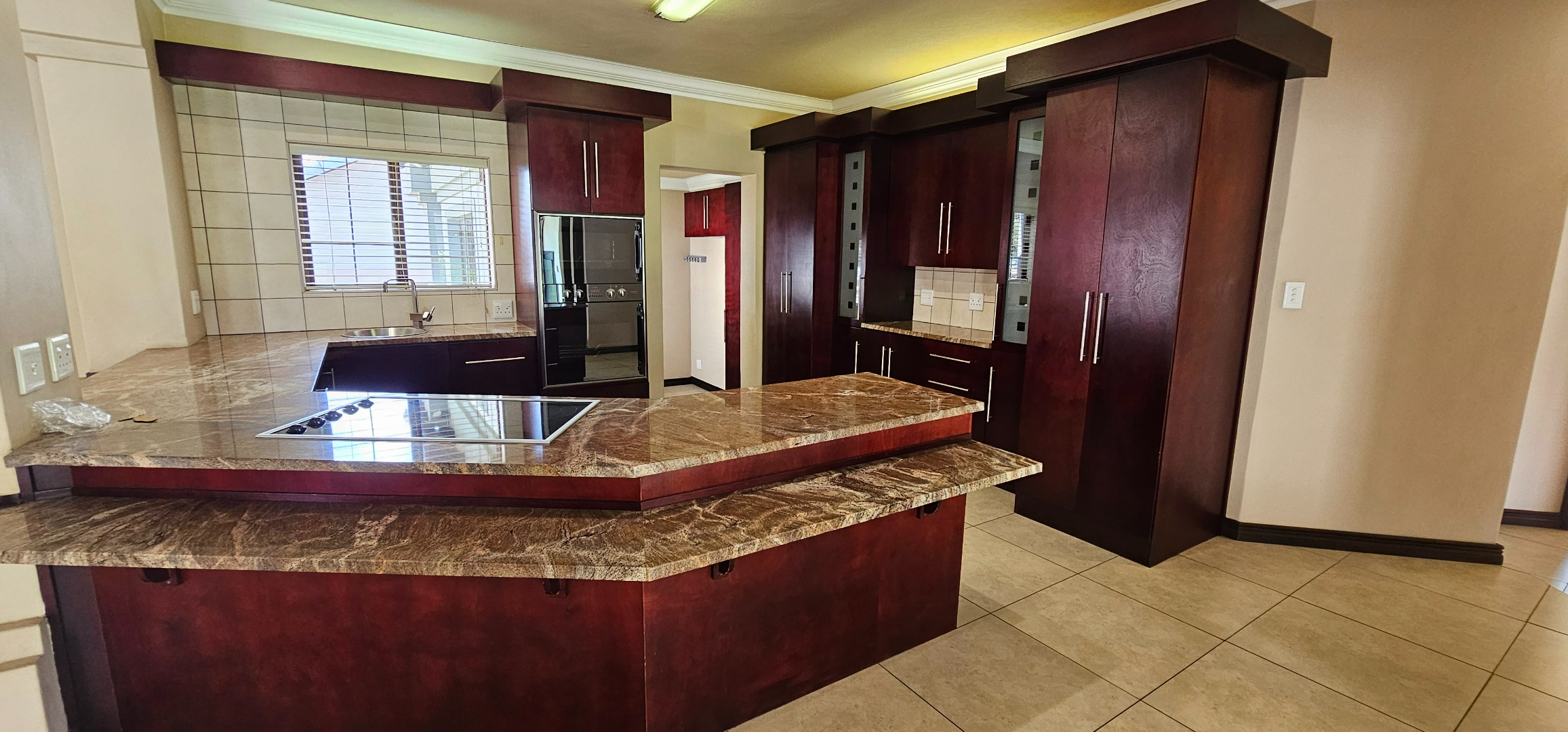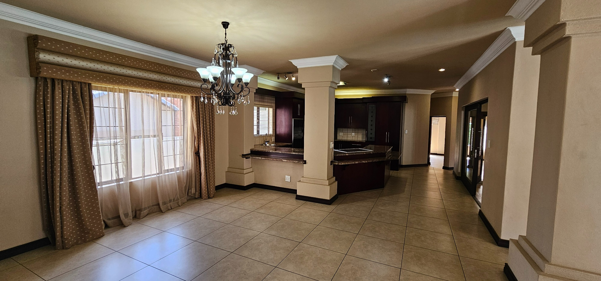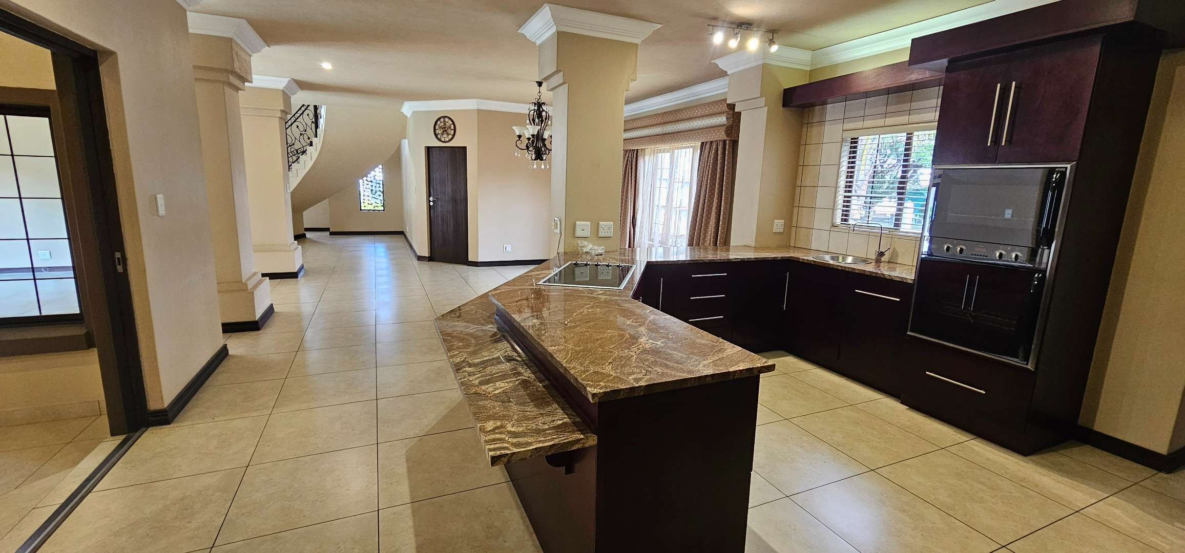 Expansive open-plan living comprising dining area, lounge, and a contemporary kitchen with granite finishes, oversized breakfast island, and separate scullery