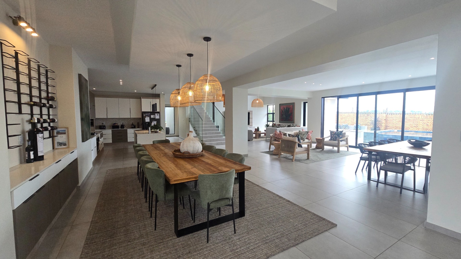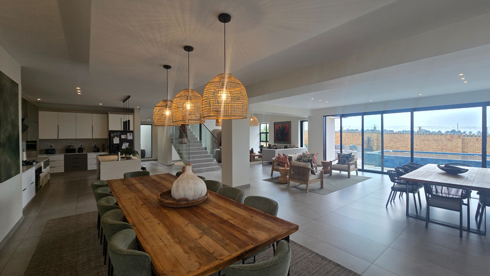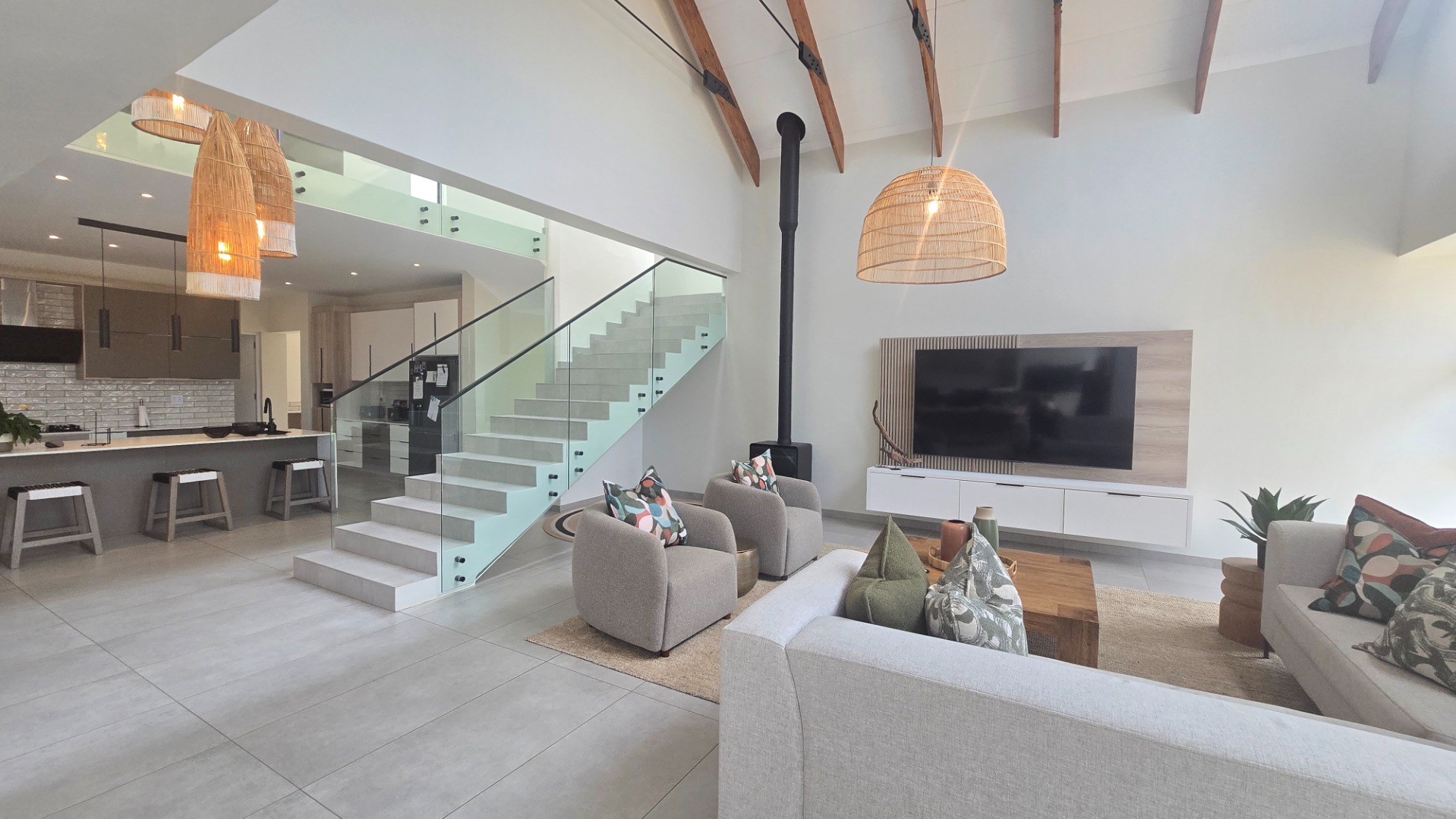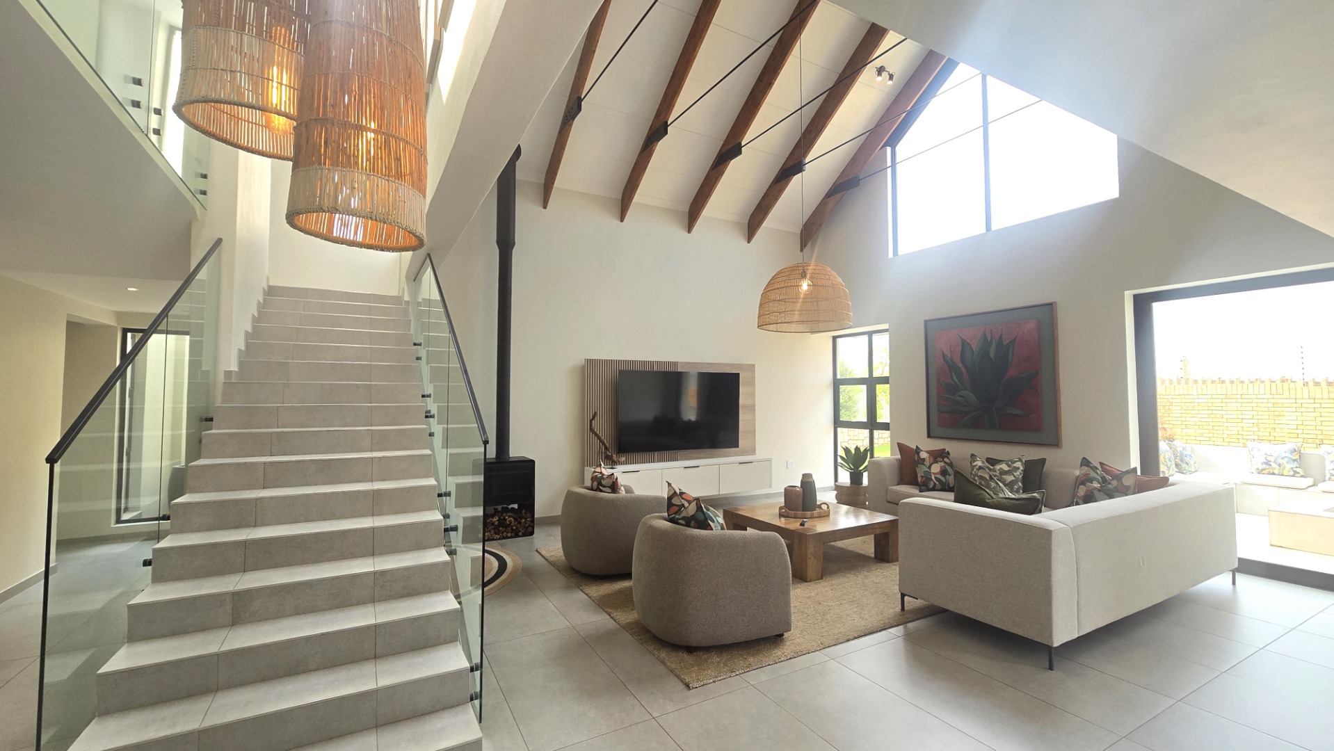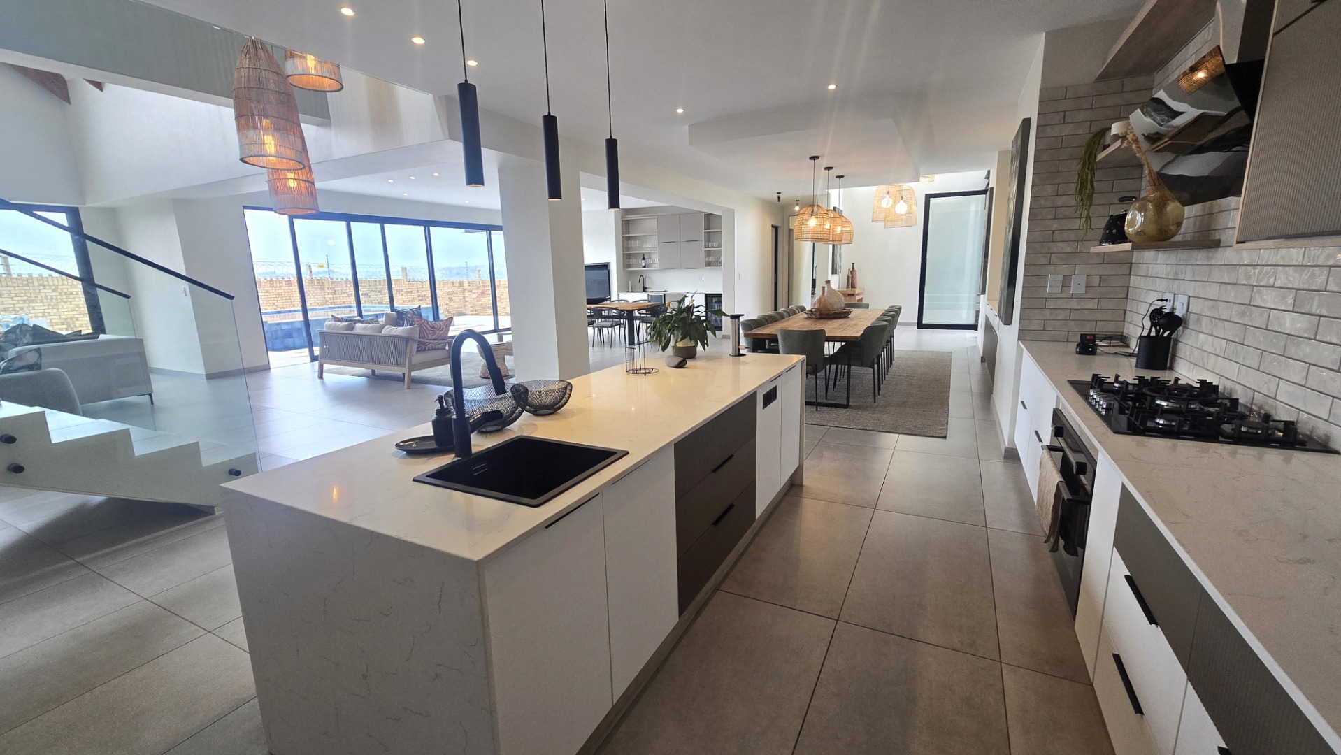 Inside, a spacious open-plan layout is designed for seamless living and entertaining. High vaulted ceilings with exposed wooden beams create an airy atmosphere, while large glass doors invite abundant natural light. The contemporary kitchen is a chef's delight, featuring a large island with seating, integrated appliances, and dedicated wine storage. Downstairs the dedicated dining room flows effortlessly to the TV lounge, enhanced by a sleek glass-paneled staircase and a contemporary fireplace. The entertainment area forms part of the open plan living space and includes space for a dining table and chairs, and a lounge suite. Also included in the entertainment area is a built in braai, built in cupboards, with a prep bowl. Five generously sized bedrooms, each with its own en-suite bathroom, ensure ultimate comfort and privacy. A dedicated study and staff quarters add practical convenience.