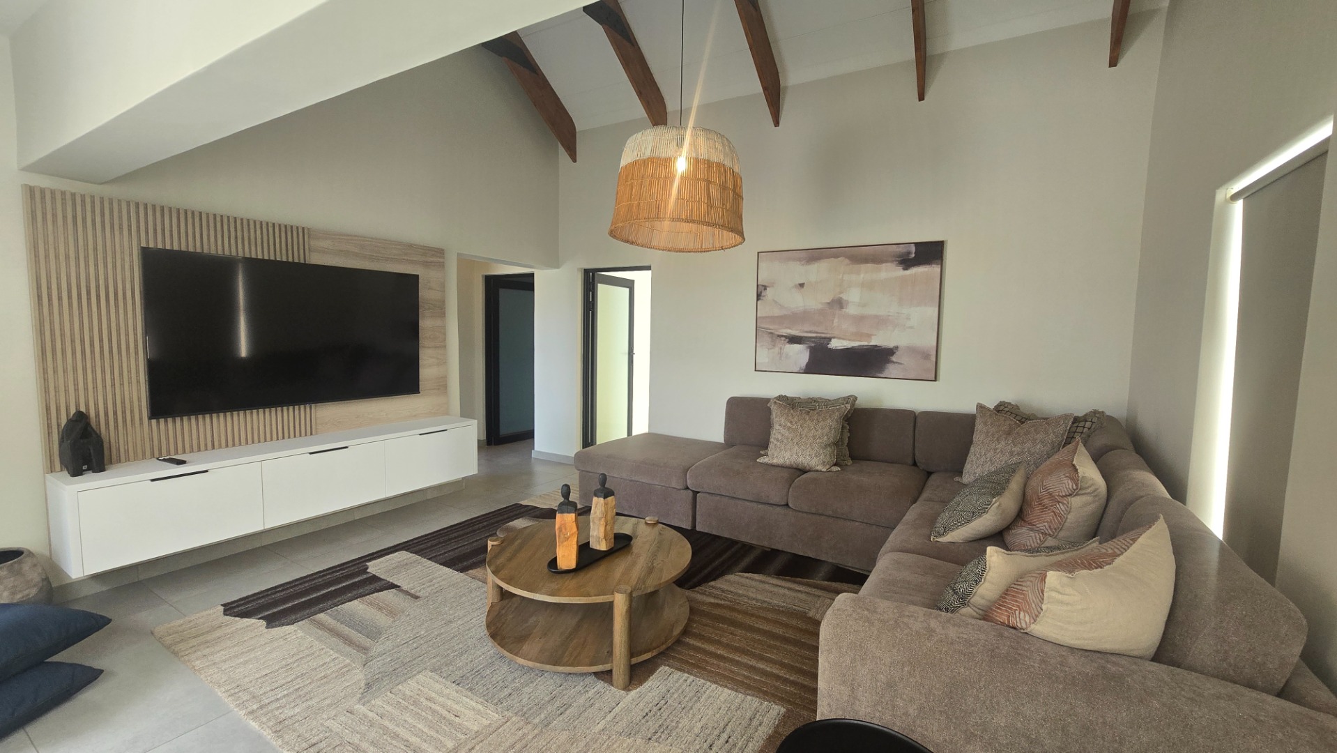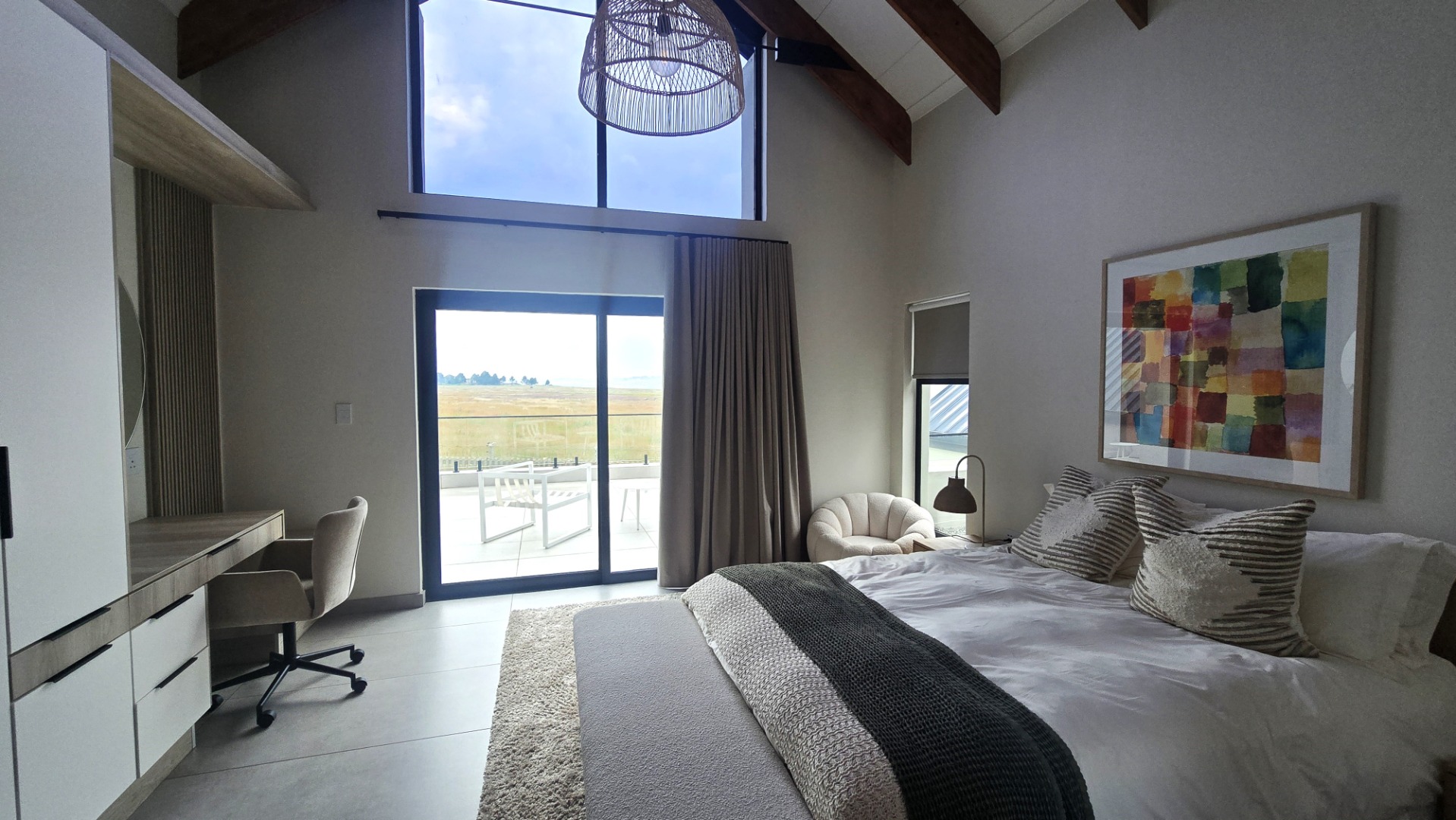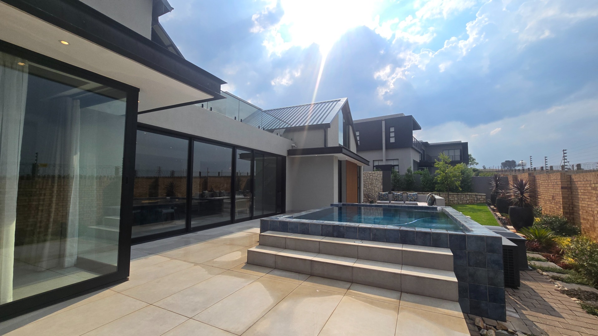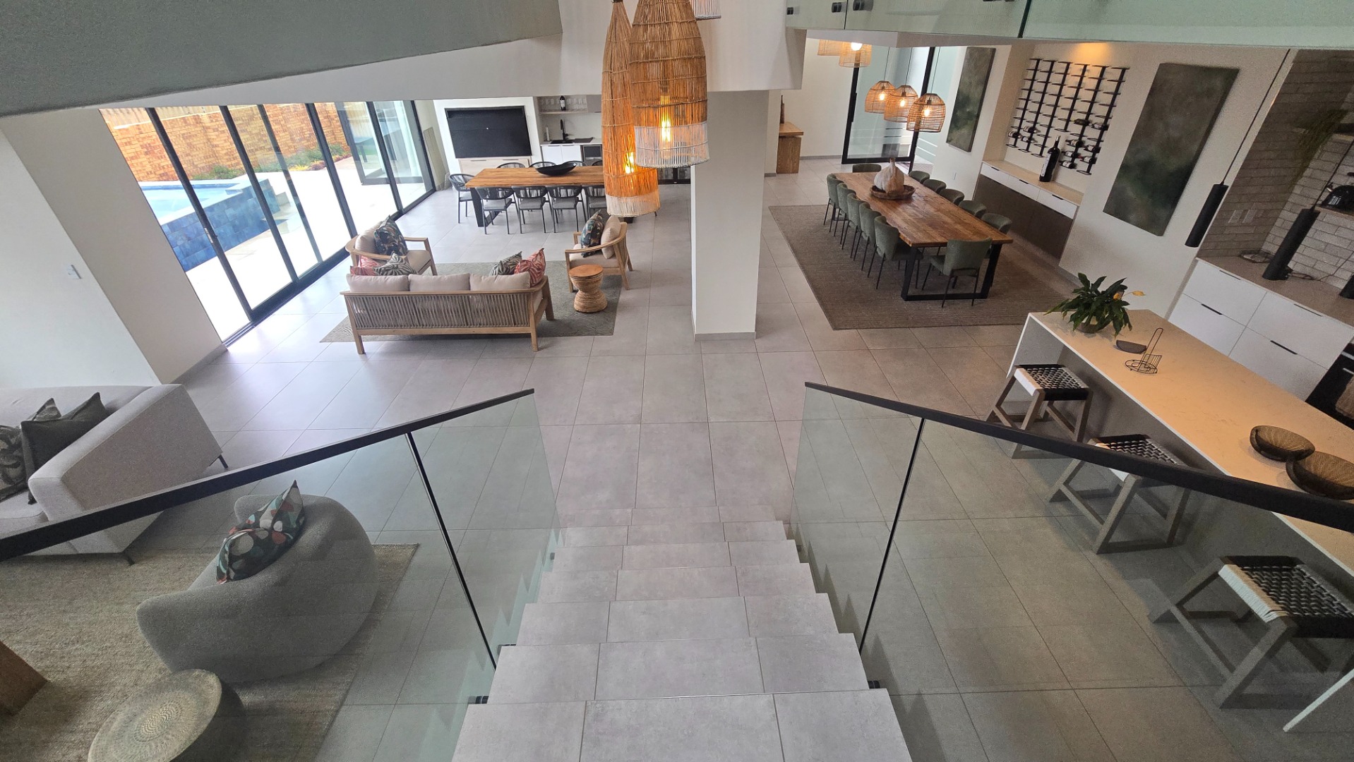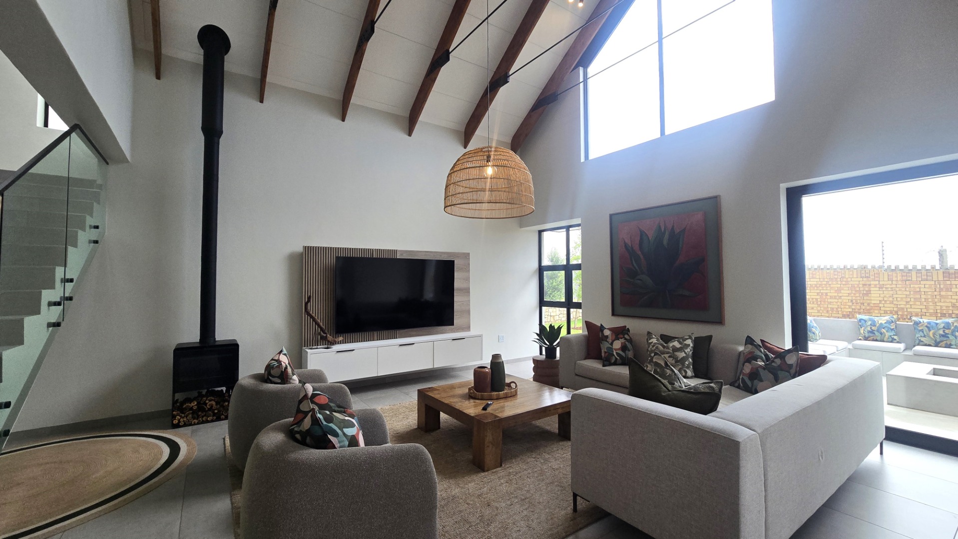 Inside, a spacious open-plan layout is designed for seamless living and entertaining. High vaulted ceilings with exposed wooden beams create an airy atmosphere, while large glass doors invite abundant natural light. The contemporary kitchen is a chef's delight, featuring a large island with seating, integrated appliances, and dedicated wine storage. Downstairs the dedicated dining room flows effortlessly to the TV lounge, enhanced by a sleek glass-paneled staircase and a contemporary fireplace. The entertainment area forms part of the open plan living space and includes space for a dining table and chairs, and a lounge suite. Also included in the entertainment area is a built in braai, built in cupboards, with a prep bowl. Five generously sized bedrooms, each with its own en-suite bathroom, ensure ultimate comfort and privacy. A dedicated study and staff quarters add practical convenience.