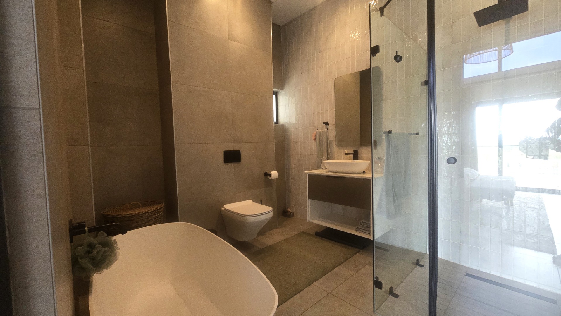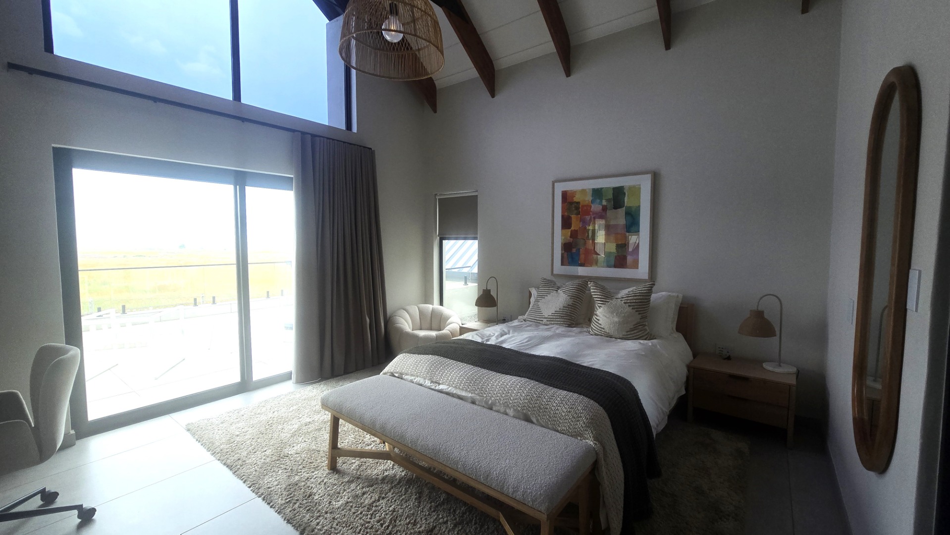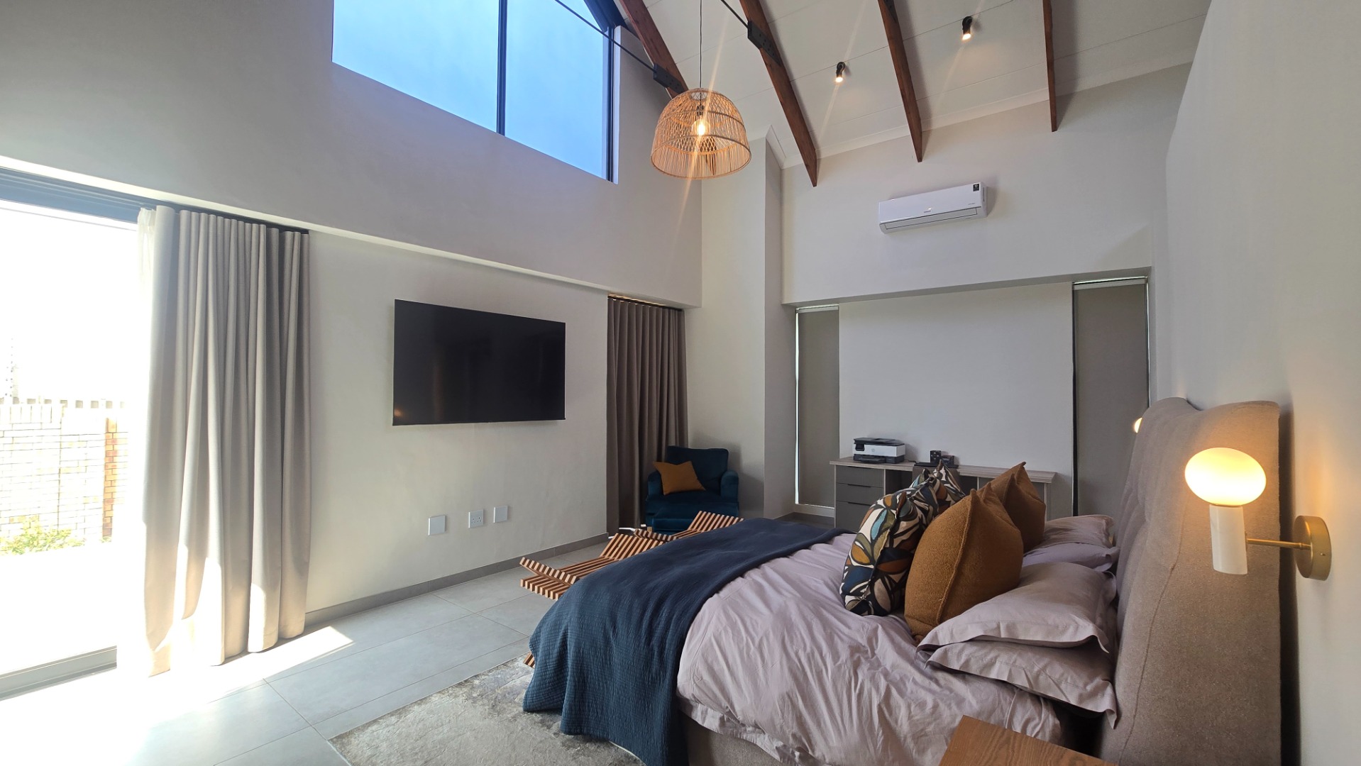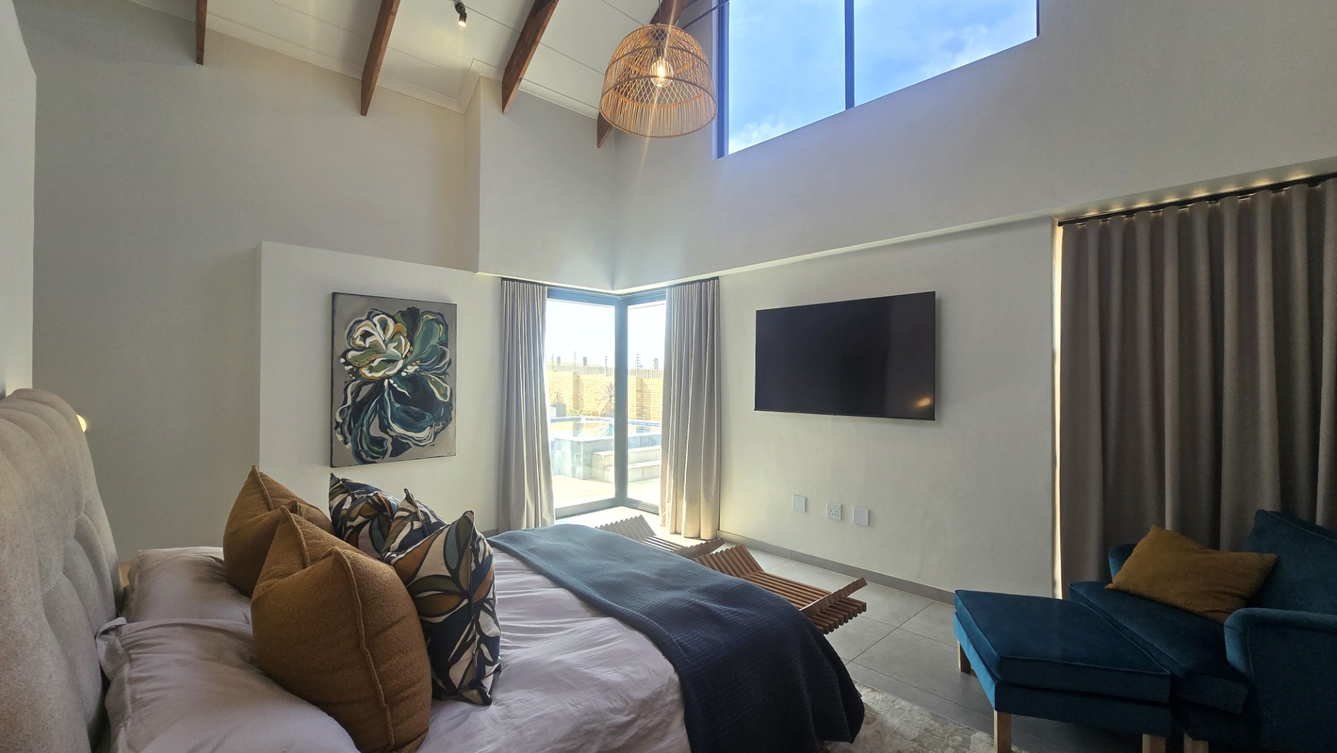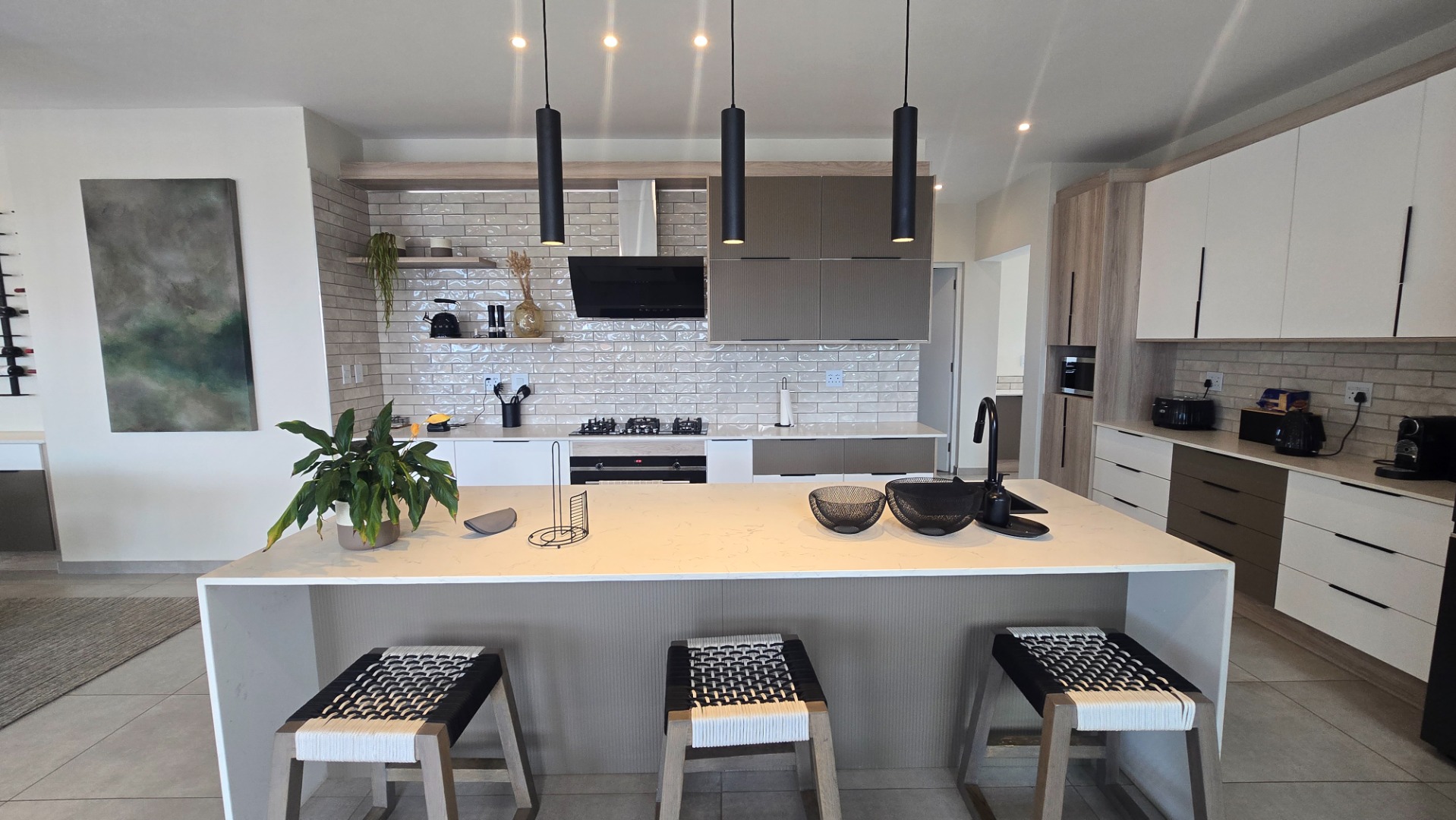 Inside, a spacious open-plan layout is designed for seamless living and entertaining. High vaulted ceilings with exposed wooden beams create an airy atmosphere, while large glass doors invite abundant natural light. The contemporary kitchen is a chef's delight, featuring a large island with seating, integrated appliances, and dedicated wine storage. Downstairs the dedicated dining room flows effortlessly to the TV lounge, enhanced by a sleek glass-paneled staircase and a contemporary fireplace. The entertainment area forms part of the open plan living space and includes space for a dining table and chairs, and a lounge suite. Also included in the entertainment area is a built in braai, built in cupboards, with a prep bowl. Five generously sized bedrooms, each with its own en-suite bathroom, ensure ultimate comfort and privacy. A dedicated study and staff quarters add practical convenience.