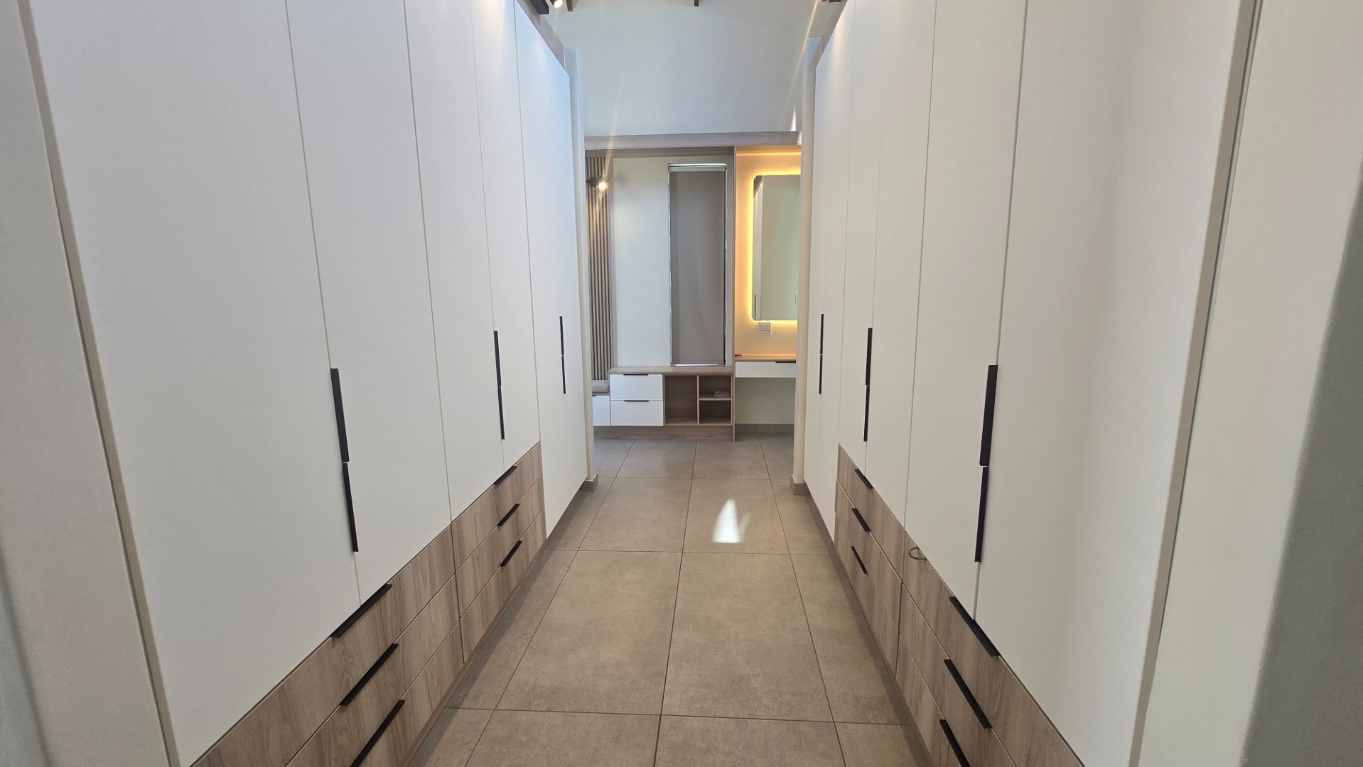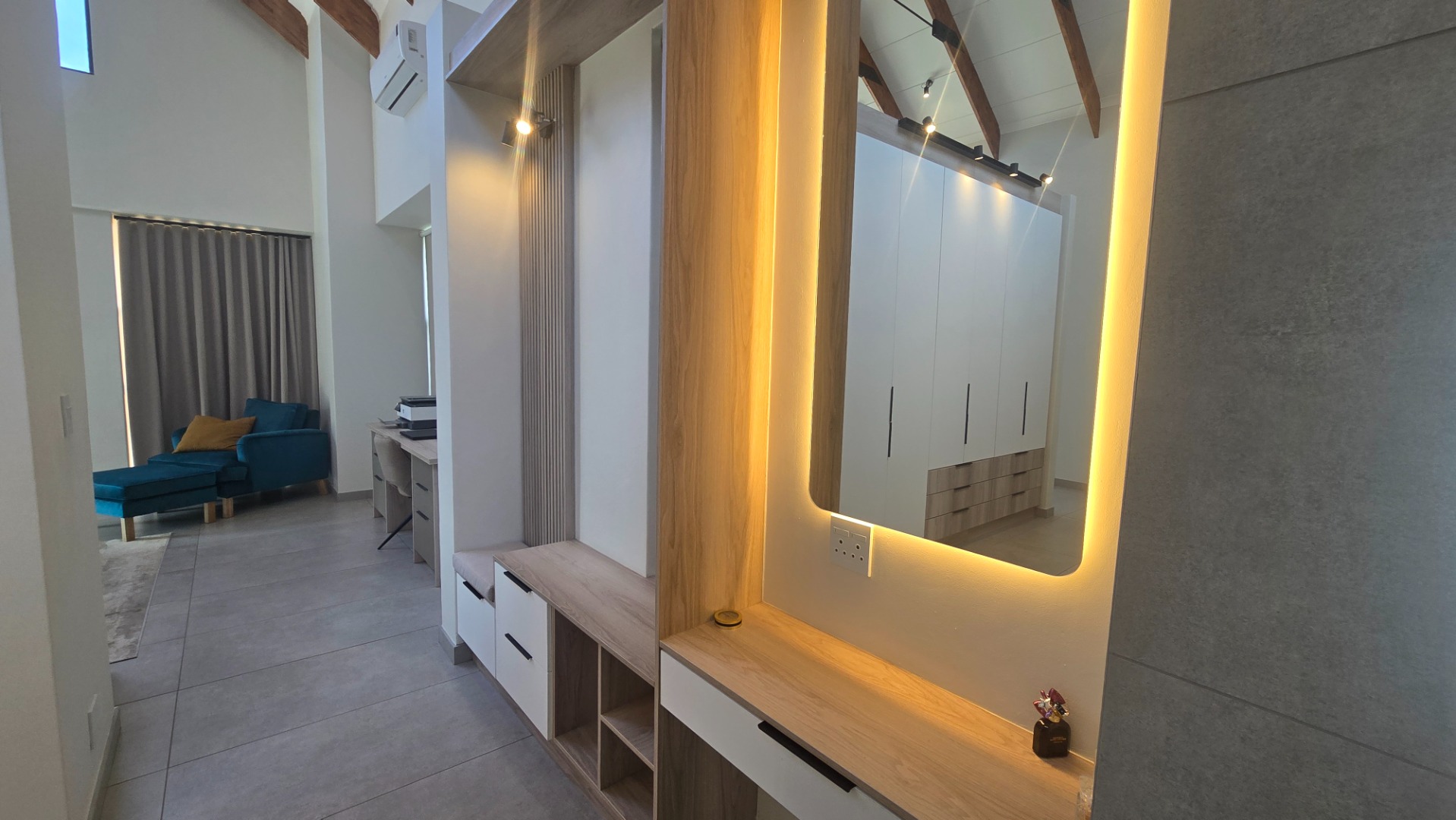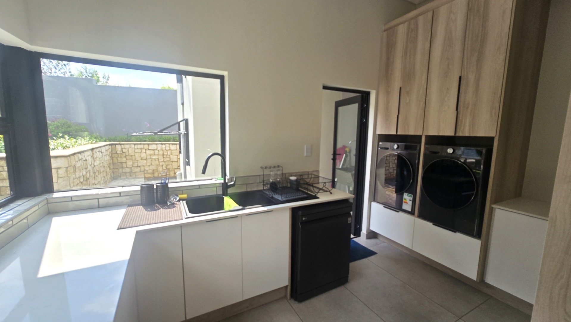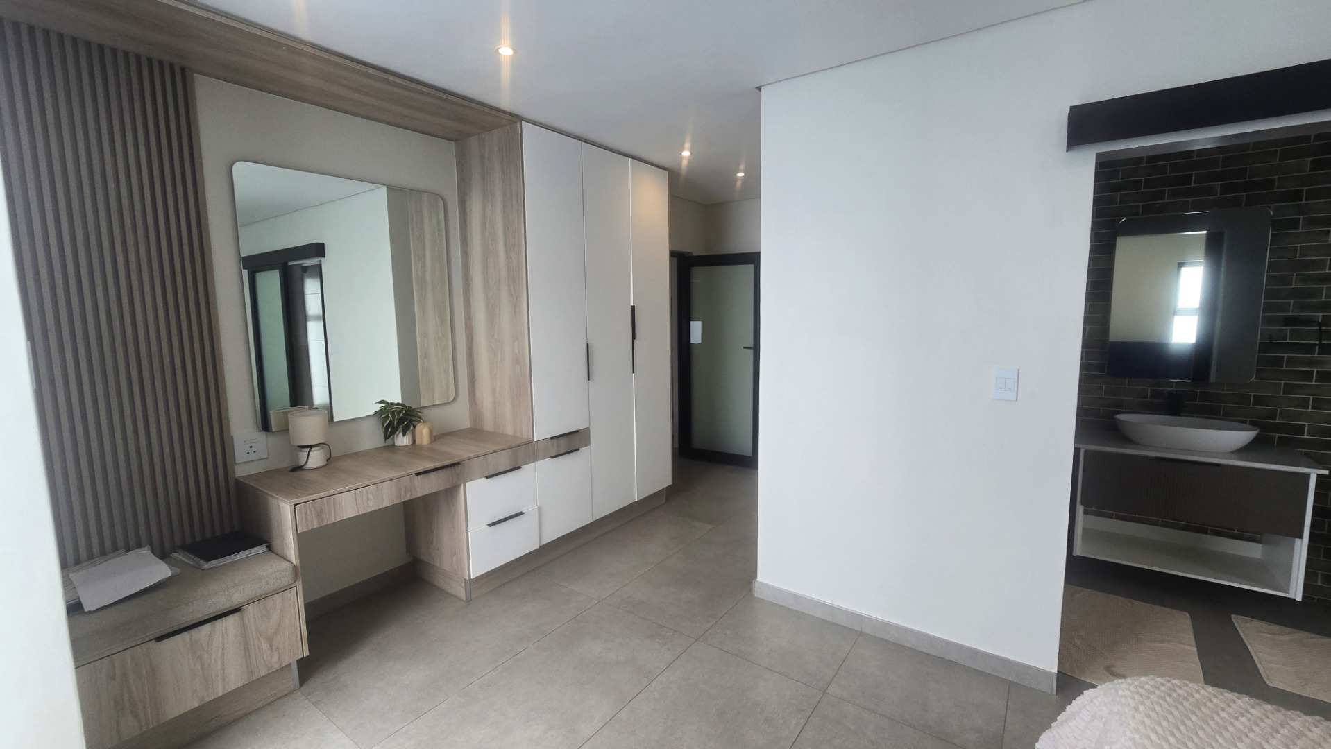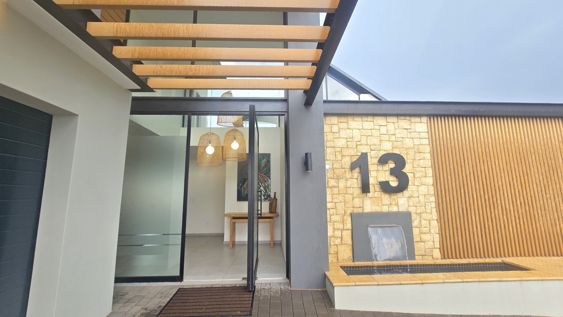 This contemporary residence in Midstream Estate, Centurion, immediately impresses with its striking modern architectural design. The facade showcases a sophisticated blend of light grey rendering, natural stone cladding, and vertical wood-look slats, complemented by expansive black-framed glass windows. A prominent glass main entrance, integrated double garage, and an attractive water feature enhance its curb appeal, setting a tone of refined elegance.