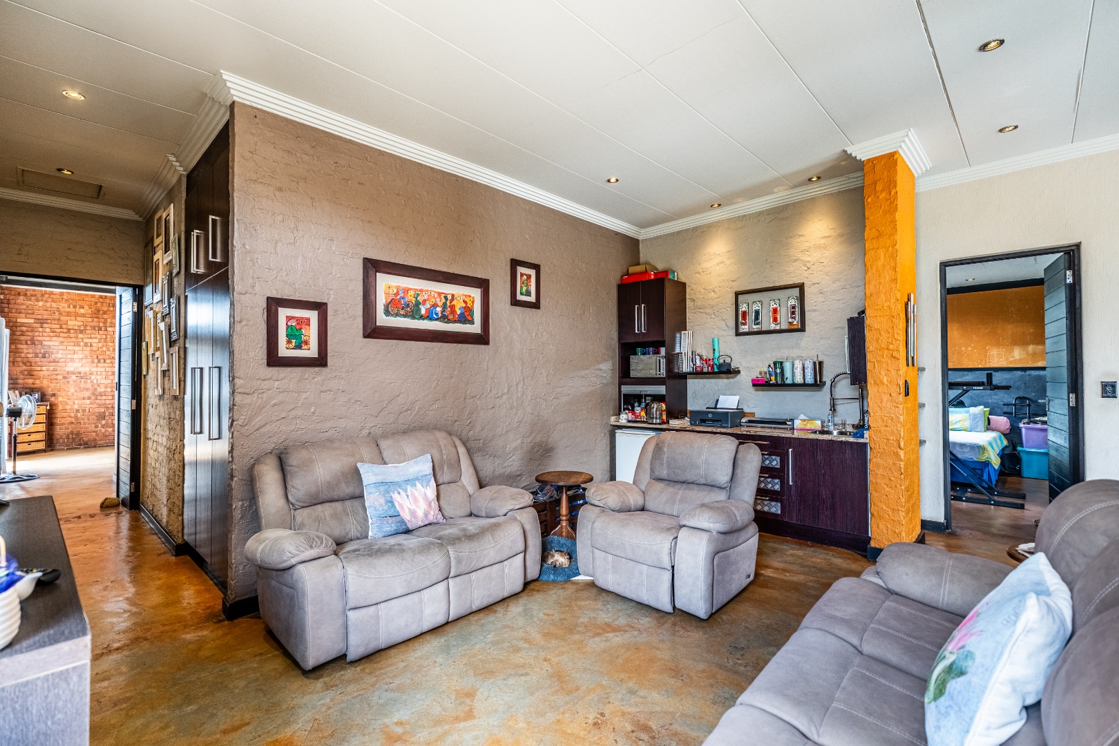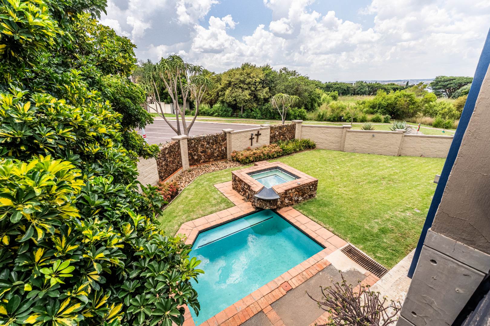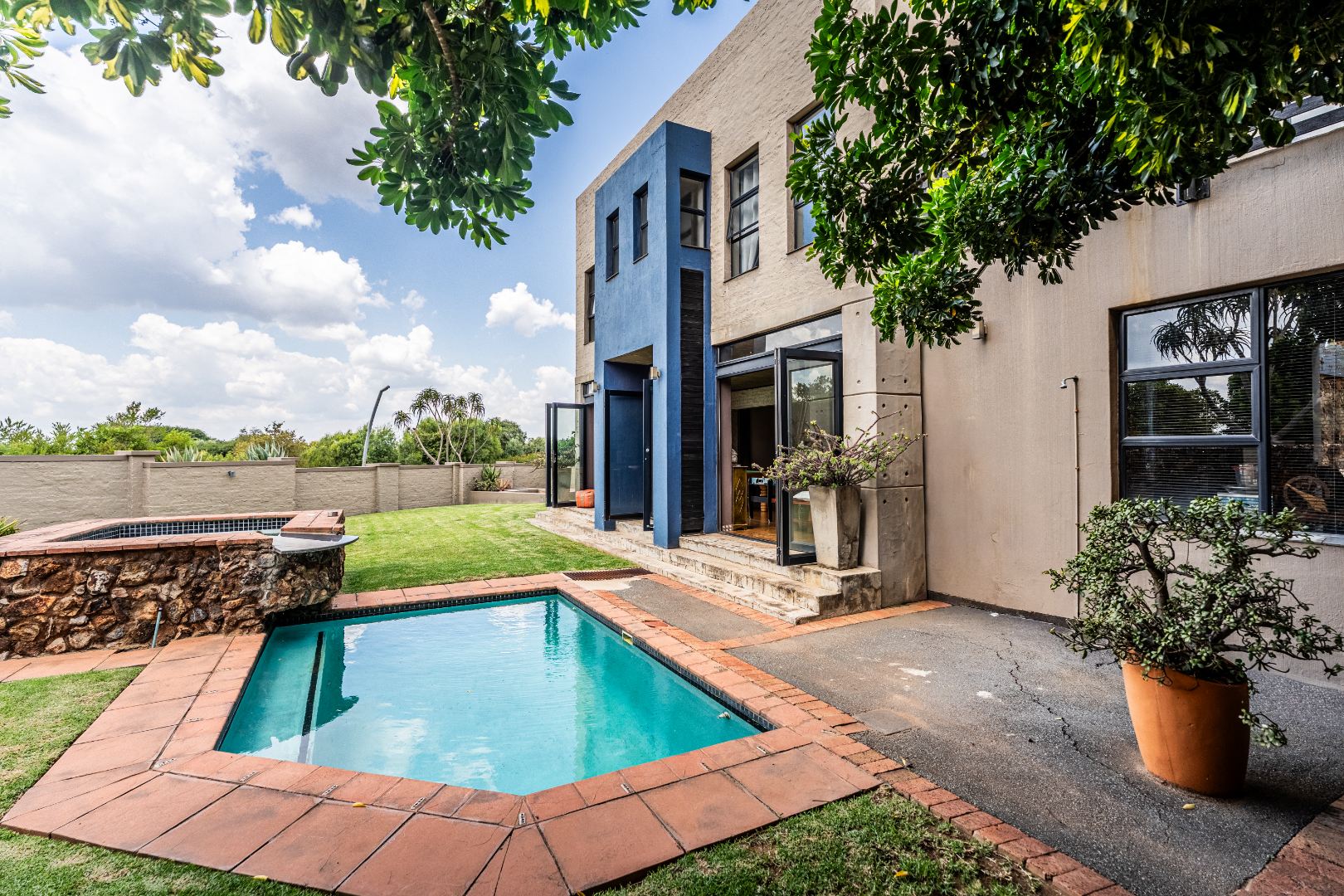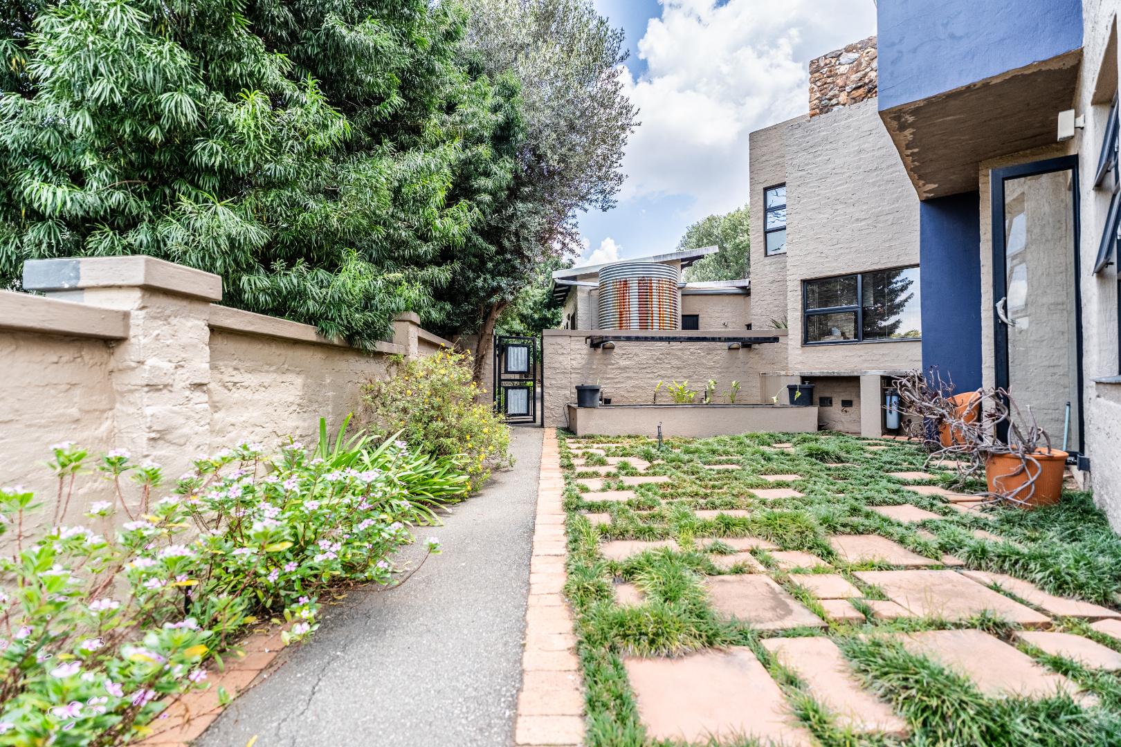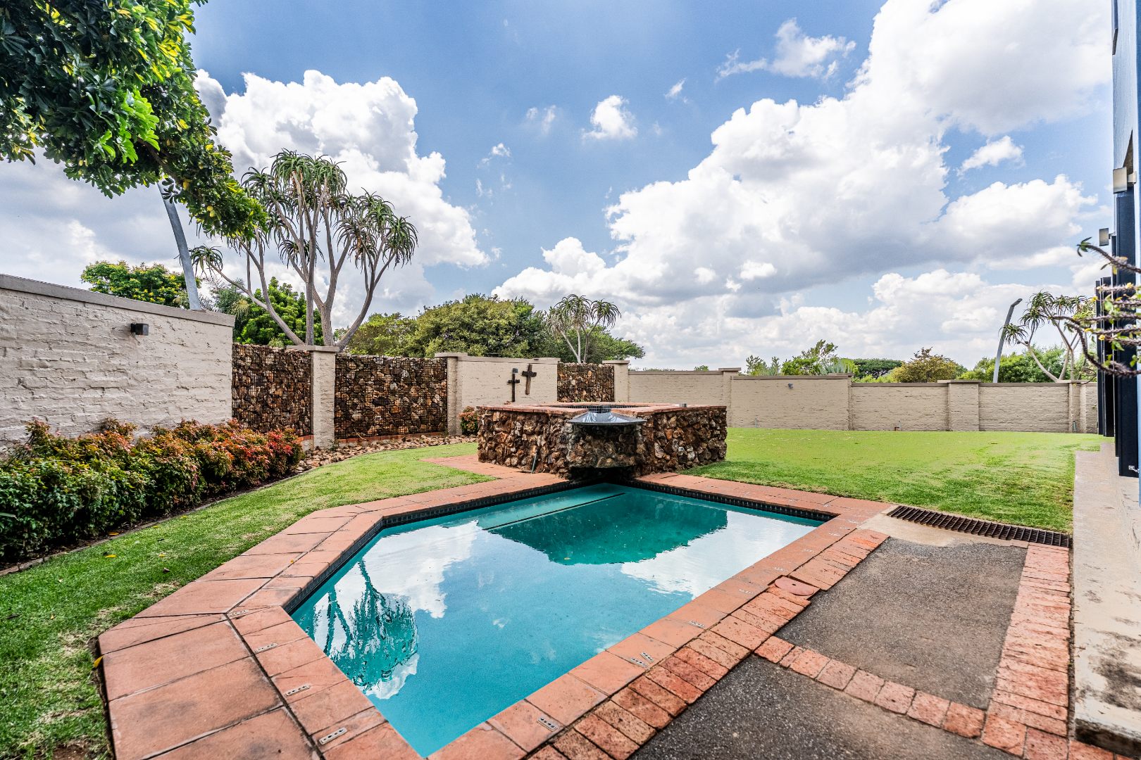 The home’s heart is its entertainment area, with doors opening onto a lush garden, complemented by an indoor braai for year-round gatherings. Outdoors, a sparkling swimming pool invites relaxation, while the sprinkler system and water tank ensure easy upkeep.