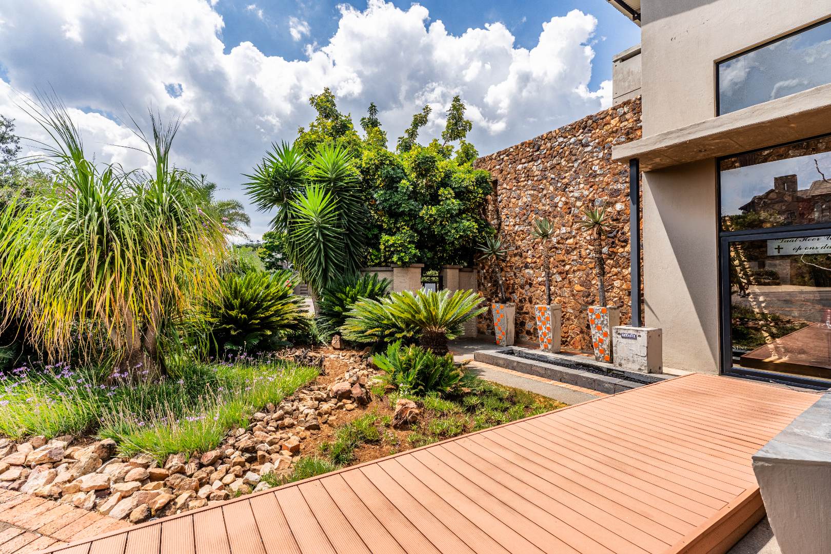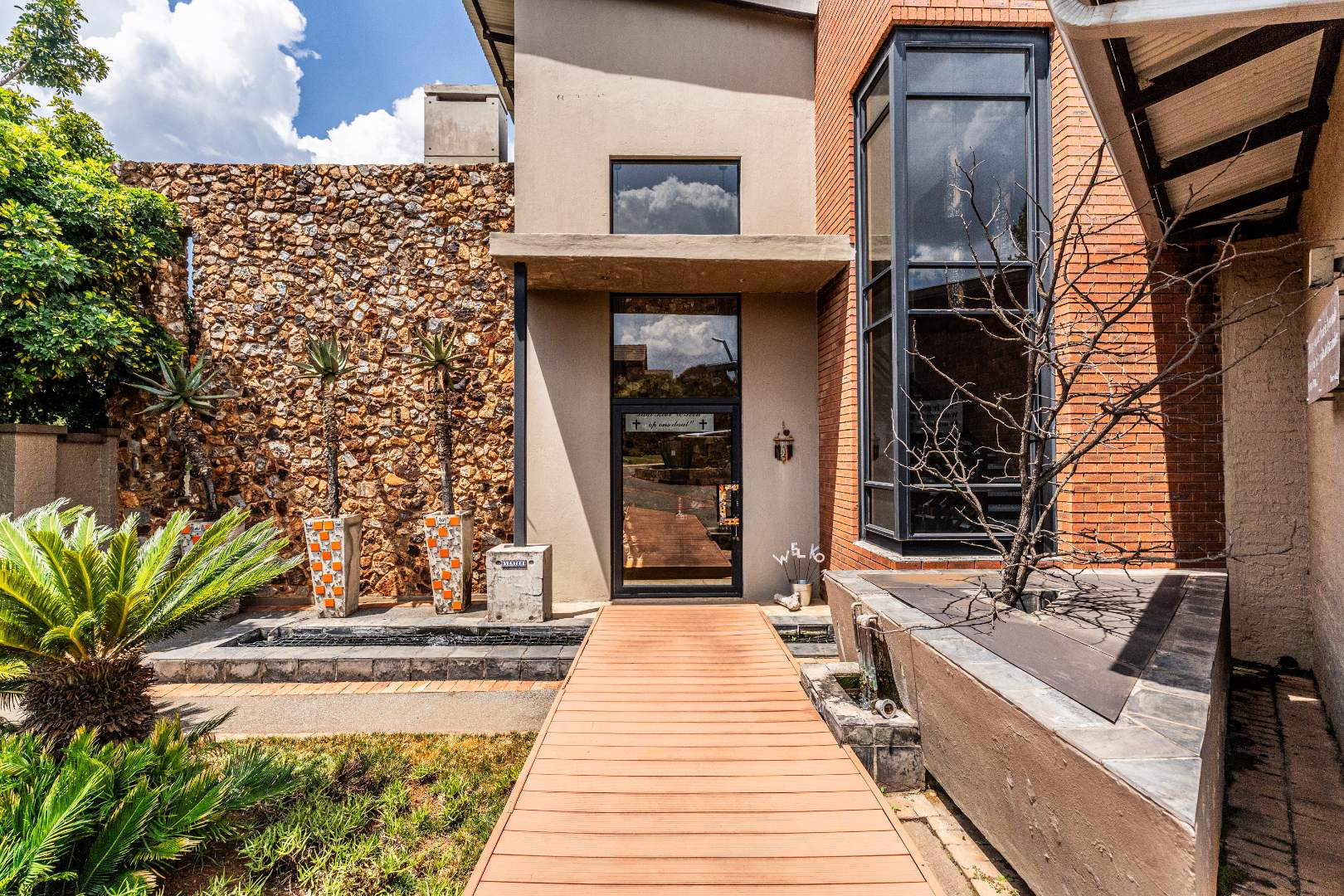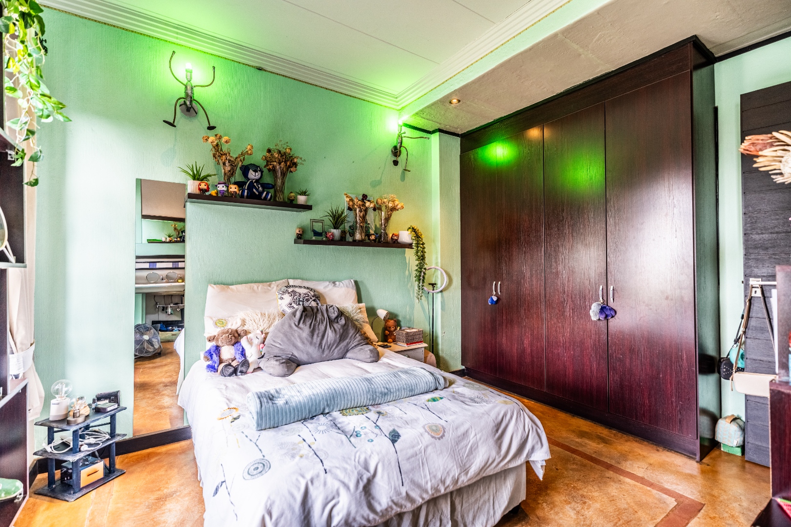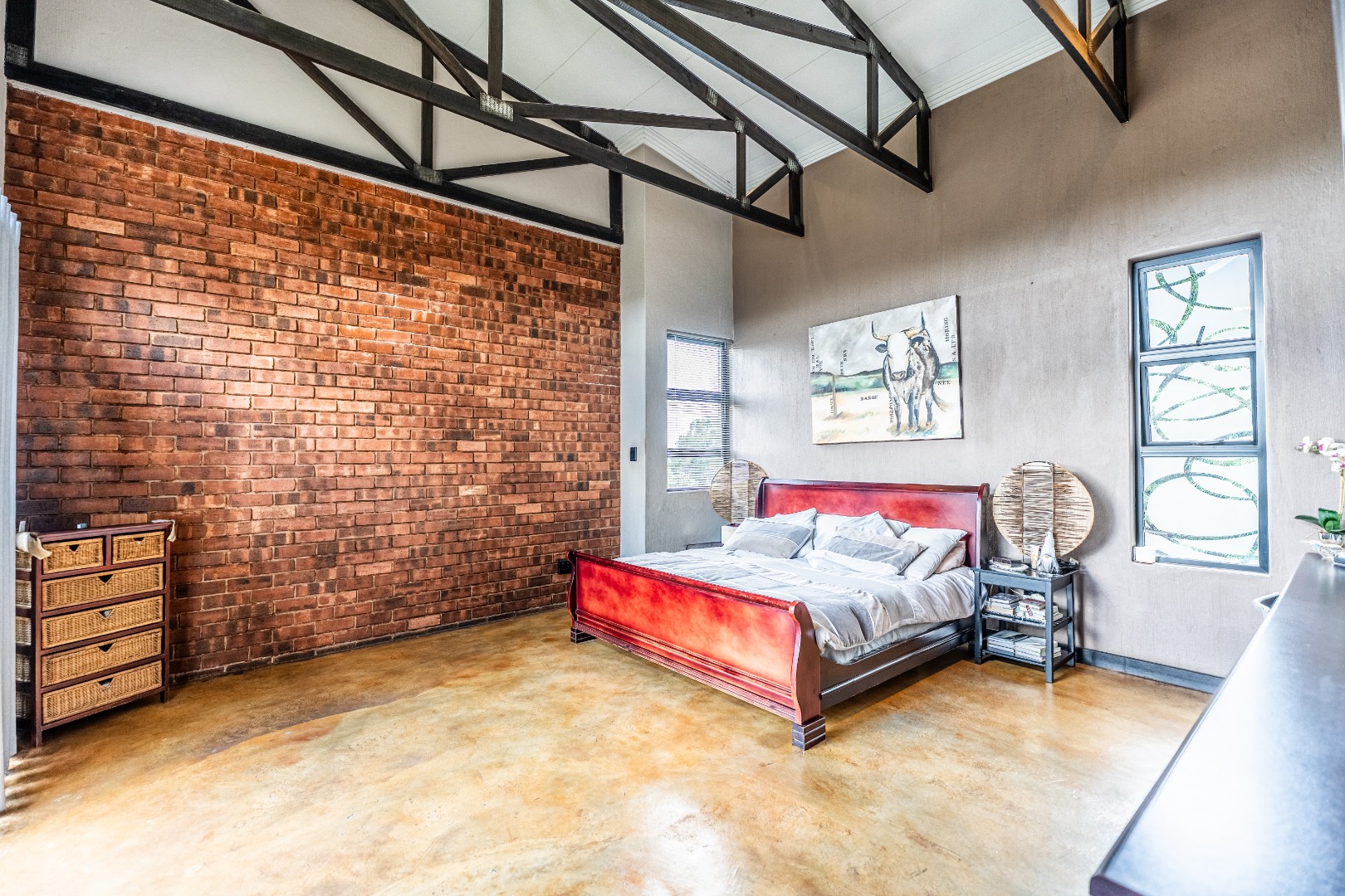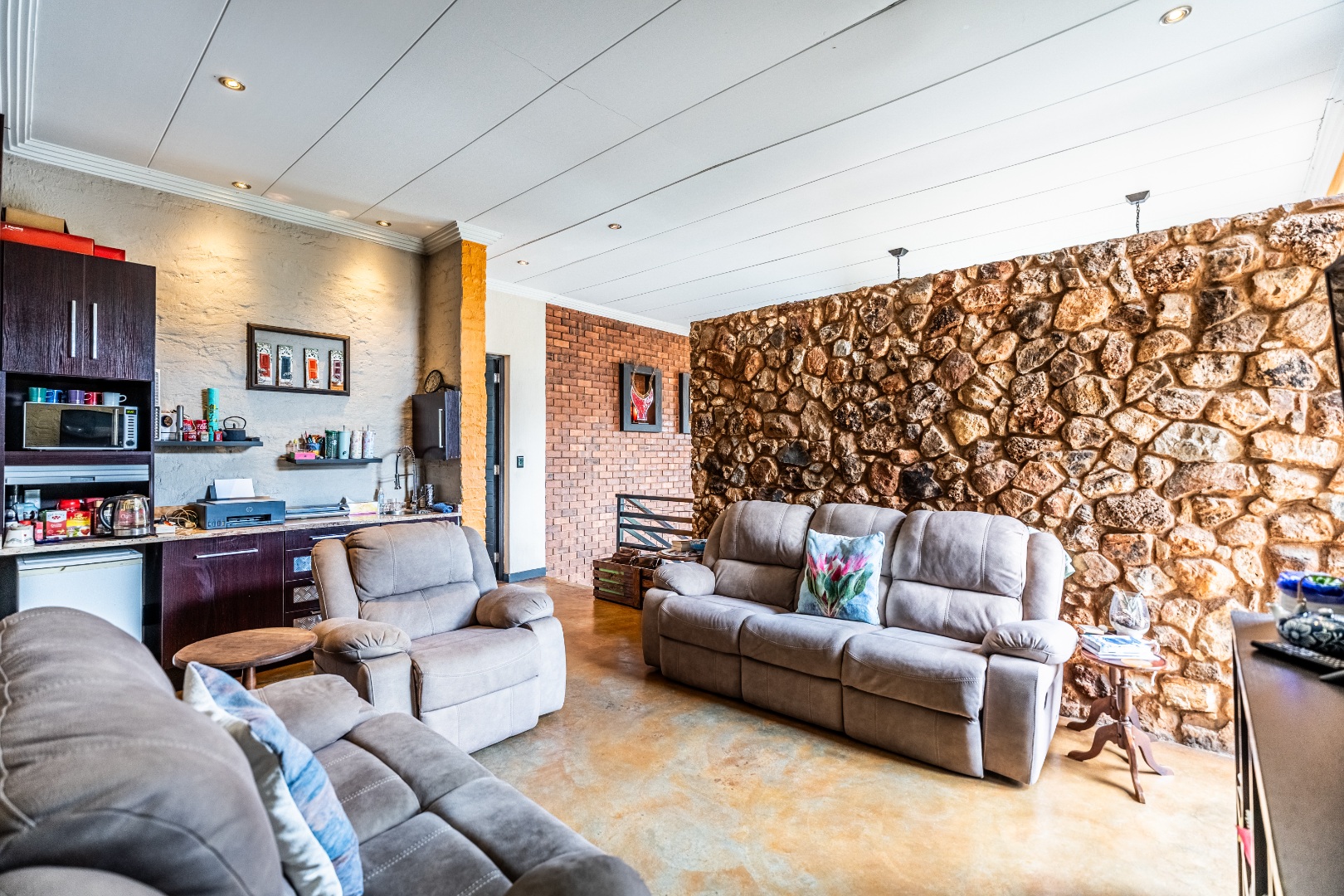 The home’s heart is its entertainment area, with doors opening onto a lush garden, complemented by an indoor braai for year-round gatherings. Outdoors, a sparkling swimming pool invites relaxation, while the sprinkler system and water tank ensure easy upkeep.