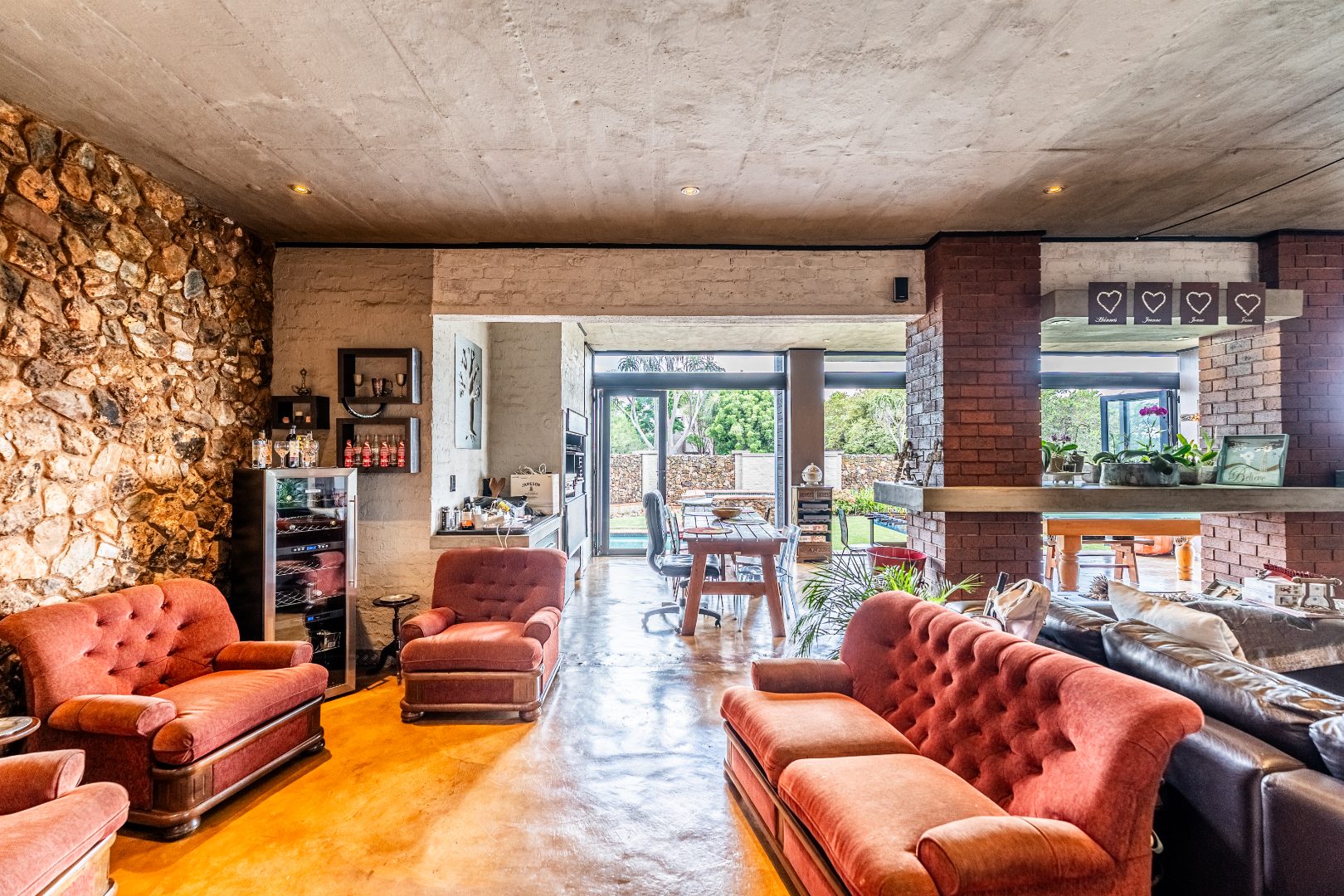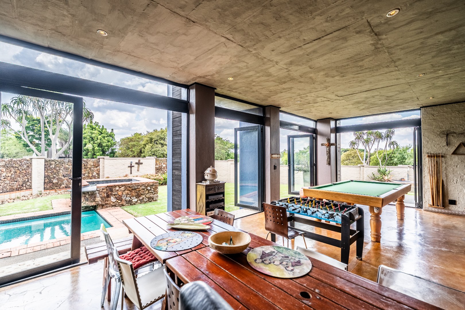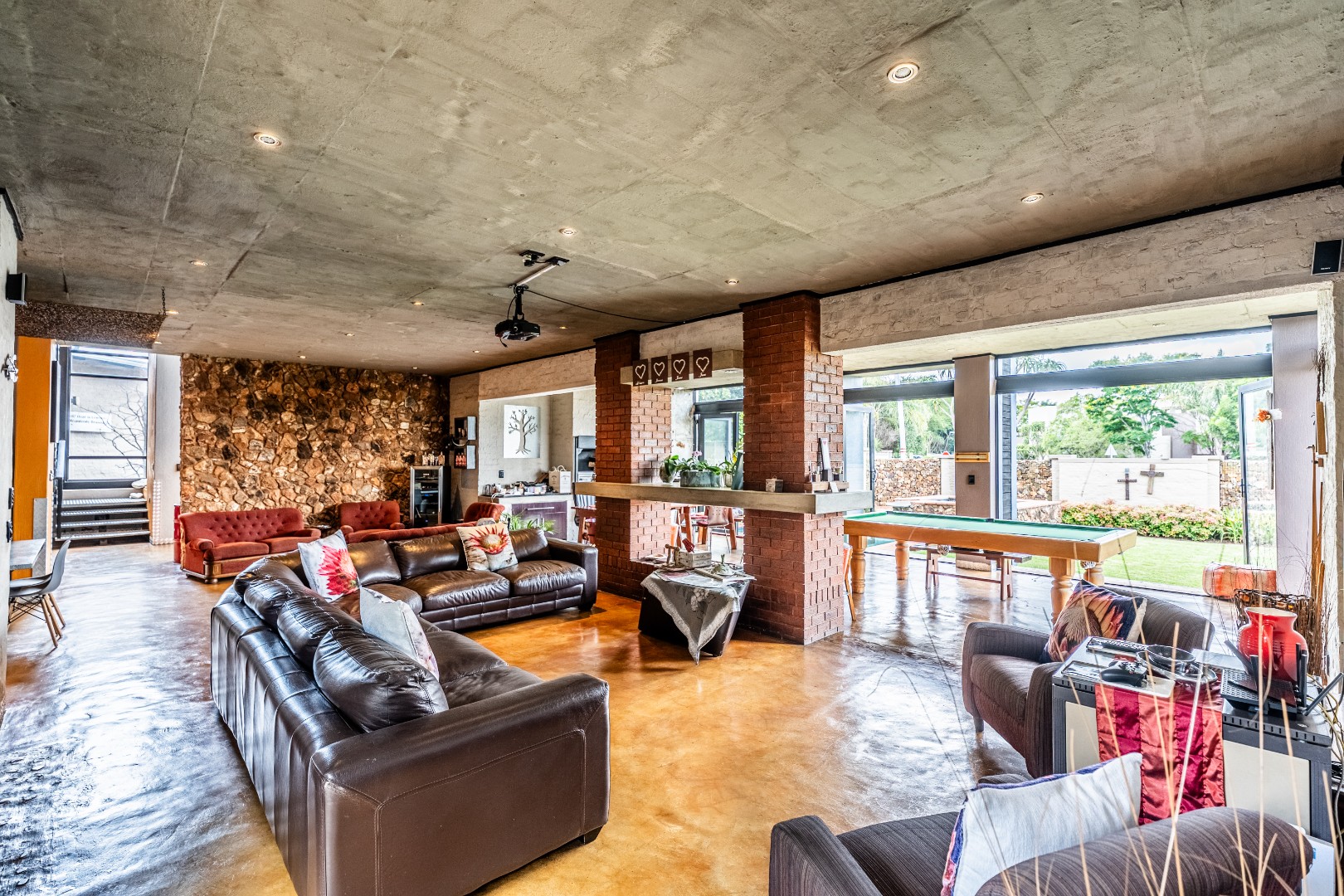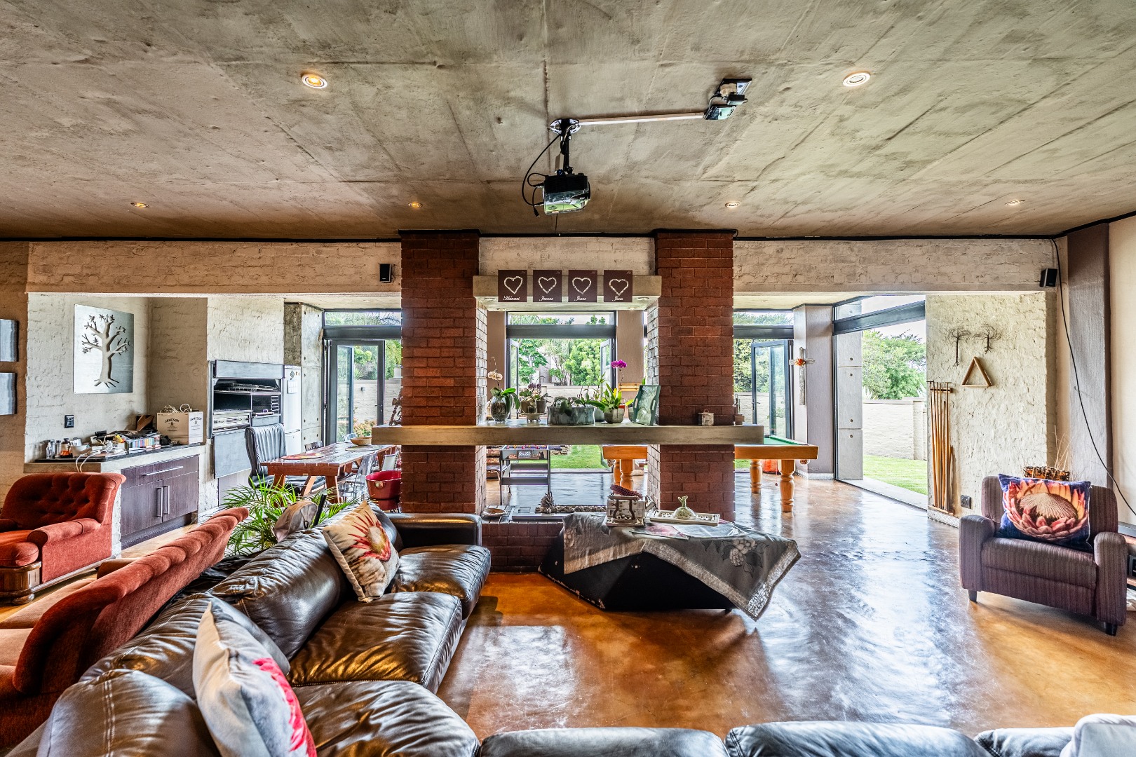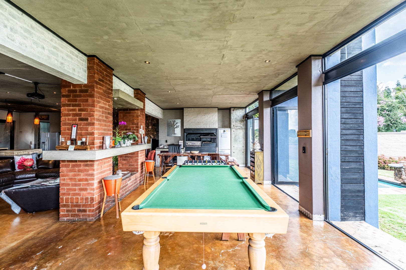 Spacious Living, dining and entertainment area all open plan with built in braai and stacker aluminum doors opening up to the outside garden and sparkling swimming pool.