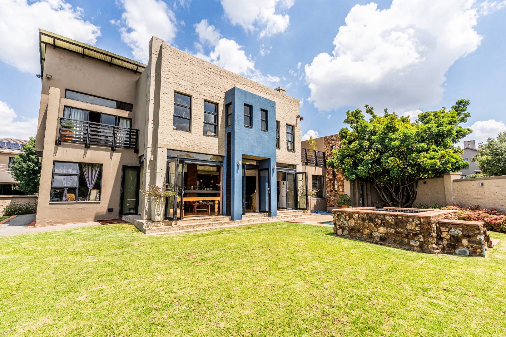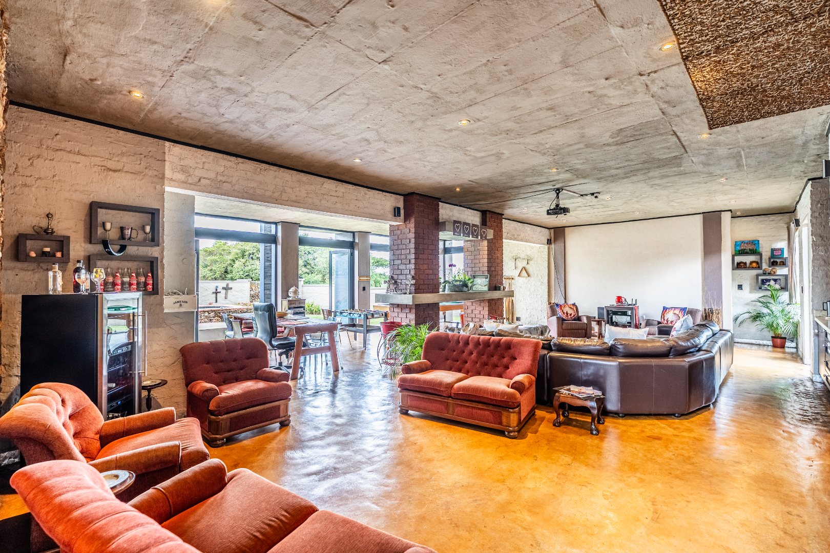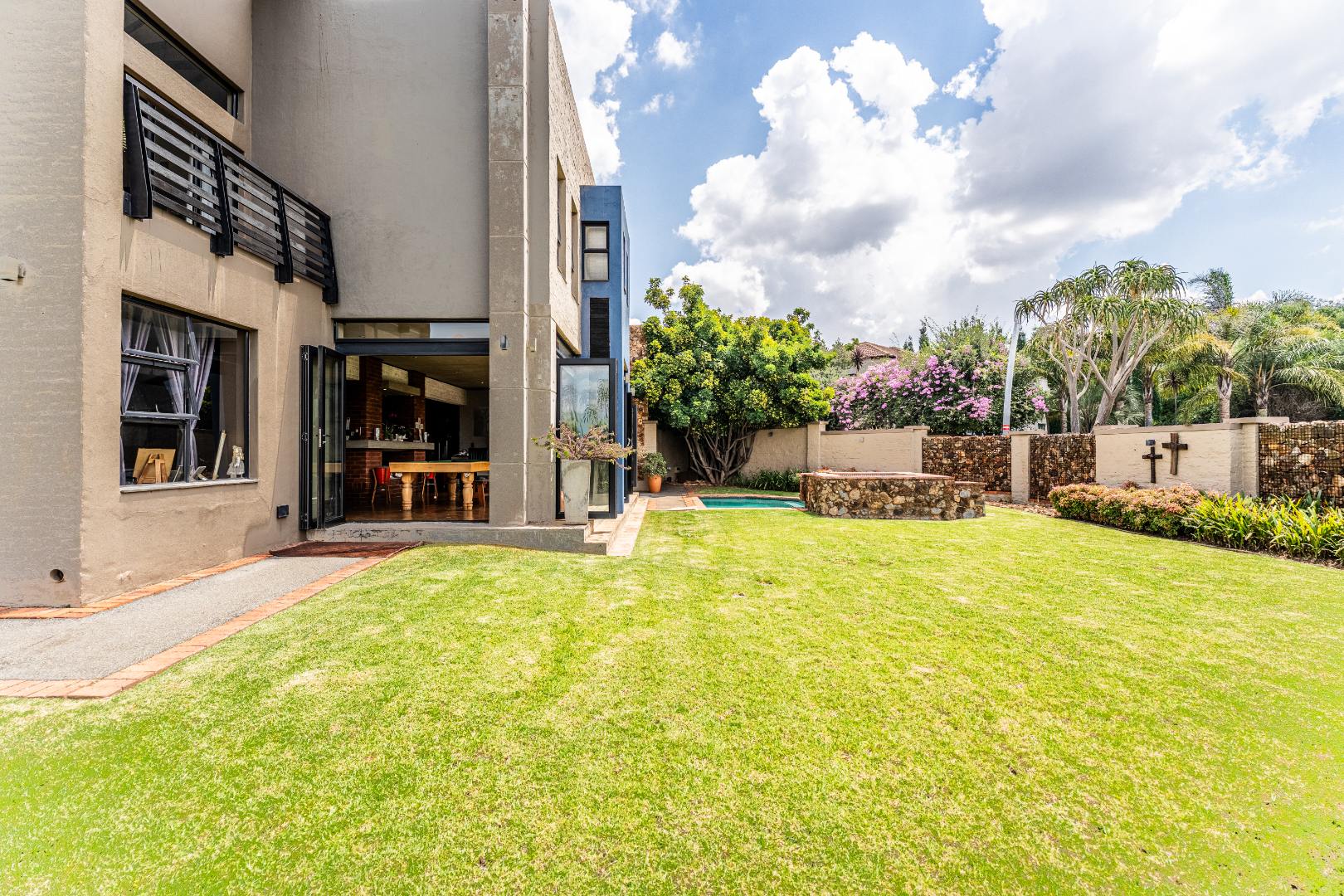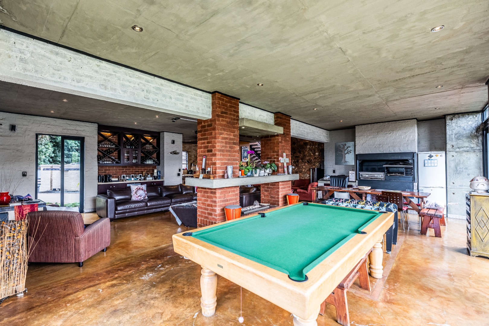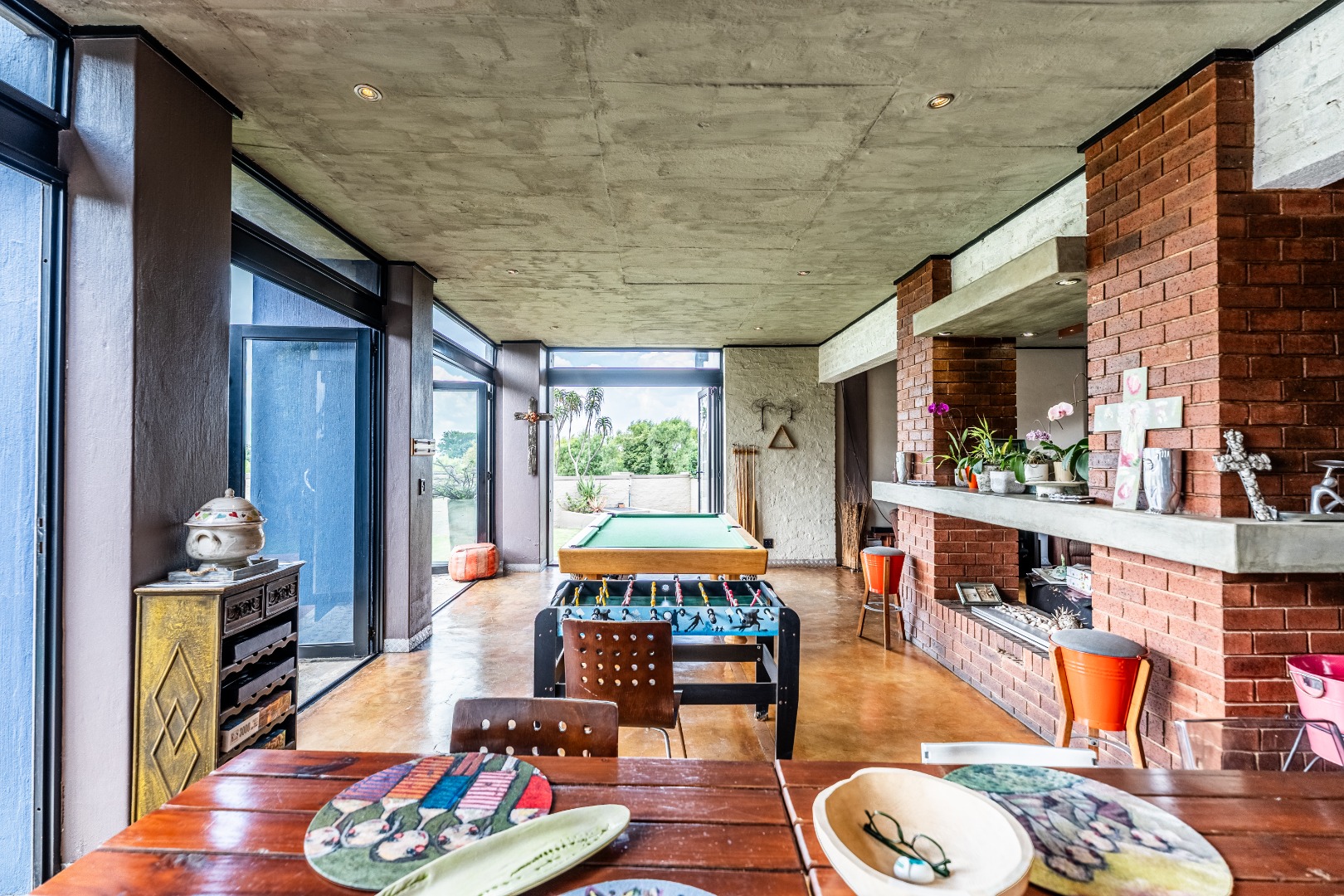 Spacious Living, dining and entertainment area all open plan with built in braai and stacker aluminum doors opening up to the outside garden and sparkling swimming pool.