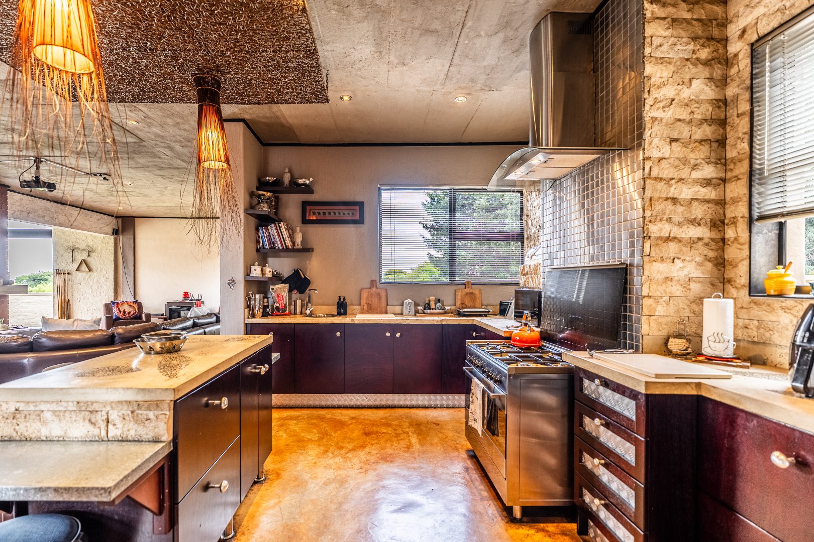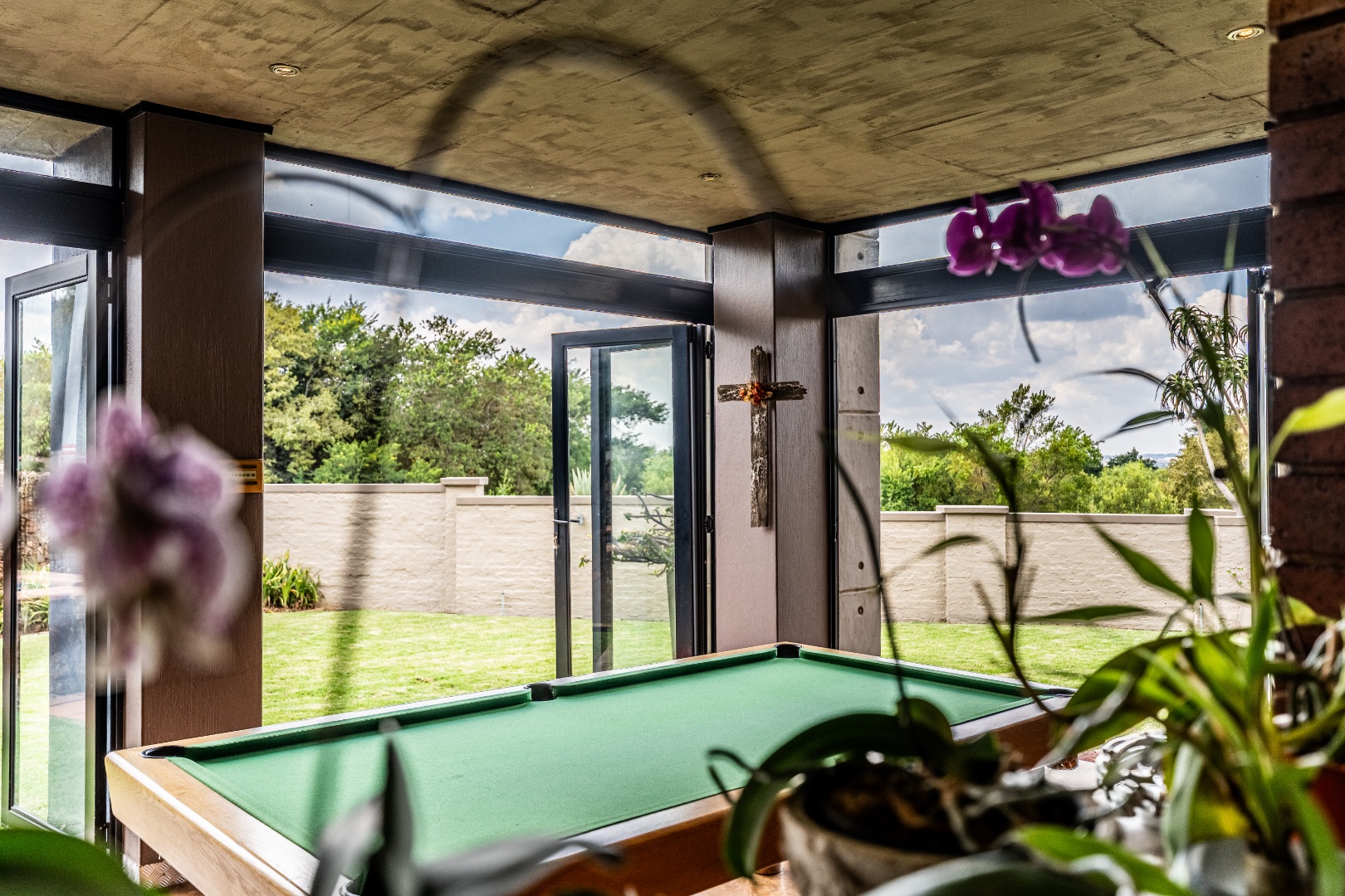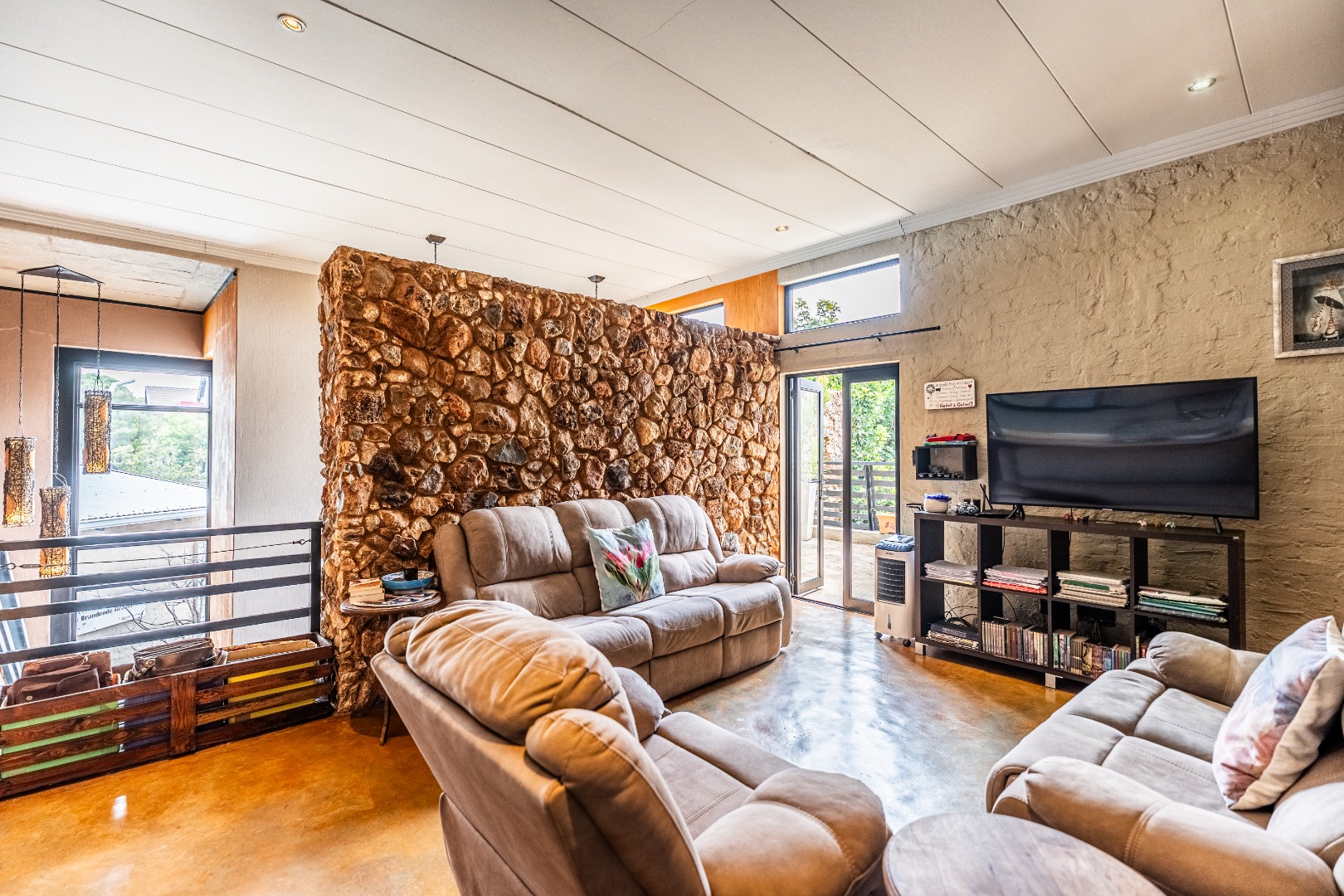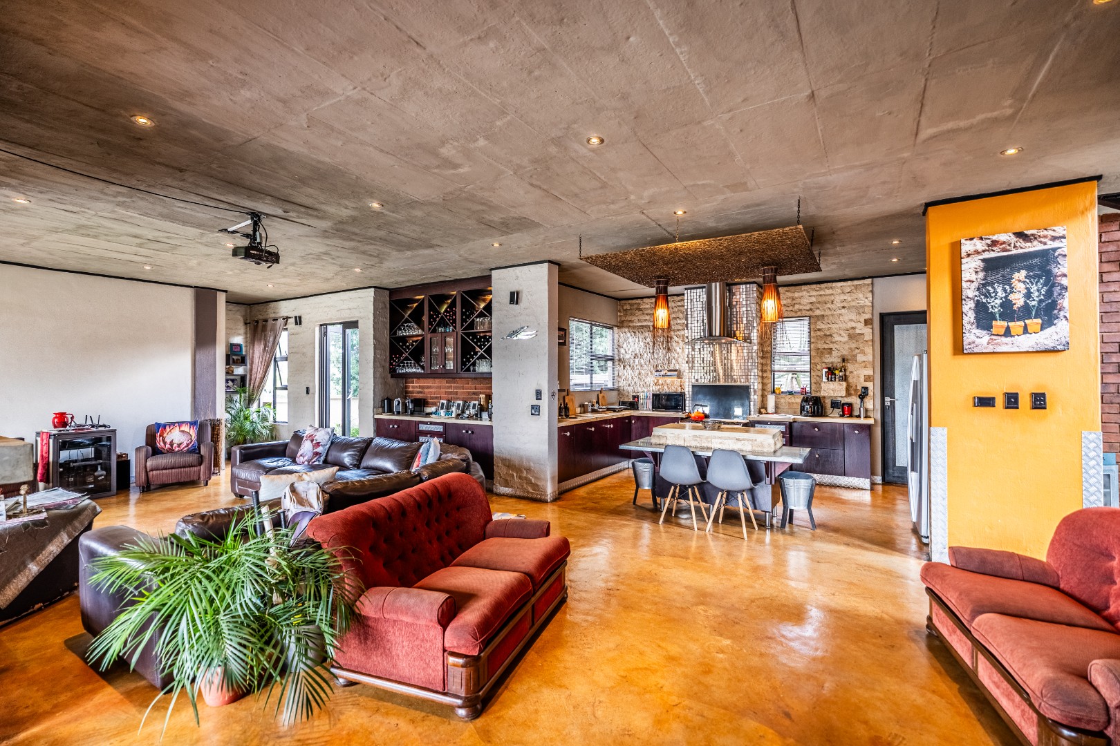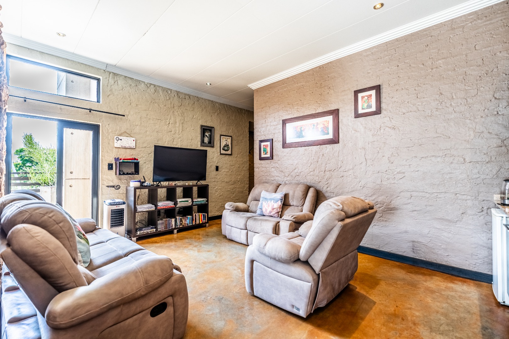 Spacious Living, dining and entertainment area all open plan with built in braai and stacker aluminum doors opening up to the outside garden and sparkling swimming pool.