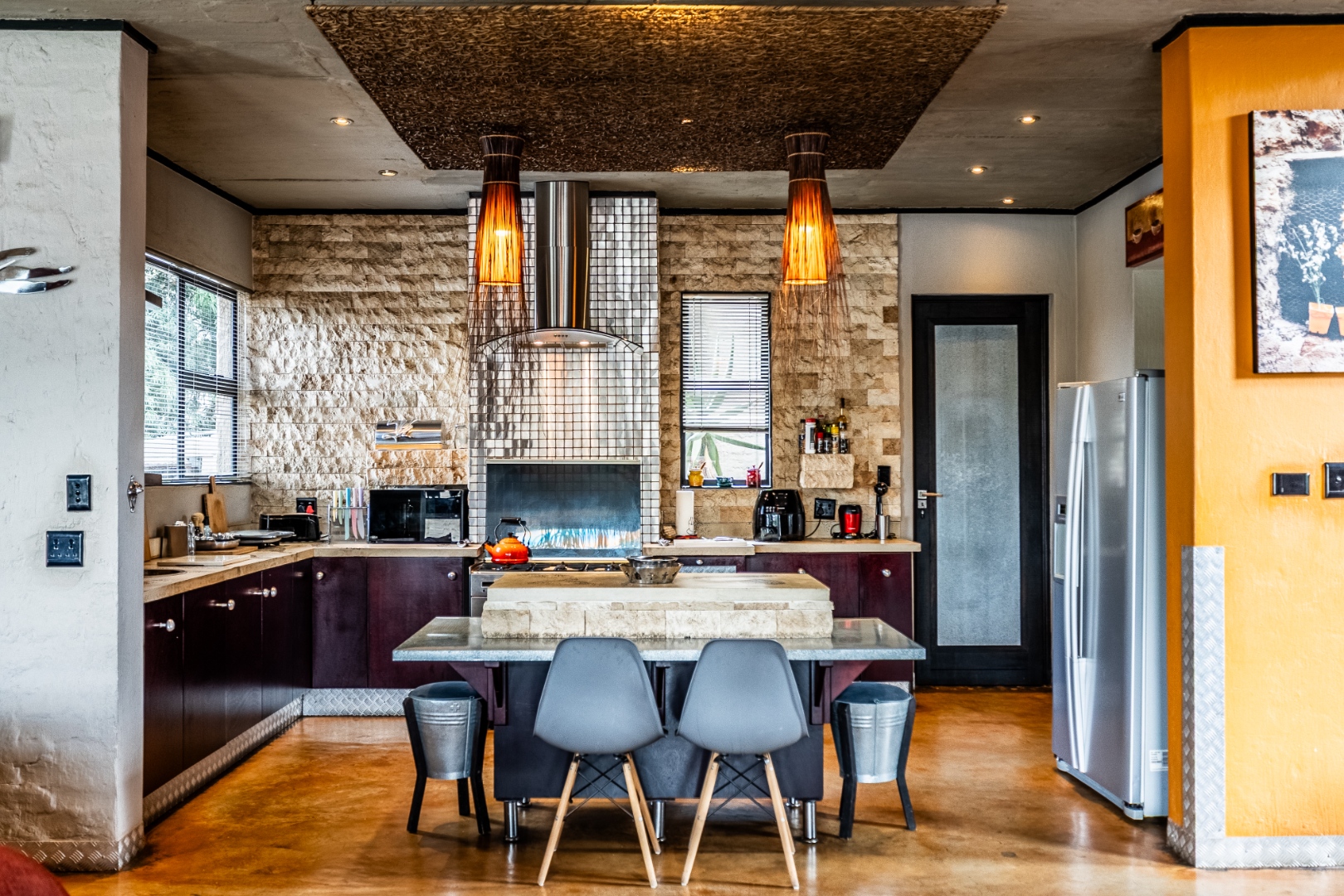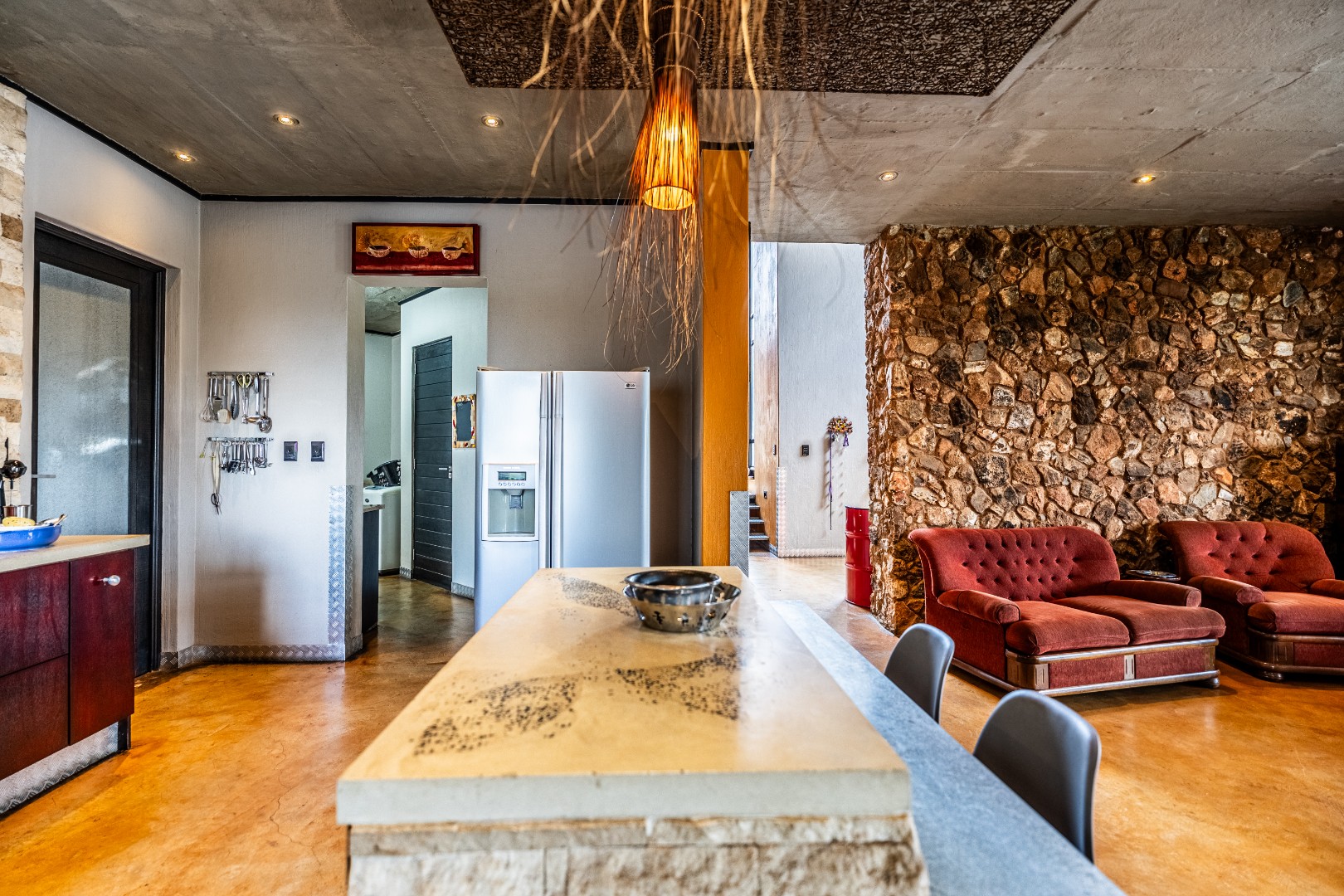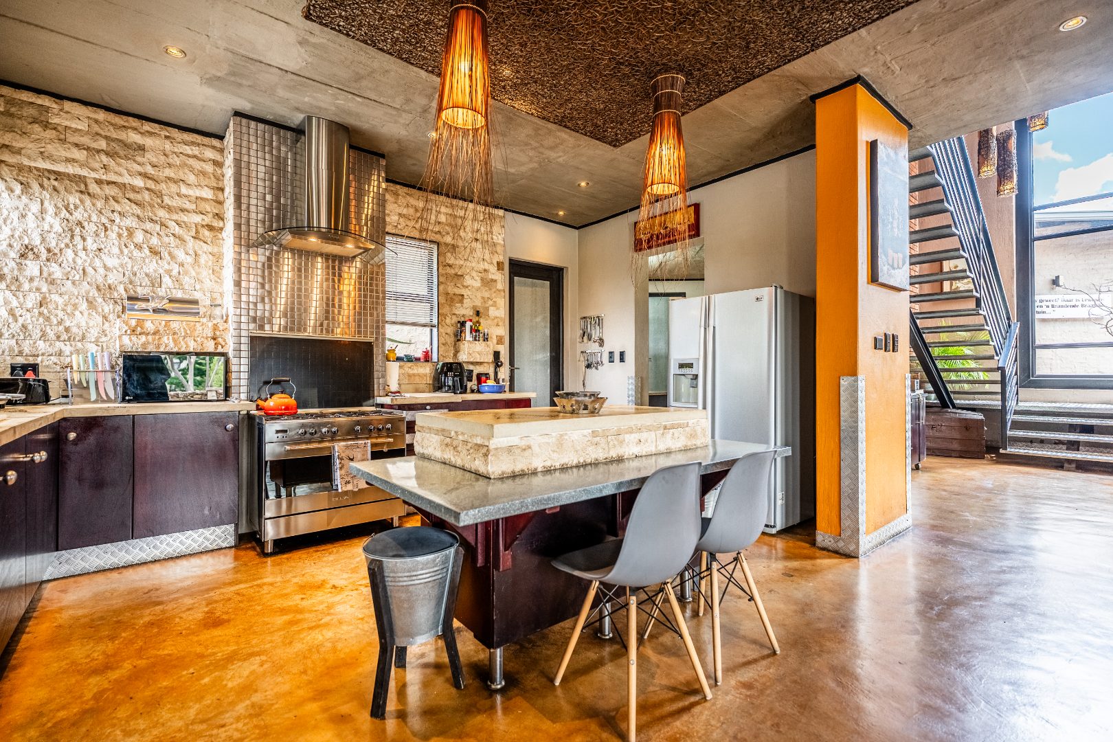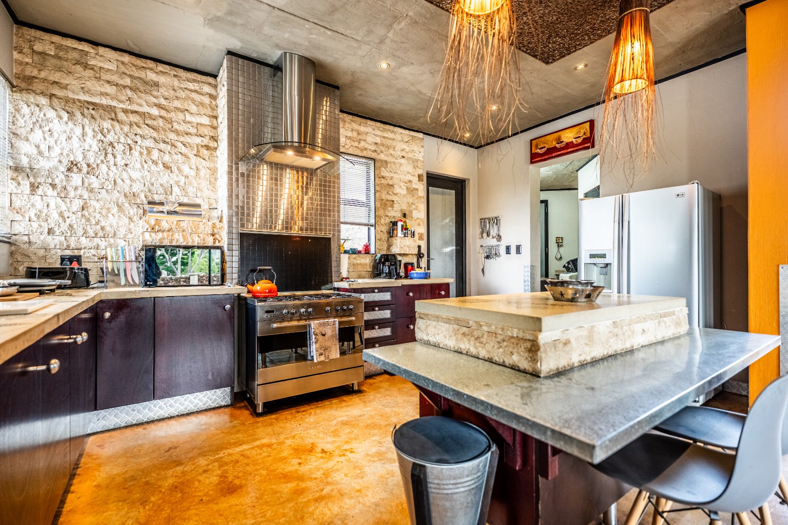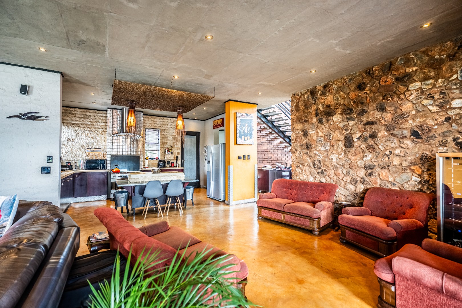 Spacious Living, dining and entertainment area all open plan with built in braai and stacker aluminum doors opening up to the outside garden and sparkling swimming pool.
