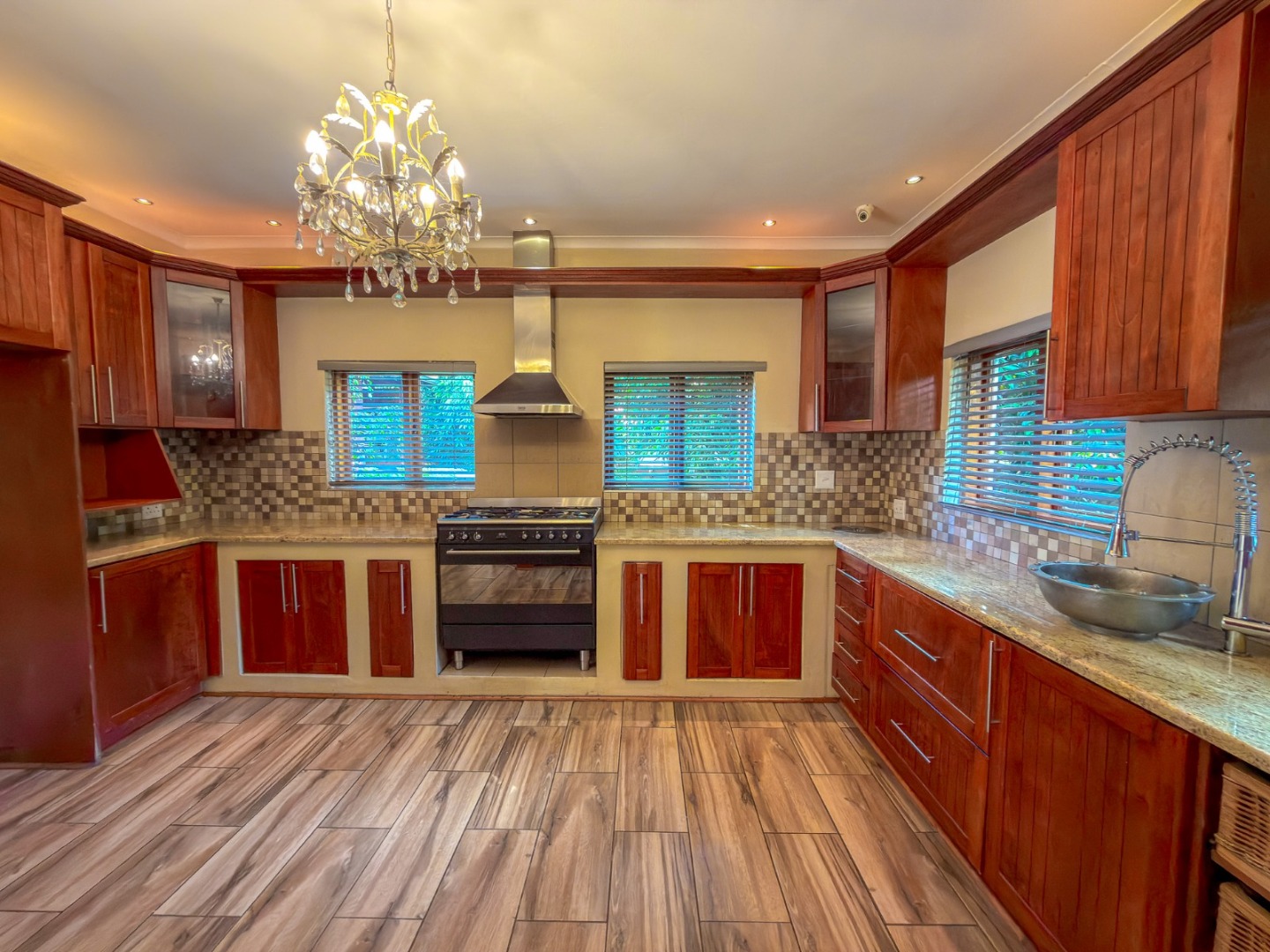 The spacious kitchen is thoughtfully designed with a gas hob, electric oven, and ample room for a central breakfast table. A private scullery has space for 3 appliances, and keeps the area neat and functional, while the kitchen flows effortlessly into the enclosed entertainment area. Here, you’ll find a built-in braai and built in bar, with stacking doors opening onto the manicured garden, open patio, sparkling swimming pool, and an intimate boma area.