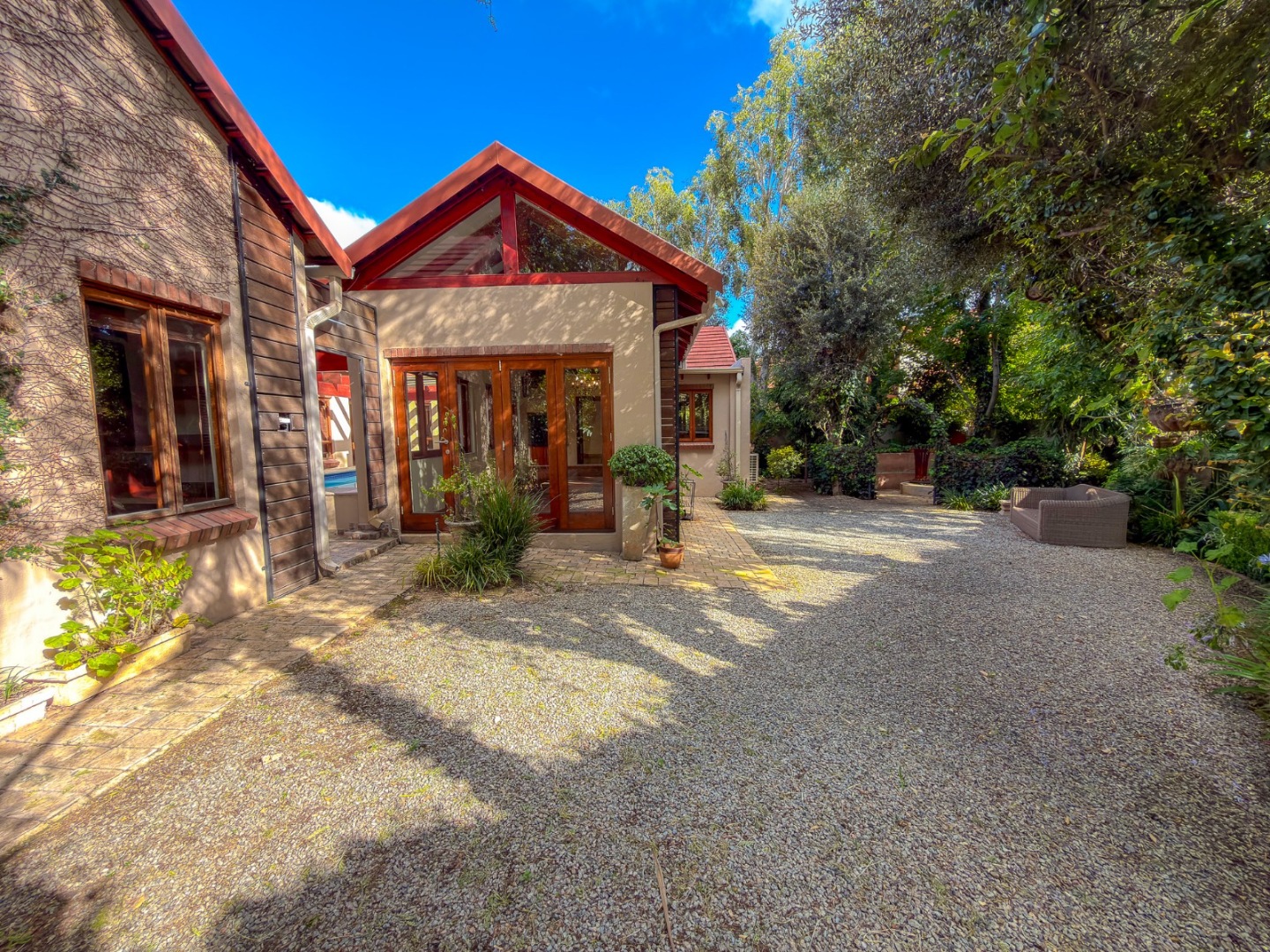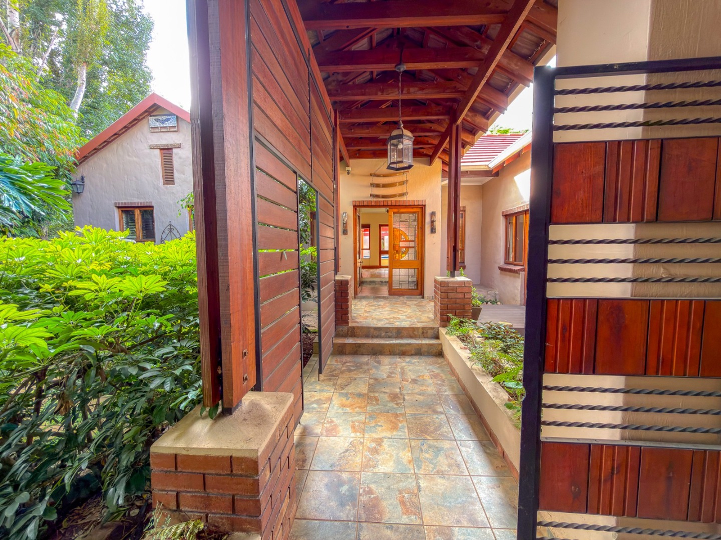 Down the passage you will find three well-sized family bedrooms, all with doors opening onto the pool area, along with two family bathrooms. The main bedroom is spacious, featuring walk-in cupboards, a dedicated vanity space with garden access, and a luxurious en-suite bathroom.