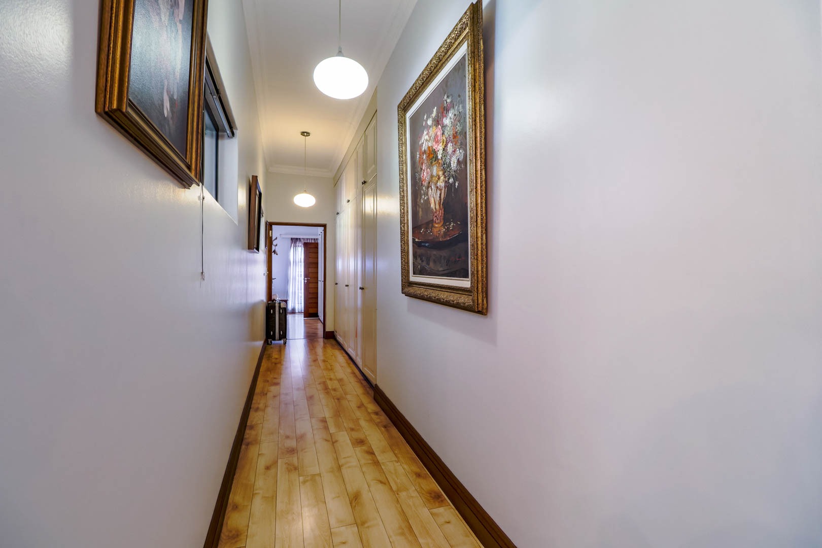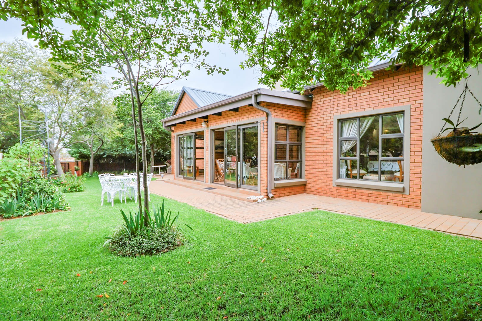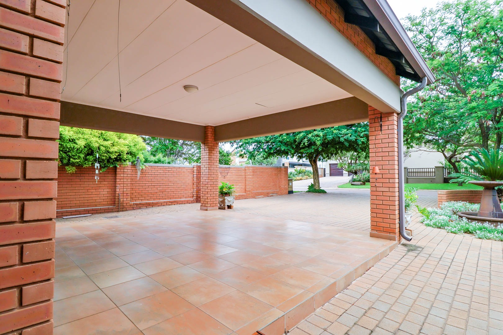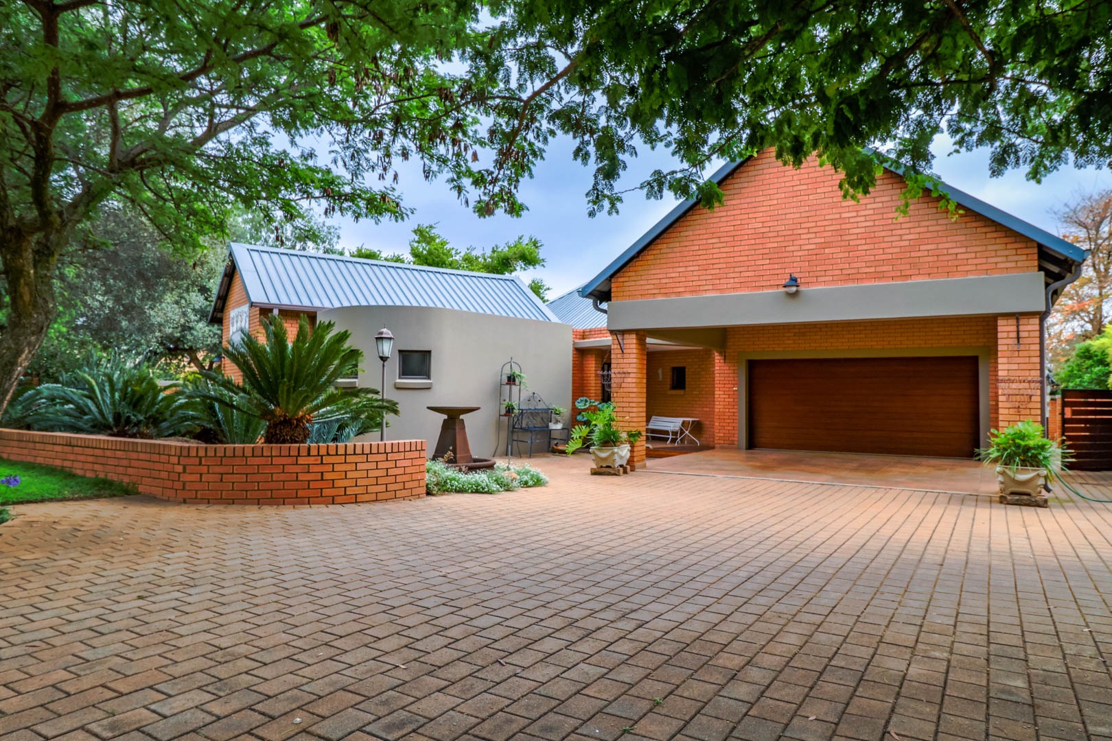 The home immediately impresses with its strong kerb appeal, featuring a charming brick exterior partially framed by a lush, well-maintained garden with mature trees and structured landscaping. A spacious paved driveway leads to an attached double garage with double carport.
