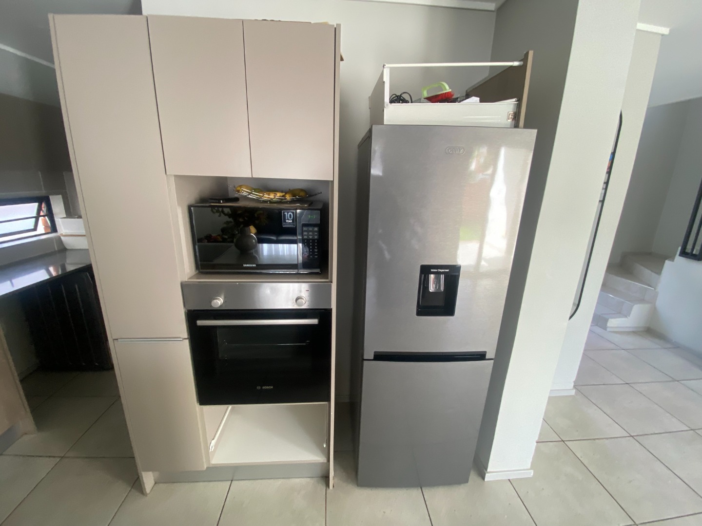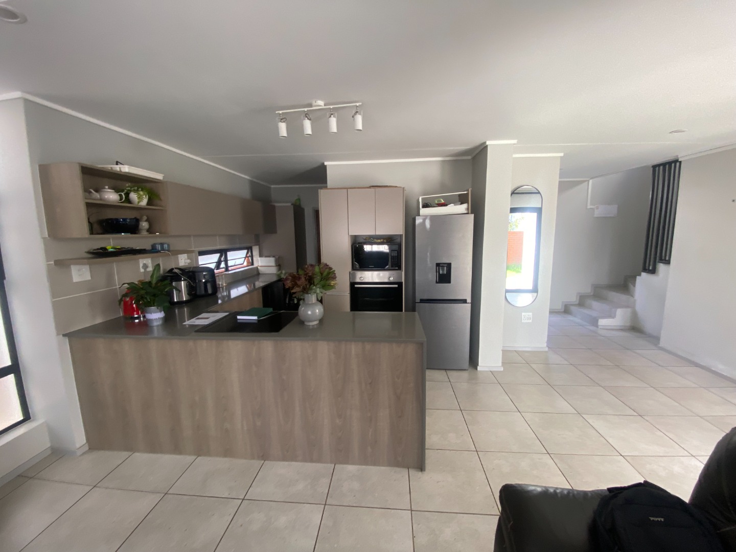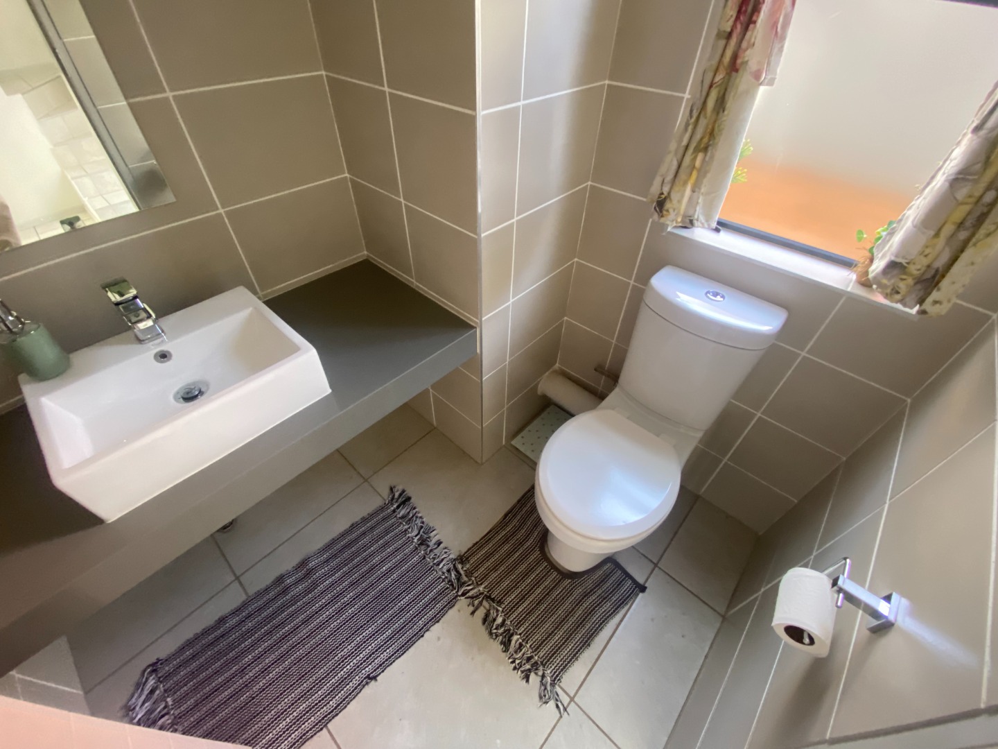 On the ground floor is the open plan kitchen with many cupboards with granite tops, breakfast nook, double sink basin, electric oven and hob, and washing machine - and dishwasher outlets. The spacious open plan lounge / dining area walks out onto the covered patio with built-in braai and small garden area. At the stairs there is a guest toilet with basin.